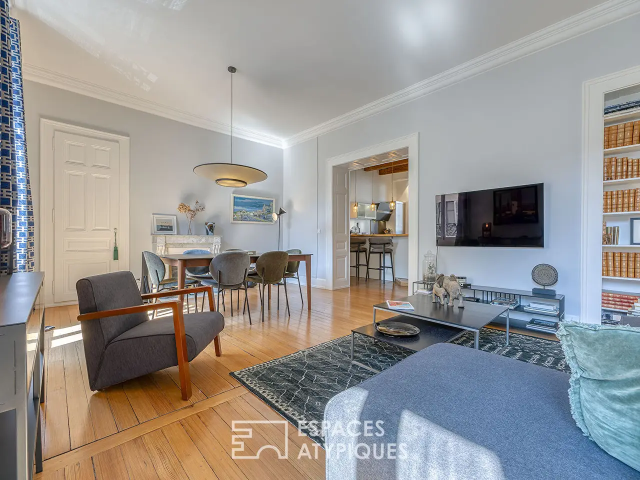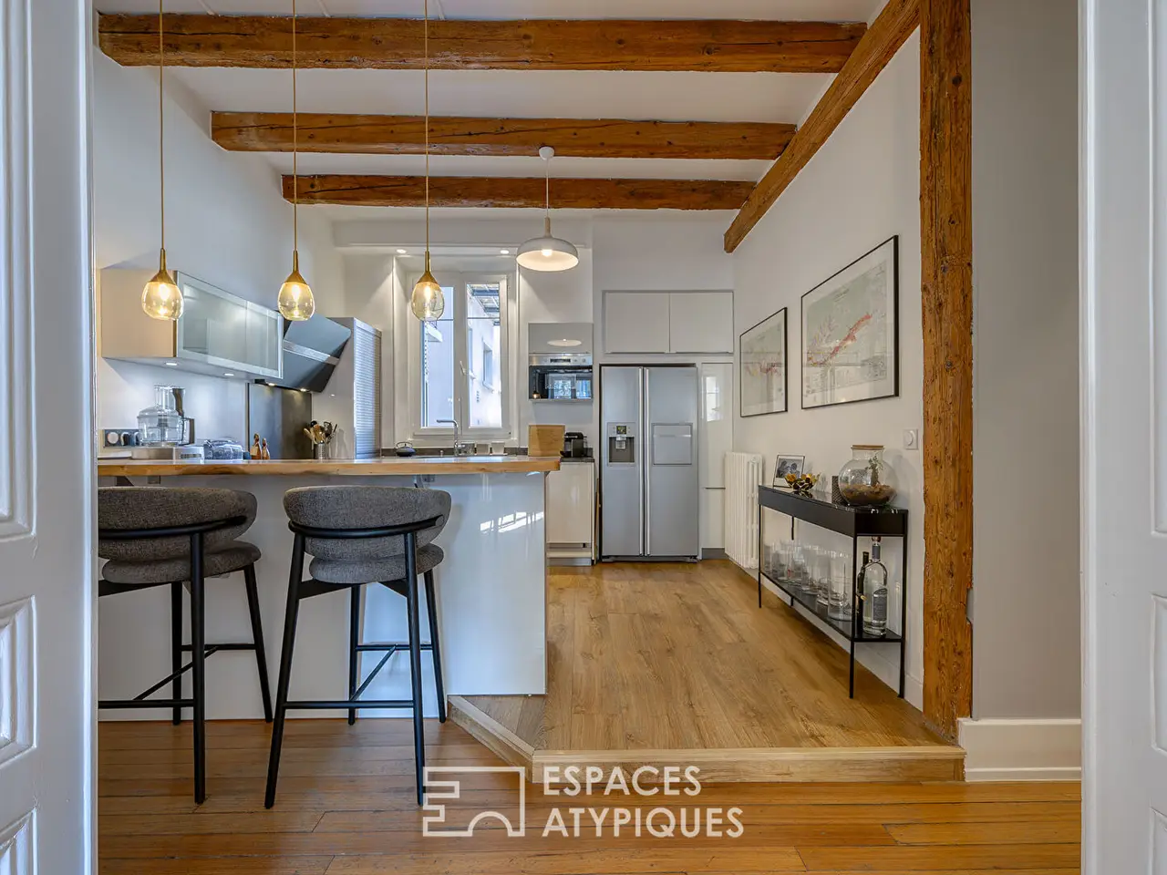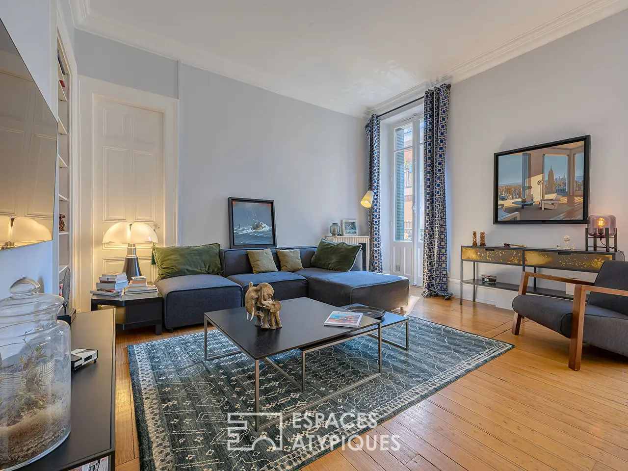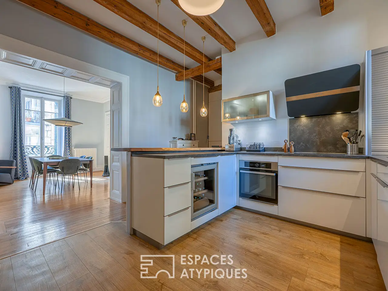 This beautiful Haussmann-style apartment of approximately 116 m² (Carrez Law) is located in the heart of Annecy, on the first floor of a condominium building. This high-quality renovation benefits from generous volumes highlighted by a functional layout. The combination of materials, antique and contemporary elements, makes this apartment a unique place, full of charm, enhanced by beautiful light. The high ceilings, marble fireplaces, exposed moldings, and solid parquet floors are the centerpieces. The entrance hall, with its hallway, separates the living space. It leads to the approximately 31 m² living room and the fully equipped and fitted open kitchen. The living area consists of a charming living room and a dining room with a beautiful marble fireplace and solid parquet flooring. Two large windows and a balcony allow natural light to flood in from all angles. Tastefully chosen designer decor completes this apartment's amenities. An open kitchen invites conviviality with its contemporary lines. A hallway leads to the sleeping area. The latter consists of three bedrooms, including the master bedroom with a generous volume of approximately 23 m². Two of them also have a private balcony. A bathroom with a shower, sinks, and storage completes this space. A cellar completes the features of this beautiful Haussmann-style apartment. Lovers of the city center, high-quality amenities, and spacious, bright spaces will be delighted by this undeniably charming property located in the heart of Annecy. Close to shops, schools, and public transport. A stone's throw from the lake. Possibility of renting out a garage for an additional fee (€200/month). ENERGY CLASS: D / CLIMATE CLASS: D Estimated average annual energy costs for standard use, based on energy prices for 2021, 2022, and 2023: between €2,130 and €2,920. Information on the risks to which this property is exposed is available on the Georisques website for the affected areas: www.georisques.gouv.fr. REF. 2016EA Additional Information * 4 rooms * 3 bedrooms * 1 bathroom * Floor: 1 * 5 floors in the building * 16 condominium units * Annual charges: €3,200 * Property tax: €1,500 * Procedures in progress: No Energy performance audits Primary energy consumption d: 227 kWh/m²/year Extremely efficient housing