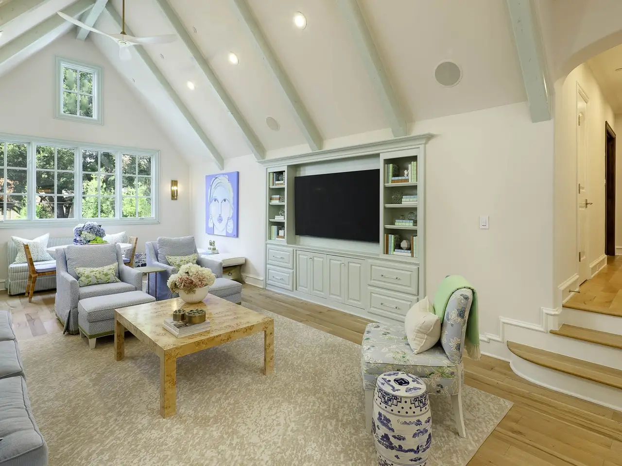 Vaulted primary suite with serene backyard views