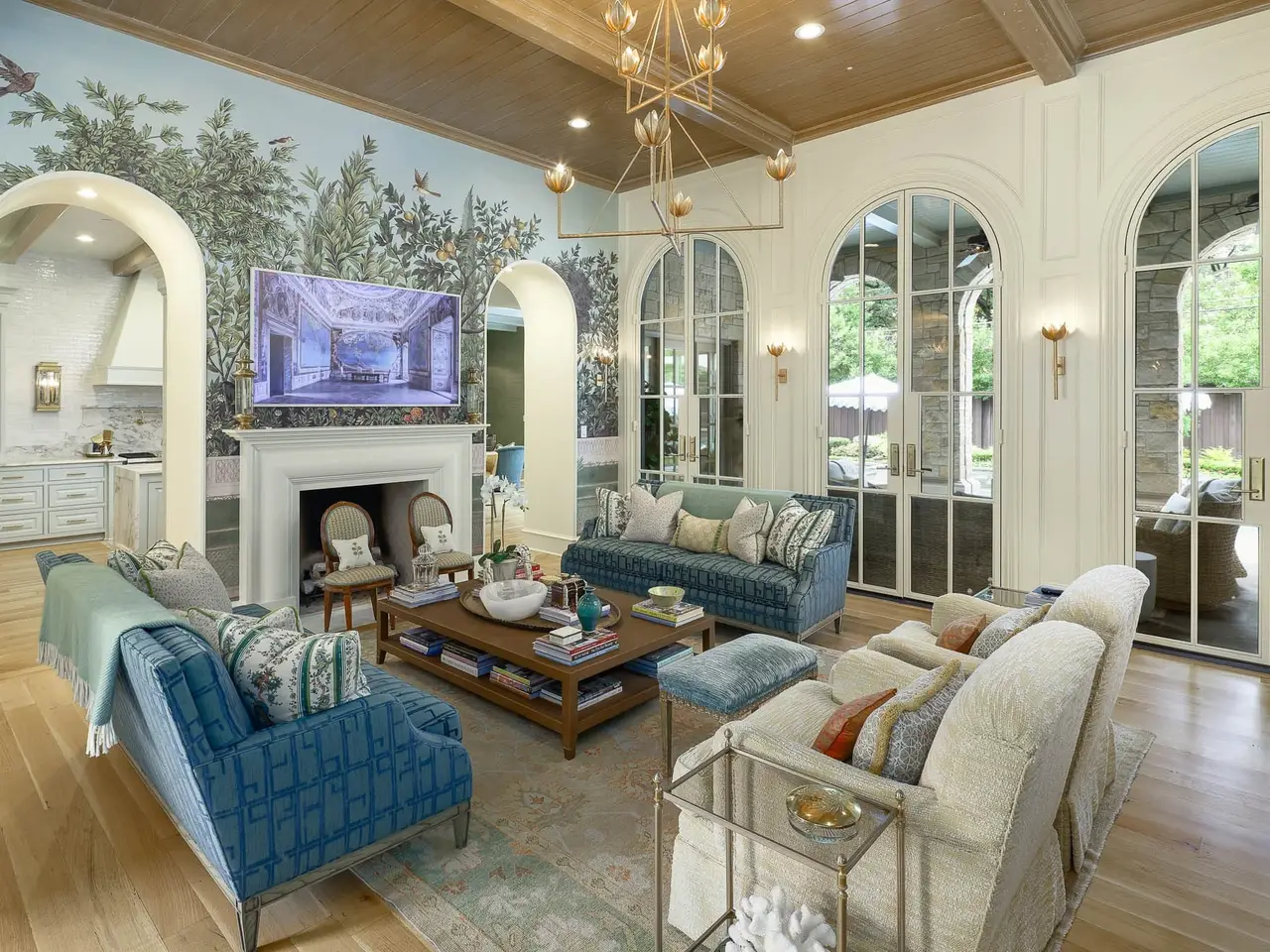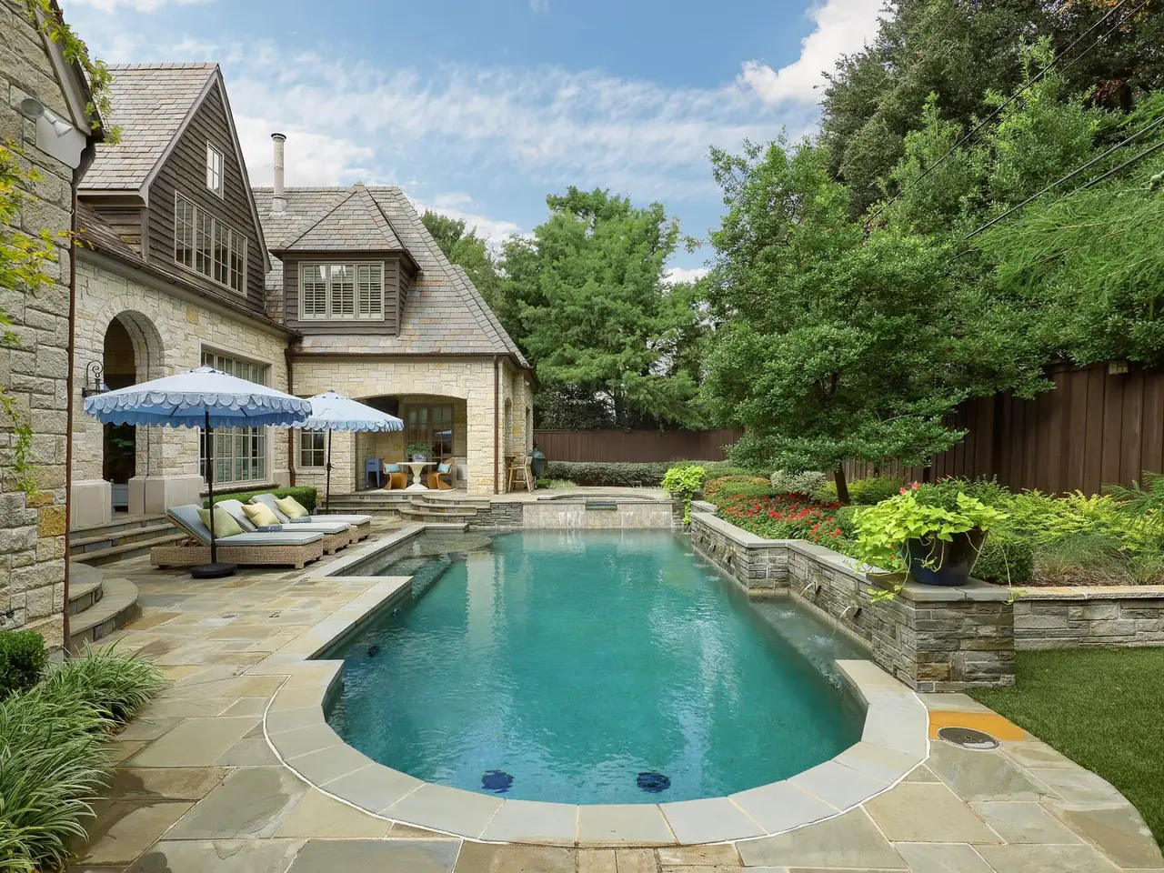 This French-inspired custom home by Allen Nixon is a standout in Preston Hollow, showcasing the highest-quality designer finishes throughout. A timeless stone exterior, slate roof, and copper gutters set the architectural tone, while the two-story foyer opens to a formal dining room with lacquered walls, a sweeping staircase, and a richly paneled library. The chef’s kitchen is equipped with premium appliances and opens to a stylish breakfast area with banquette seating and an inviting adjoining sitting room. The vaulted primary suite is conveniently located on the main level with serene views of the manicured backyard and pool. Upstairs, you’ll find three additional en-suite bedrooms, a seven-seat theater, and a vaulted game room with an adjacent gym. Outdoor living is elevated with a resort-style pool and spa, screened-in porch with motorized screens, and a fully equipped summer kitchen. A three-car garage and elevator-ready design complete this exceptional offering, perfectly suited for multi-generational living.