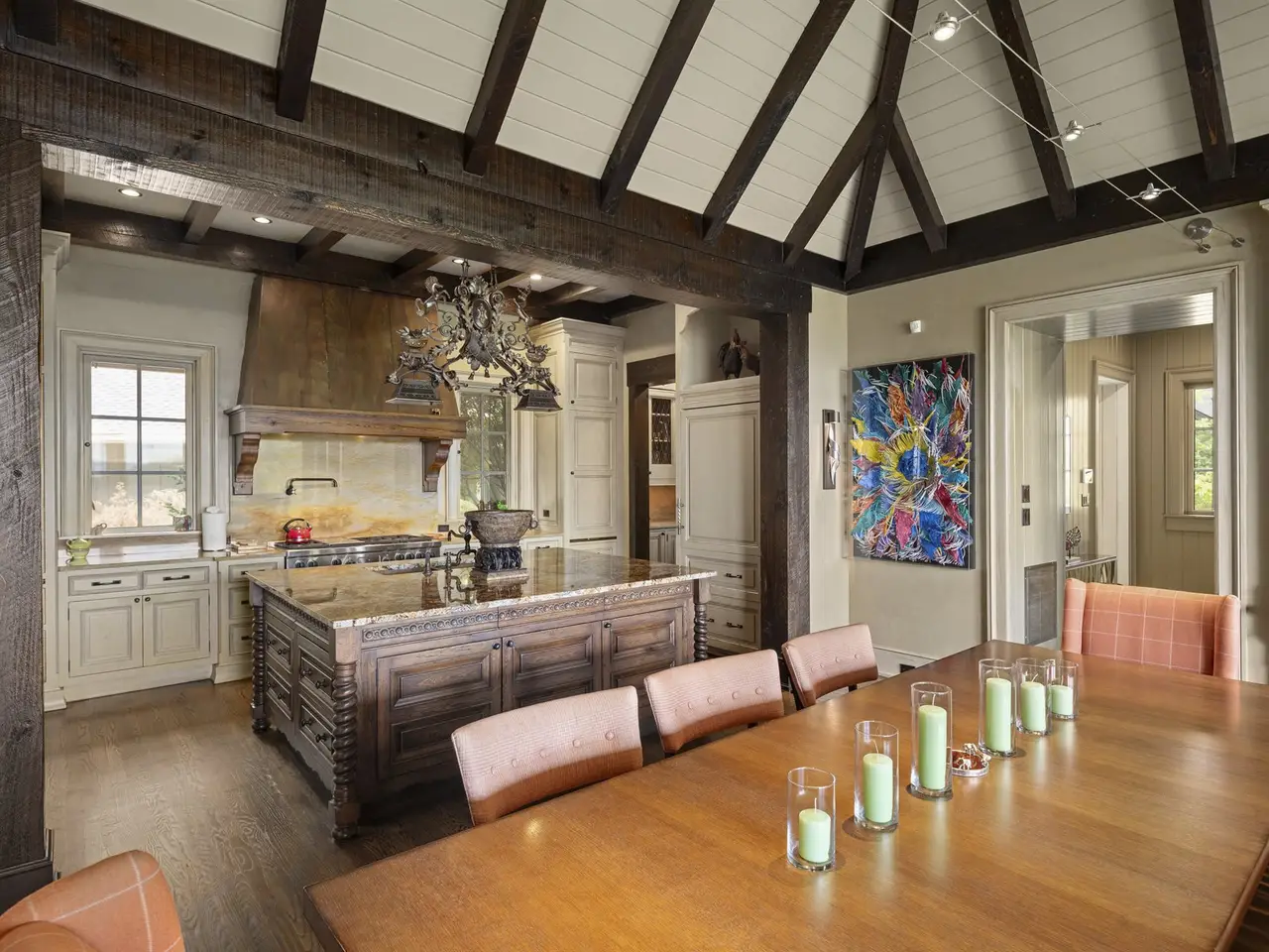 - Two-story beamed ceilings and clerestory windows