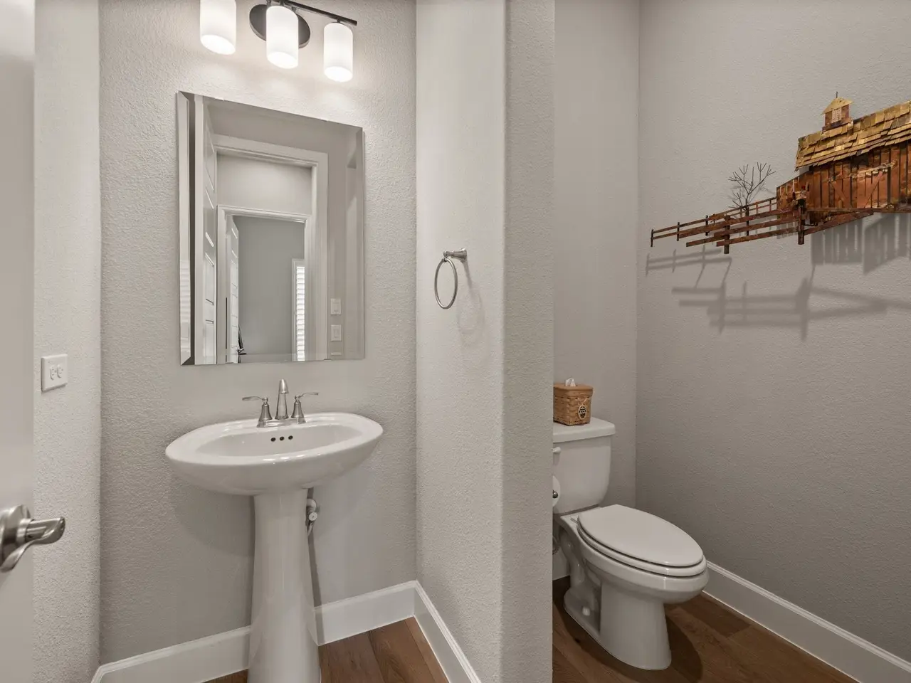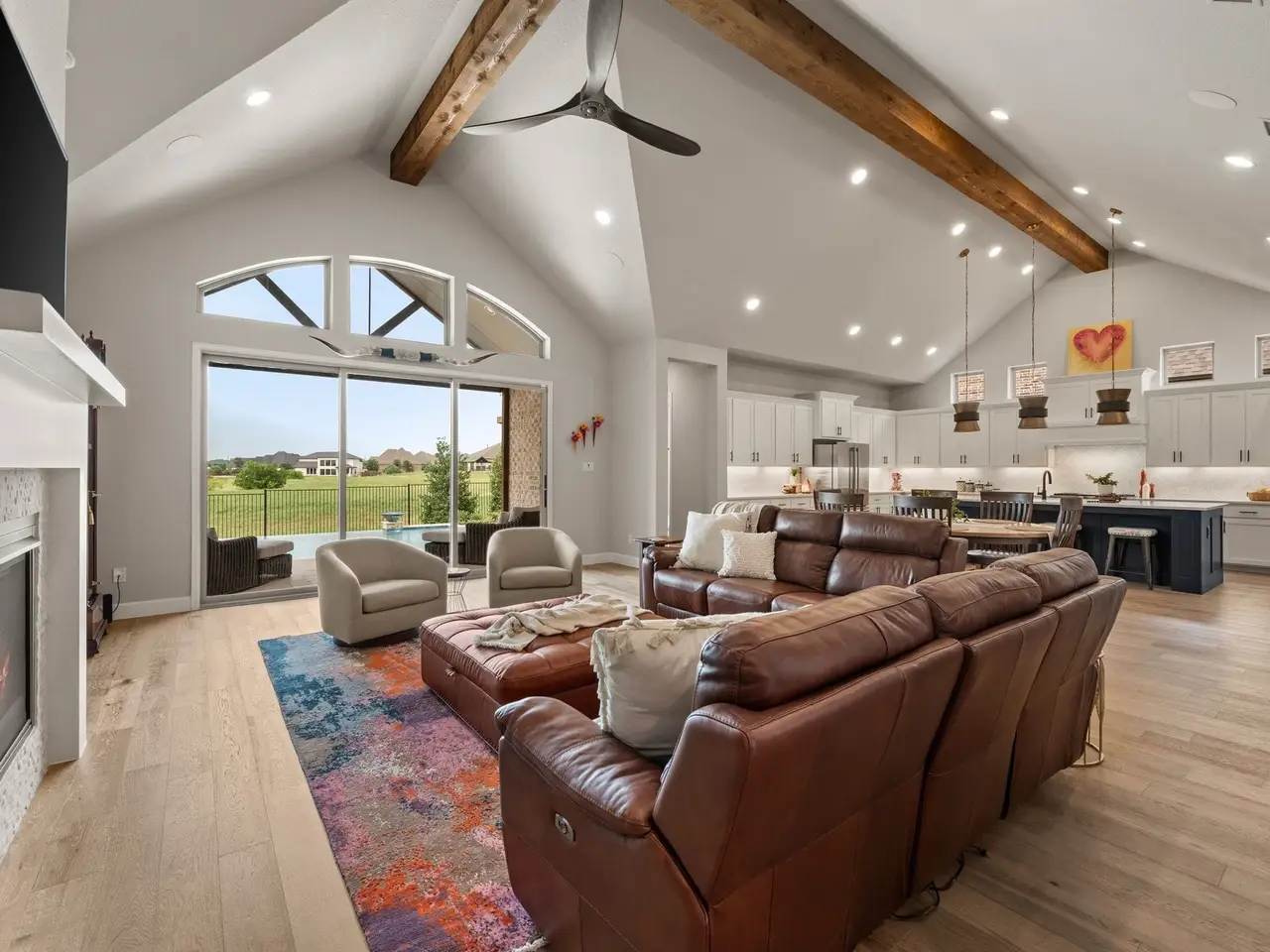 Impeccably maintained single-story with all the right spaces! Four bedrms in a 3-way split layout. The primary BR offers a beautiful view of the pool & greenbelt behind the home! All bedrms feature en-suite baths, plus there's a half bath off the front foyer! The massive, open concept family room-breakfast room-kitchen will impress! Here you will find a beamed ceiling spanning the area, gas fplc & sliding doors to the covered patio with remote drop screen. The spacious kitchen offers tons of quartz counterspace, white perimeter cabinets, center island painted a contrasting blue, gold hardware, designer pendant lighting, gas range, dbl ovens + a butlery area with wine cooler. In addition, there is a 2nd liv-flex space currently outfitted as a gym with rubber flrs, but there is white oak flooring underneath! The home office is just off the main foyer & offers French doors for privacy. This home is better than new with many upgrades: ALL white oak wood floors except tile baths, plantation shutters, upgraded gold cabinet pulls, HALO whole-house water filtration & more! Premium Claffey pool: dramatic infinity edge, play depth, raised spa, travertine pool deck, tanning ledge with umbrella, fire & water bowls! The detached cabana features a gas fireplace, cantilevered remote awning that projects out for extra shade, granite bar, Hestan grill & True beverage fridge. 3-car tandem garage with epoxy floors! Lush front landscape (HOA mows the front yard only). The north-facing backyard overlooks the greenbelt & offers low maintenance landscaping & spectacular sunsets! The community as many amenities, incl the Canyon Falls park & playground!