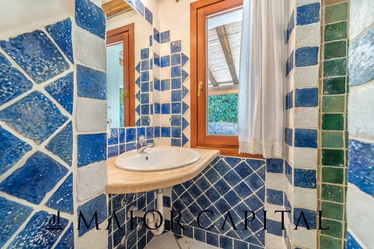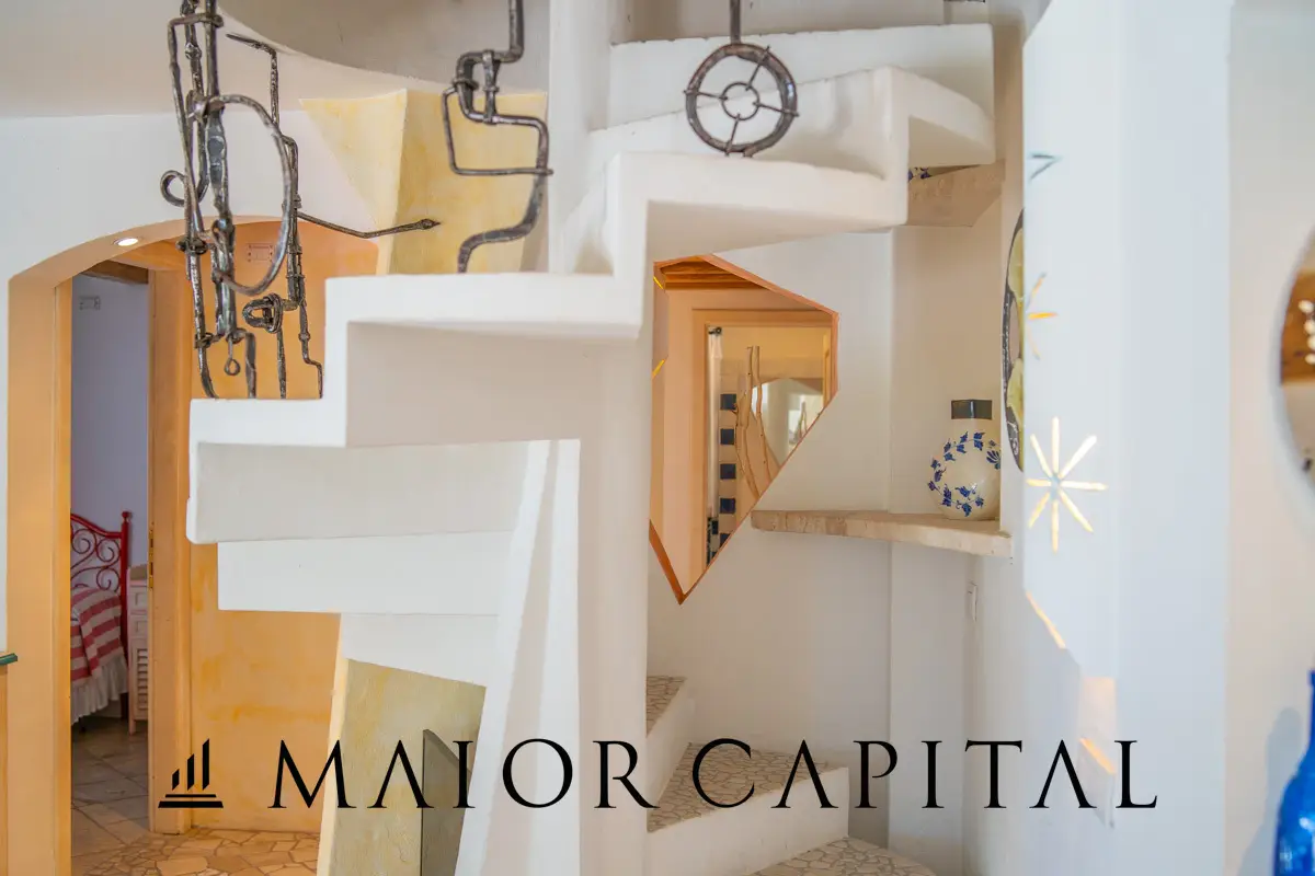 Inside, the villa features handcrafted commissioned finishes and furniture details that make it unique and elegant. Each room is distinguished by a different detail, such as the granite fireplace, the wrought iron and juniper staircase recalling Sardinian tradition, or the emerald-green Cera Sarda bathroom with starfish recalling sea life.