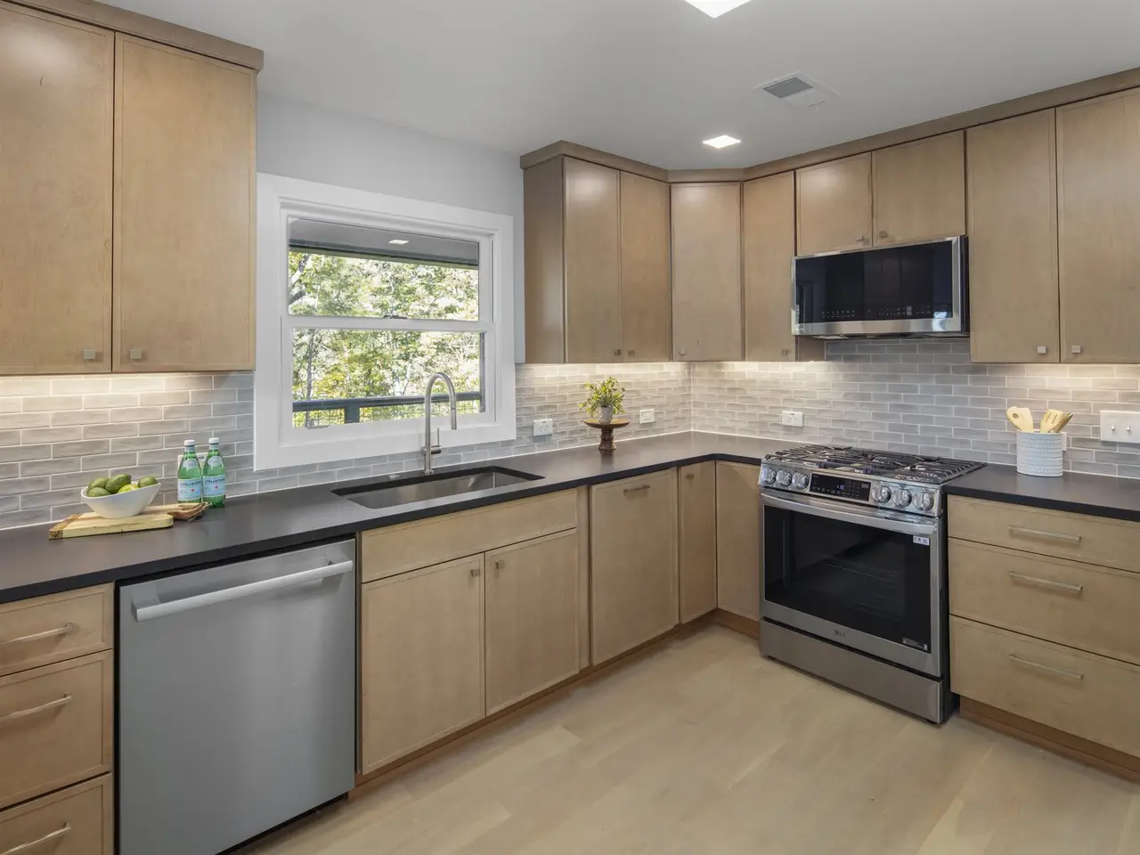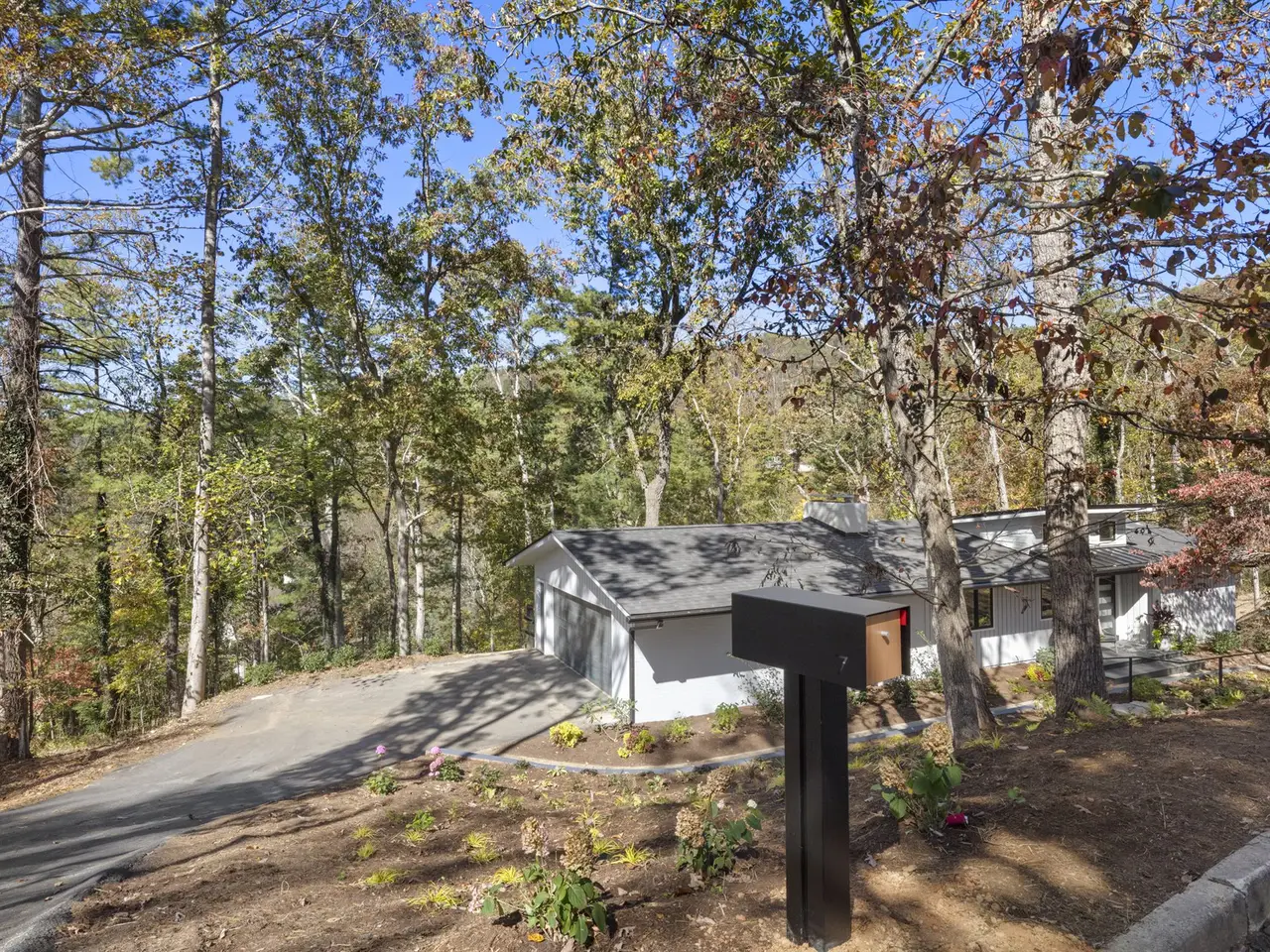 Modern luxury awaits in this meticulously renovated home nestled in peaceful Kimberly Woods. Originally built in the 1960s, this North Asheville gem has been completely reimagined to offer the sophistication and comfort of today's finest homes - at a value you won't find anywhere else in the area. Behind a sleek five-panel mid-century door, a sun-washed foyer with soaring ceilings and skylights hint at the contemporary style awaiting further inside. To your right, a formal sitting and dining room offers an elegant setting for gatherings. The sleek kitchen is a showstopper, featuring brand-new cabinetry, Corian countertops, stainless steel appliances, and a charming breakfast nook that's perfect for morning coffee or casual meals. Rounding out the main level, a comfortable living room centers around an original brick, wood-burning fireplace, creating the perfect place to unwind with a good book. Retreat to the terrace level and discover a true sense of privacy and calm. Here, the primary suite impresses with a sophisticated ensuite, joined by two inviting guest rooms and a versatile den ideal for movie nights or creative pursuits. Enjoy the outdoors with a versatile outdoor living space, featuring dual-level decks with mountain views, a stone patio perfect for a fire pit, and a gently contoured yard enveloped by mature trees. Just minutes from downtown Asheville, this home skillfully balances quiet neighborhood charm with easy access to renowned restaurants and shopping.