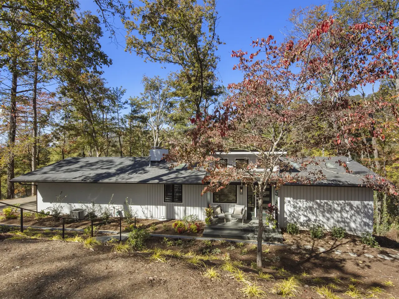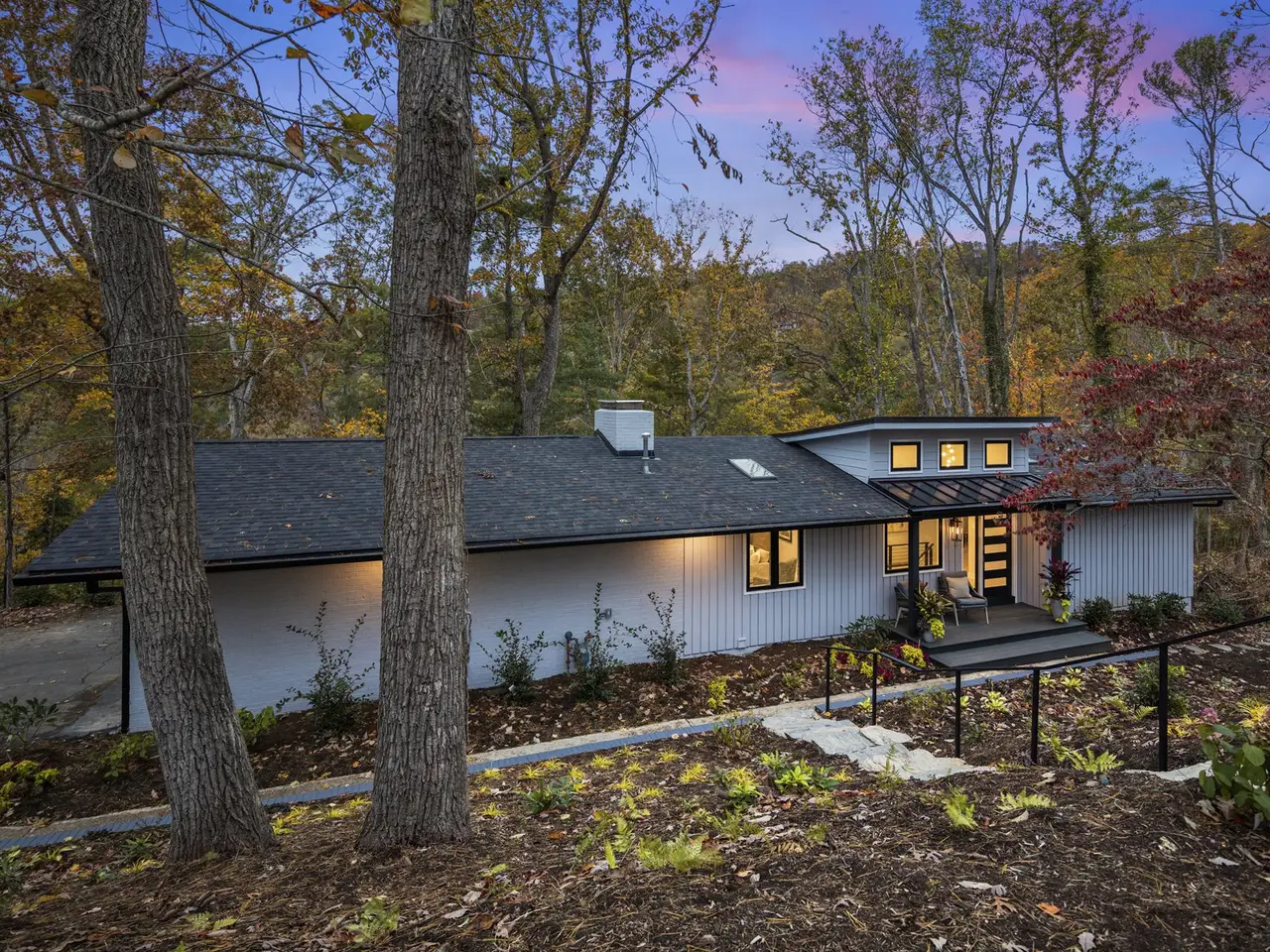 Modern luxury awaits in this meticulously renovated home nestled in peaceful Kimberly Woods. Originally built in the 1960s, this North Asheville gem has been completely reimagined to offer the sophistication and comfort of today's finest homes?at a value you won't find anywhere else in the area. Behind a sleek five-panel mid-century door, a sun-washed foyer with soaring ceilings and skylights hint at the contemporary style awaiting further inside. To your right, a formal sitting and dining room offers an elegant setting for gatherings. The sleek kitchen is a showstopper, featuring brand-new cabinetry, Corian countertops, stainless steel appliances, and a charming breakfast nook that's perfect for morning coffee or casual meals. Rounding out the main level, a comfortable living room centers around an original brick, wood-burning fireplace, creating the perfect place to unwind with a good book. Retreat to the terrace level and discover a true sense of privacy and calm. Here, the primary suite impresses with a sophisticated ensuite, joined by two inviting guest rooms and a versatile den ideal for movie nights or creative pursuits. Enjoy the outdoors with a versatile outdoor living space, featuring dual-level decks with mountain views, a stone patio perfect for a fire pit, and a gently contoured yard enveloped by mature trees. Just minutes from downtown Asheville, this home skillfully balances quiet neighborhood charm with easy access to renowned restaurants and shopping.