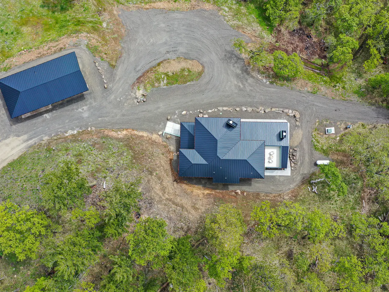Stunning new contemporary home with mountain views on 20+ private acres! Interior highlights include natural hickory and maple hardwood floors and steps; porcelain tile in kitchen, bathrooms and great room, granite countertops; washer and dryer in upstairs primary bedroom closet and connections for a second set up downstairs, windows wired for electric blinds or shades, beautiful stone fireplace all the way to the ceiling, all Dacor appliances. The exterior has stucco siding, and a metal roof on both the main house and detached garage. The oversized garage has enough space for 2 cars plus a shop area with ample lighting, EV charging outlet, and a heated full bathroom. The garage also has an attached 2 car carport. The covered patio boasts an outdoor fireplace and the upstairs balcony off of the primary bedroom is a perfect place to accommodate a hot tub and enjoy the views. There is also a 200 amp service to the home and an additional 200 amp service for future construction.