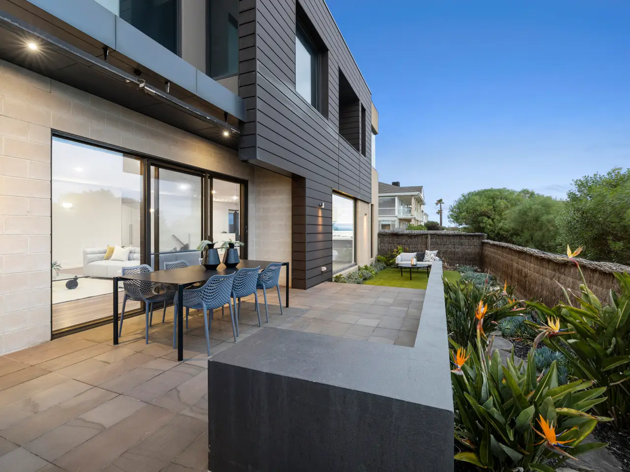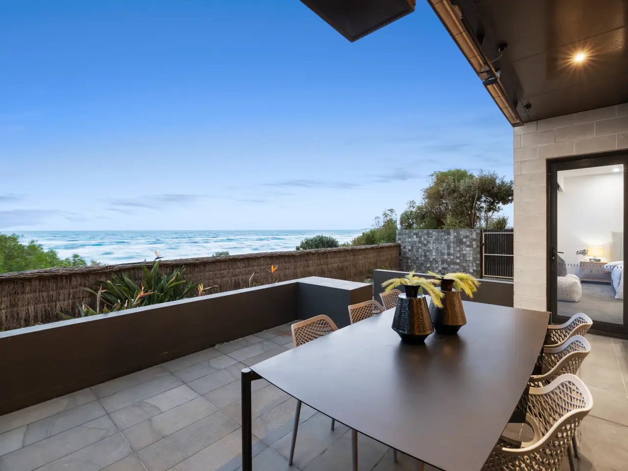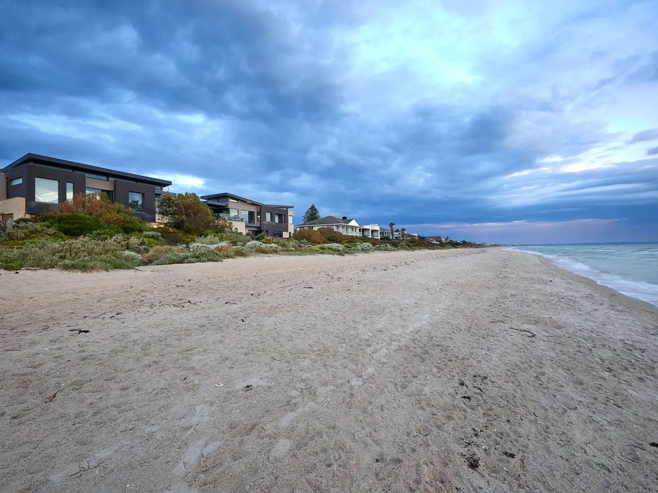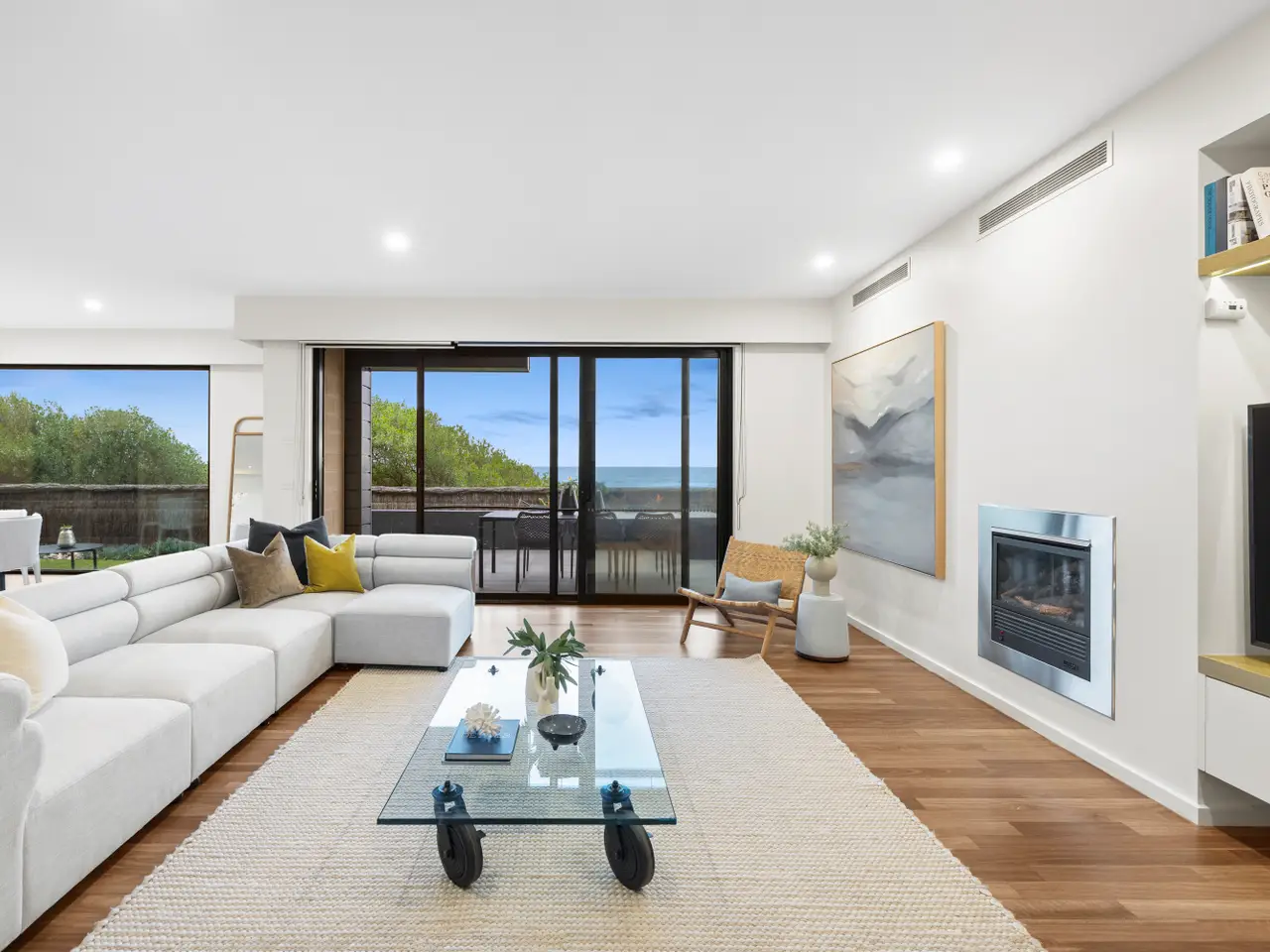 Absolute beachfront living at its finest! Overlooking one of Aspendale's most stunning stretches of sand, this 4-bedroom, 2.5-bathroom dual living sanctuary is one of a rare few residences that call this exclusive beachside grove home. Perched upon the sand dunes and graced with your own private entrance, this haven invites you to step past the garden foyer and discover an expansive sanctuary with spectacular views sweeping across Port Phillip Bay. Large picture windows capture the crystal-blue water and golden sunset views at every turn. Whether cooking up a feast in the modern well-equipped Miele kitchen, entertaining on the beachfront alfresco or curled up in front of the gas log fireplace in the living zone – you'll love the ever-changing seascape as your daily backdrop. A large second living room adds to the appeal, as does the double basement parking with direct internal access. Accommodation is generous with four bedrooms and two bathrooms. The bay-facing master retreat enjoys a resort-style ensuite, walk-in robe and alfresco access, while a luxurious bathroom, powder room and three additional bedrooms will cater for family or guests. You'll delight in the ease of walk-in showers to both bathrooms and the elegant sophistication of refreshed timber flooring, bespoke cabinetry and stone surfaces. Double-glazing, video intercom, CCTV, an alarm, zoned heating and cooling, CCTV and parking for visitors complete this beachfront beauty. Walk to the train station and local cafes, and enjoy the lifestyle convenience of Mordialloc's vibrant fine dining, shopping and local schools just minutes away.