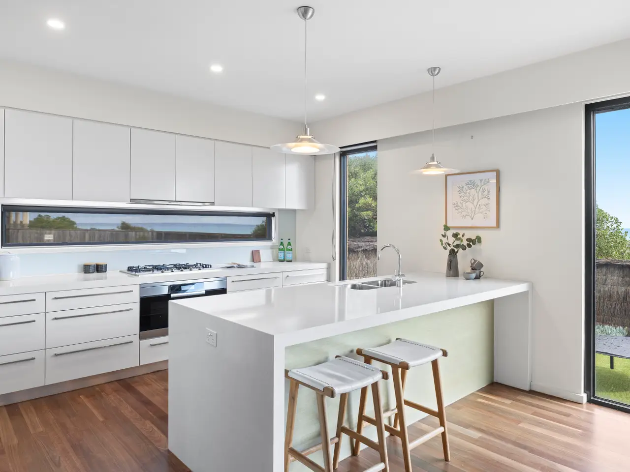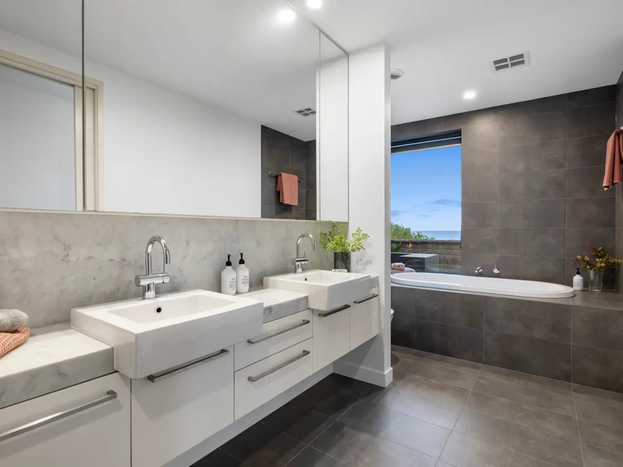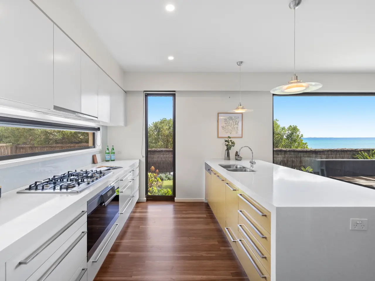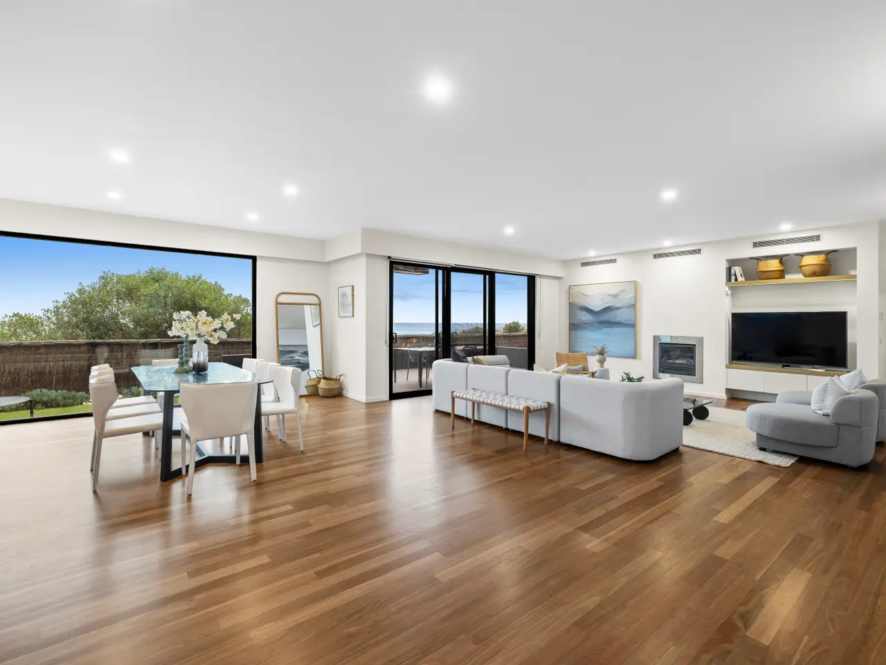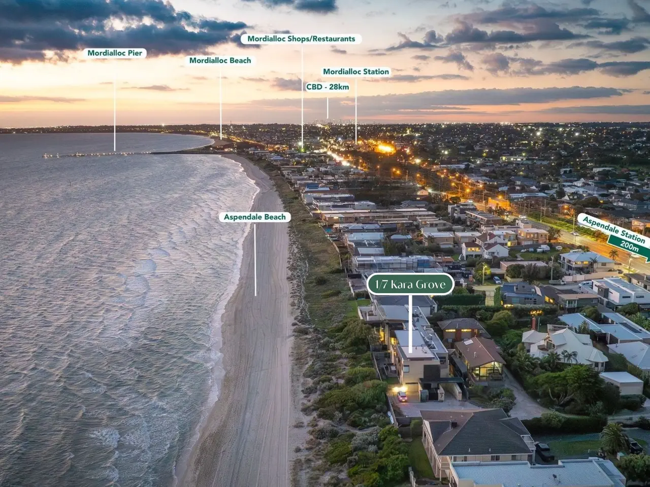 Absolute beachfront living at its finest! Overlooking one of Aspendale's most stunning stretches of sand, this 4-bedroom, 2.5-bathroom dual living sanctuary is one of a rare few residences that call this exclusive beachside grove home. Perched upon the sand dunes and graced with your own private entrance, this haven invites you to step past the garden foyer and discover an expansive sanctuary with spectacular views sweeping across Port Phillip Bay. Large picture windows capture the crystal-blue water and golden sunset views at every turn. Whether cooking up a feast in the modern well-equipped Miele kitchen, entertaining on the beachfront alfresco or curled up in front of the gas log fireplace in the living zone – you'll love the ever-changing seascape as your daily backdrop. A large second living room adds to the appeal, as does the double basement parking with direct internal access. Accommodation is generous with four bedrooms and two bathrooms. The bay-facing master retreat enjoys a resort-style ensuite, walk-in robe and alfresco access, while a luxurious bathroom, powder room and three additional bedrooms will cater for family or guests. You'll delight in the ease of walk-in showers to both bathrooms and the elegant sophistication of refreshed timber flooring, bespoke cabinetry and stone surfaces. Double-glazing, video intercom, CCTV, an alarm, zoned heating and cooling, CCTV and parking for visitors complete this beachfront beauty. Walk to the train station and local cafes, and enjoy the lifestyle convenience of Mordialloc's vibrant fine dining, shopping and local schools just minutes away.