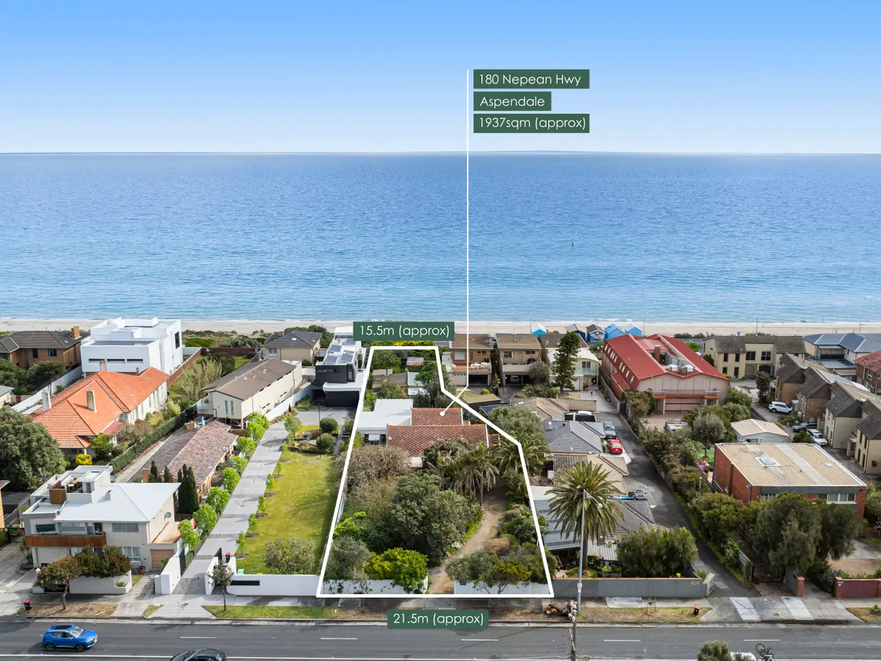 Nestled upon one of the bay's most beautiful beaches, this much-loved family home of 40+ years offers an extraordinary opportunity to secure approximately 1,937 sqm of absolute beachfront bliss. Located just 350 metres from Aspendale Village and with private gate access to pristine stretches of sand, this exclusive lifestyle location is as exceptional as this tightly held parcel of prime land. Boasting an approximate 15.5-metre frontage to Aspendale Beach, and 22-metre frontage to the Nepean Highway, an array of exciting possibilities await. Explore the glorious bay view and development potential, build your contemporary coastal masterpiece or realise the existing home's captivating charm with renovation (STCA). Believed to be one of Aspendale's original holiday homes predating the 1900s, the house features rich period detail, including timber wall panelling and soaring ornate ceilings. A generous layout includes four bedrooms, two bathrooms, an elaborate lounge room with an open fireplace, formal dining room, timber kitchen with meals, plus an additional sitting room. A kitchenette and third living area with outdoor access provides scope for multi-generational living, while expansive gardens and an artist's studio also feature. Superbly positioned just steps from Aspendale's local cafes, restaurants and shopping, plus minutes to Aspendale Primary School and St Louis de Monfort's Primary School. A five-minute stroll will have the children on the train to Mentone's private schools, as well as providing easy access to Mordialloc's upmarket restaurants and bars, Westfield Southland and the city.