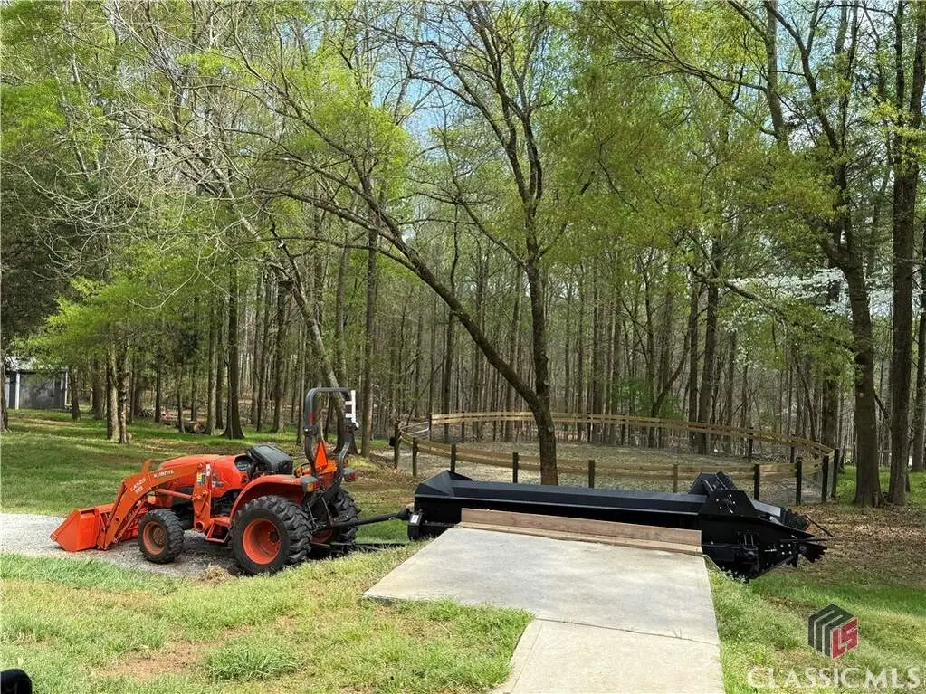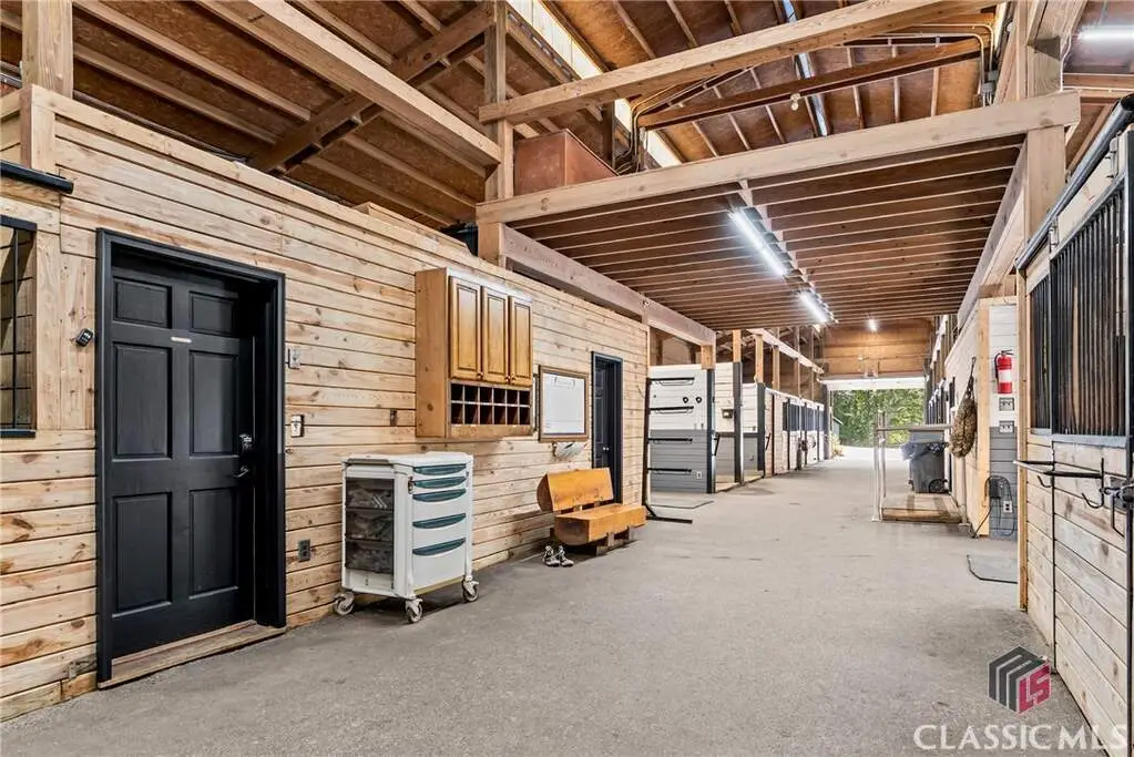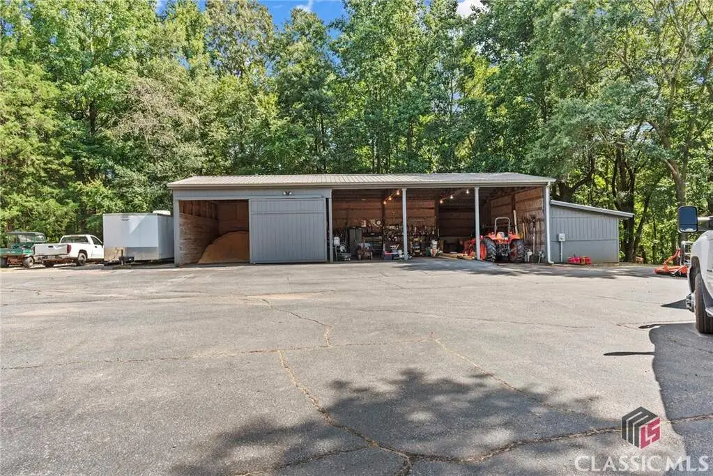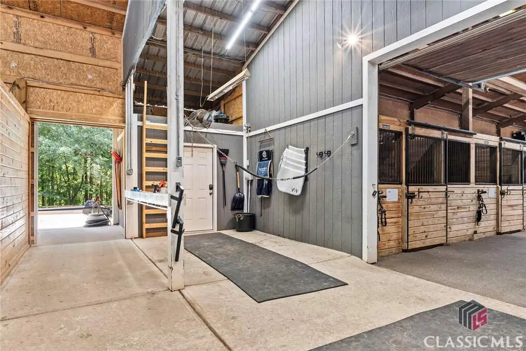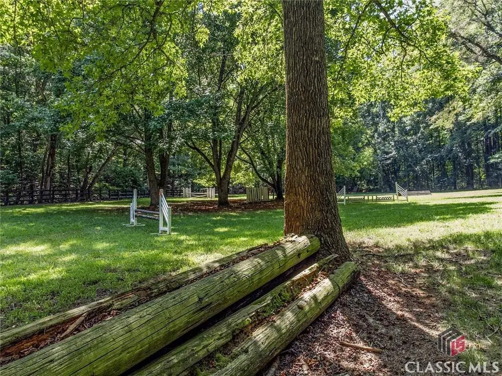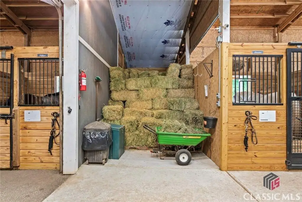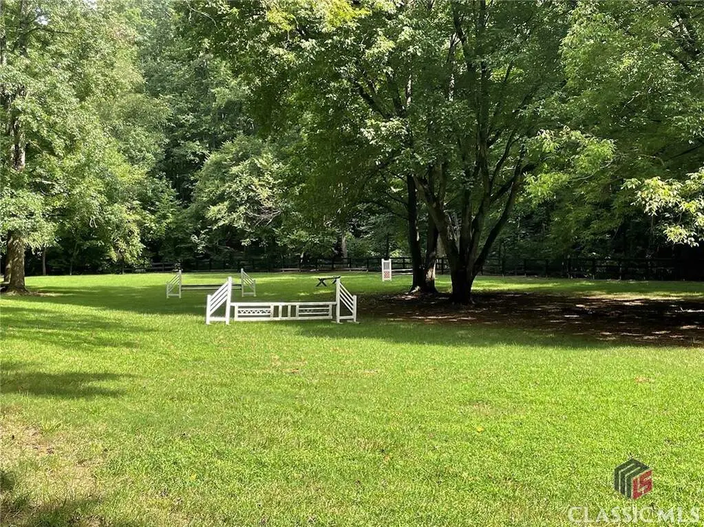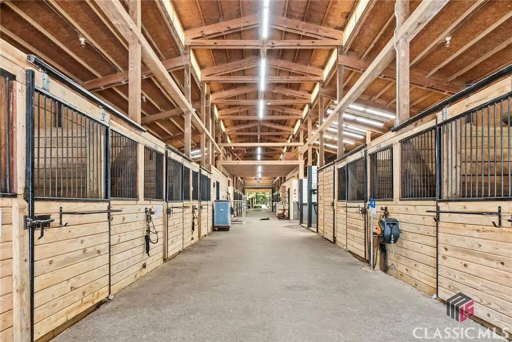 Just on the edge of Athens, GA, you'll find an equestrian estate so picturesque, and so thoughtfully laid out, it's like a retreat for both horses and humans. This 50 acre farm features 2 incredible homes and a recently expanded and updated BARN with 23 matted stalls, 3 tack rooms, a feed room, hay room w/exterior access, hot/cold wash racks, grooming bays, a drive-up farrier bay, laundry facilities, and a storage area for blankets and equipment - everything needed for the comfort of horses and their riders. Two additional stalls are separated from the main barn and are nicely set up for rehab, quarantine, or other special needs. Adjoining the stables, you'll find a 106' x 210' ARENA that's fully irrigated and offers a premium blend of M10, fiber, and rubber footing; a 50' mirrored wall, sound system, lovely hedge fence, and a viewing gazebo. Shade trees and lush landscaping surround the arena to create a riding environment that's as beautiful as it is functional. The arena's new LED lighting system and path lighting are just what you need when daylight hours are shorter, or to beat the summer heat with an early morning ride. There's also a 50' ROUND PEN just outside of the arena, and an RV pad with hookups right behind the barn. On the opposite end of the barn is a EQUIPMENT BARN with a workshop area, trailer parking, and enclosed storage for shavings. 15 large and lush PASTURES have water and run-in shelter or shade, and riders have access to more than 15 acres of BRIDLE PATHS that meander through the woods and along the year-round creek that flows through the property. The horse amenities are rounded out by a peaceful, grass JUMP FIELD along the banks of the creek, with shade trees and direct access to the extensive riding trails. When you're not out riding on this spectacular property, there are two inviting and architecturally interesting homes where you'll enjoy spending time. Nestled in a lush natural landscape