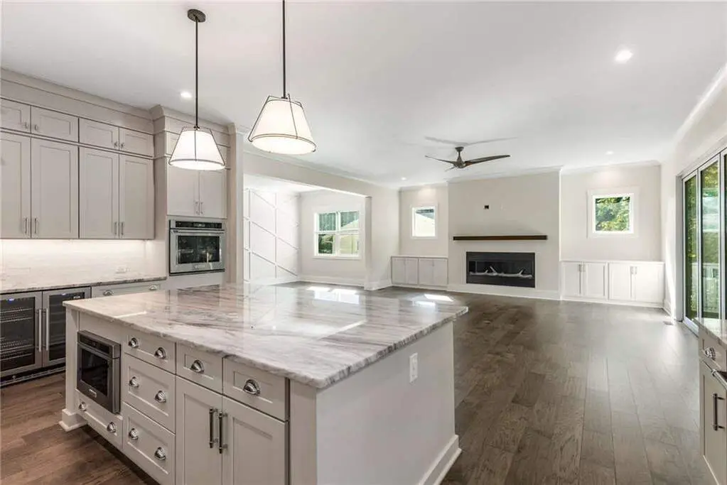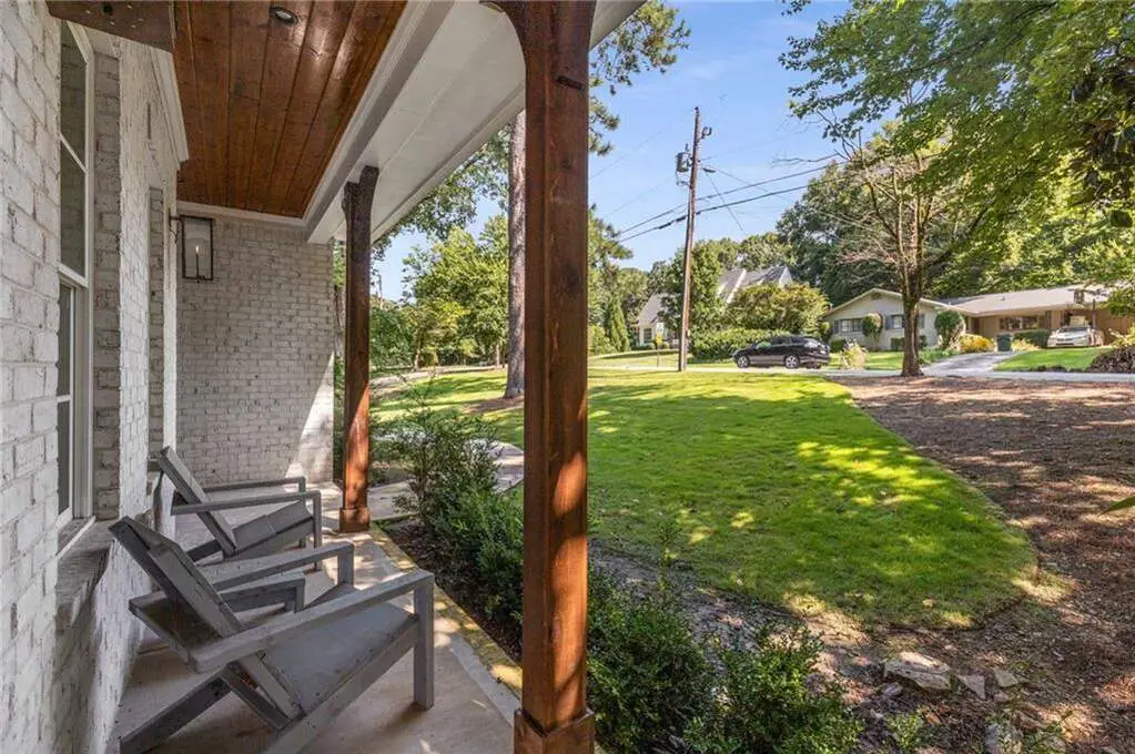Welcome to your Wildwood haven, a 2022 custom build tucked in the heart of Buckhead on a quiet cul-de-sac in one of the neighborhood's most beloved spots where neighbors wave and kids still play outside until the sun sets. The exterior charms with warm cedar accents, glowing Bevolo gas lanterns, a slate-gray metal roofline, elegant oval windows, and classic Bradford Hall Tudor brick. Inside, an airy foyer opens to a spacious living room with treetop views of the Buckhead forest, a sleek linear fireplace, and a 14-foot panoramic glass door that extends the living space to a stained and sealed deck lit for cozy evenings outdoors. The chef's kitchen features polished Brazilian marble counters, premium KitchenAid and Bosch appliances, a farmhouse sink, walk-in pantry, and custom mudroom nearby. A main-level guest suite with a marble bath offers privacy and comfort for visitors. Upstairs, four bedrooms include a Jack-and-Jill bath and a serene owner's retreat with dual closets, spa-like marble bath, dual shower heads, and a freestanding soaking tub. Smart home tech, an EV-ready garage, tankless water heater, two-zone HVAC, premium insulation, and thoughtful storage throughout make life as efficient as it is beautiful, move-in ready and perfectly Wildwood.