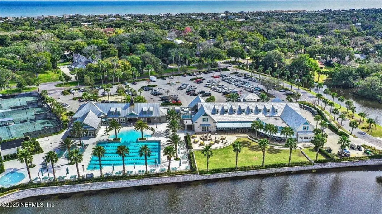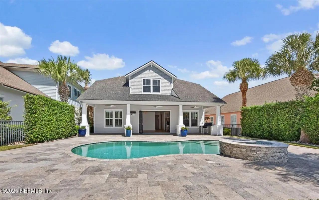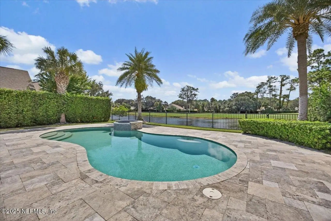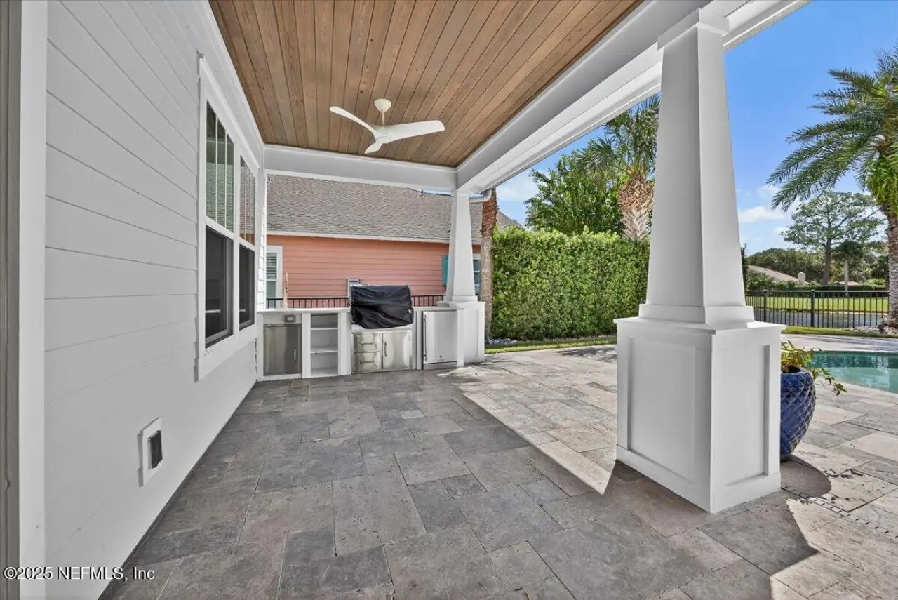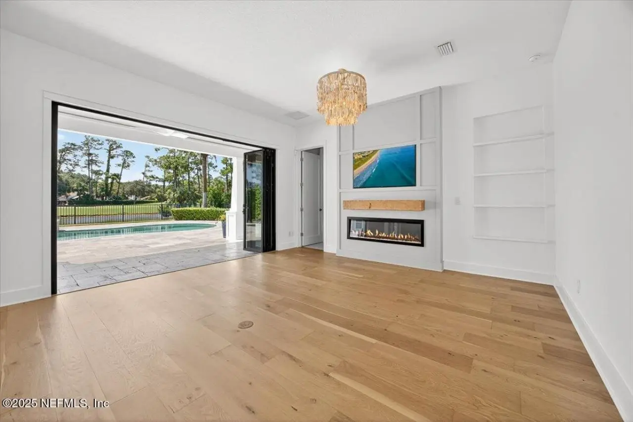 Welcome to your dream home in this exclusive updated & refreshed pool home nestled in prestigious Atlantic Beach Country Club. This home offers sweeping water to golf views, blending resort-style living w/everyday comfort. It is located minutes from the Atlantic Ocean, AB town center, A rated schools & parks. Charming exterior with front porch, very open concept w/high ceilings, 2 story foyer, wide plank natural tone wood throughout 1st floor ( just refinished ) , custom designer lighting & new fans, custom window treatments, (roman shades and plantation shutters), new glass door off family that fully opens to huge covered lanai with summer kitchen, freshly painted interior, including all cabinets and the island, re-surfaced pool and new tile surround. . Detail wood trim on many walls and some shelving,. Office with custom shelves, powder room, wine cooler laundry with stackable W & D and custom cabinets, spacious kitchen with large island, pantry, dining area, & family room .. with FP and TV wall with gorgeous linear gas fireplace & shelving ( all overlooking pool and water ) 1st floor primary with luxurious bath, oversized shower, soaking tub and large custom walk-in Closet. 2nd floor has a cozy loft & 3 bedrooms ,2 baths. ( 1 is ensuite ) . This home shows like new!