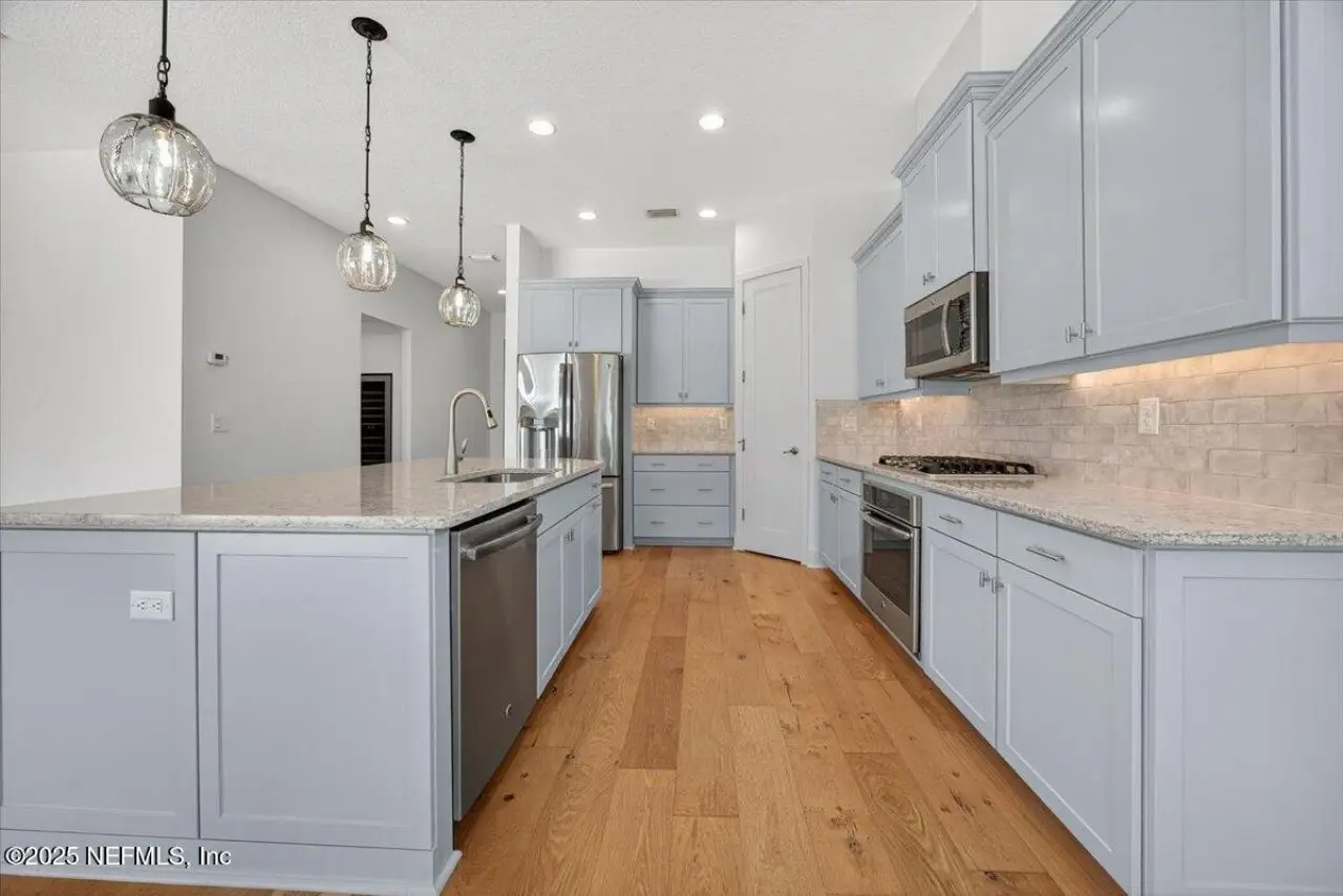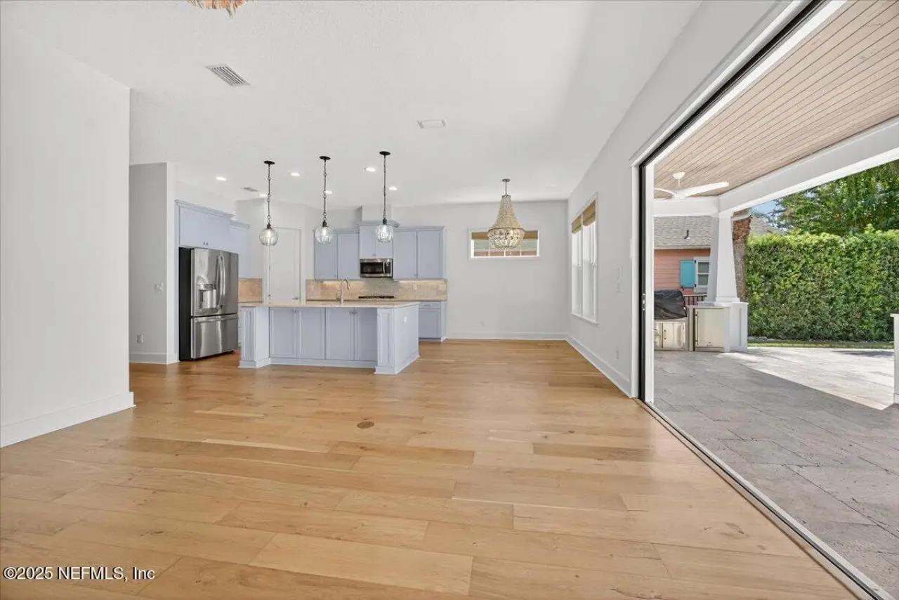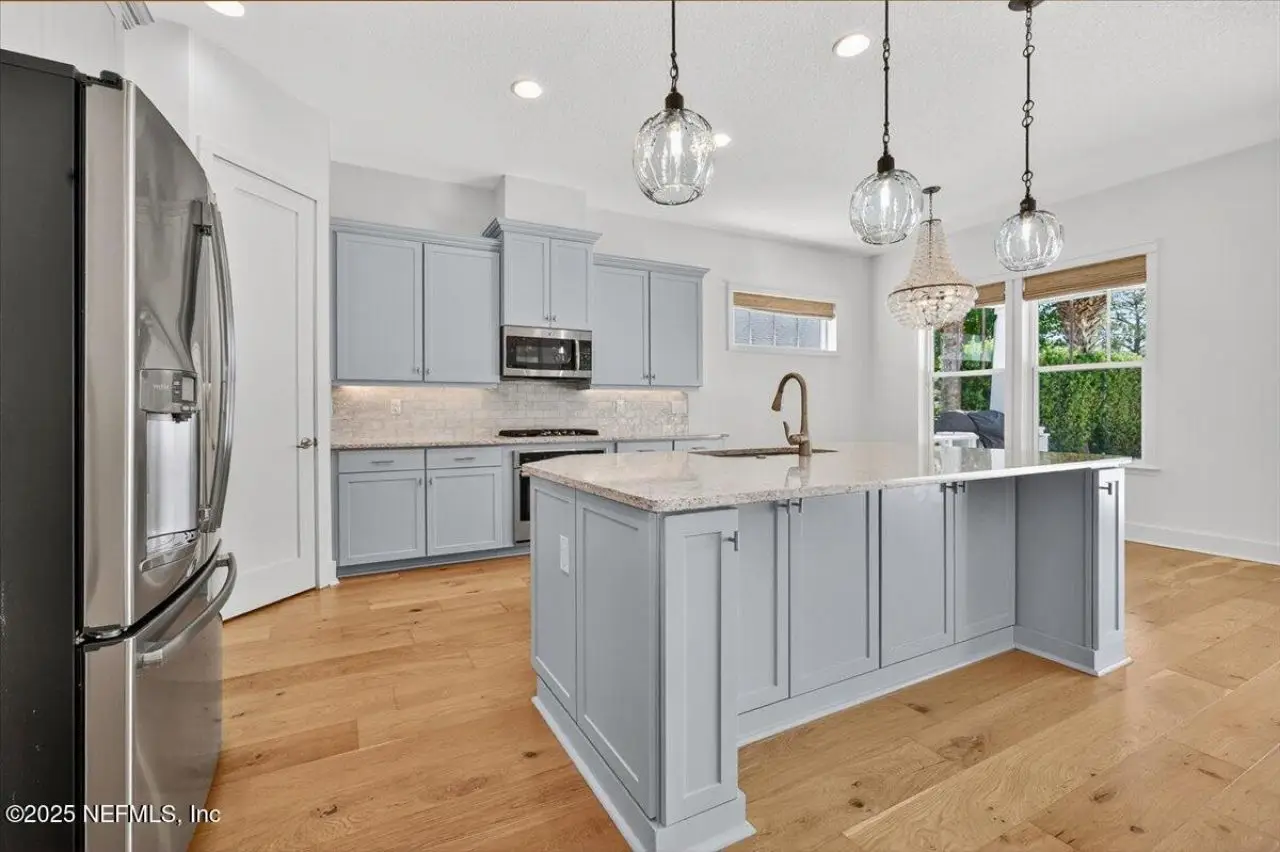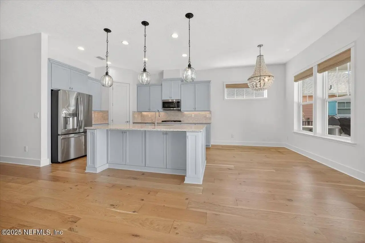 Welcome to your dream home in this exclusive updated & refreshed pool home nestled in prestigious Atlantic Beach Country Club. This home offers sweeping water to golf views, blending resort-style living w/everyday comfort. It is located minutes from the Atlantic Ocean, AB town center, A rated schools & parks. Charming exterior with front porch, very open concept w/high ceilings, 2 story foyer, wide plank natural tone wood throughout 1st floor ( just refinished ) , custom designer lighting & new fans, custom window treatments, (roman shades and plantation shutters), new glass door off family that fully opens to huge covered lanai with summer kitchen, freshly painted interior, including all cabinets and the island, re-surfaced pool and new tile surround. . Detail wood trim on many walls and some shelving,. Office with custom shelves, powder room, wine cooler laundry with stackable W & D and custom cabinets, spacious kitchen with large island, pantry, dining area, & family room .. with FP and TV wall with gorgeous linear gas fireplace & shelving ( all overlooking pool and water ) 1st floor primary with luxurious bath, oversized shower, soaking tub and large custom walk-in Closet. 2nd floor has a cozy loft & 3 bedrooms ,2 baths. ( 1 is ensuite ) . This home shows like new!