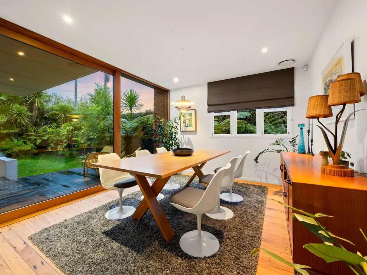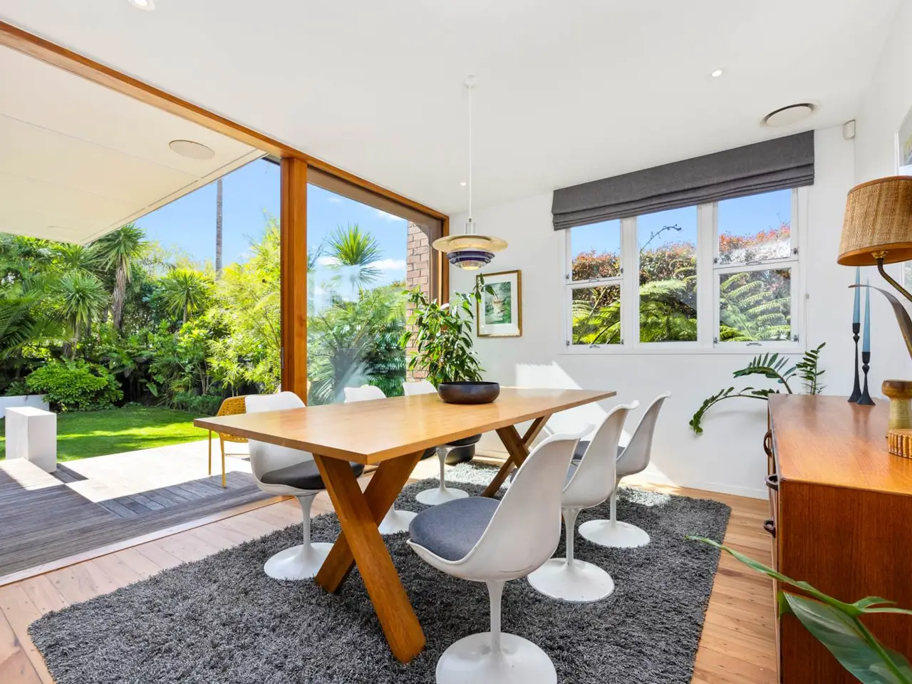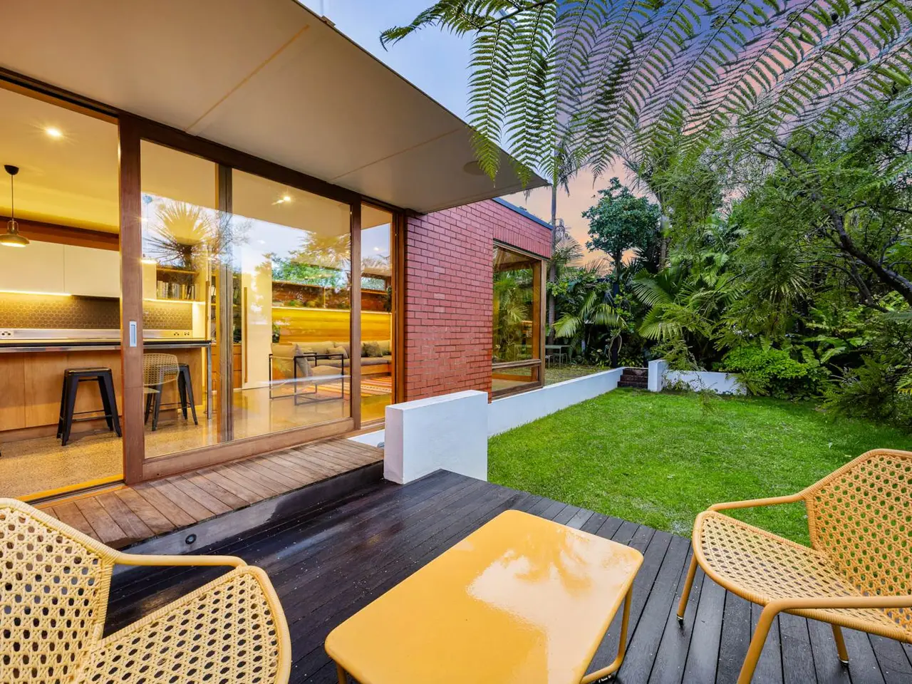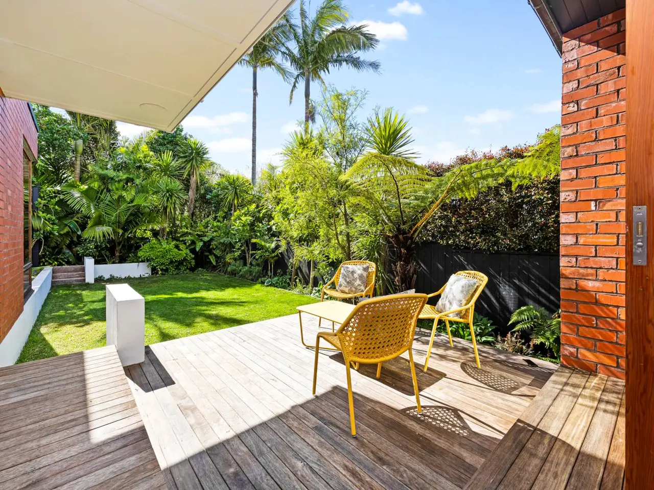 Sunlit deck overlooking private landscaped garden