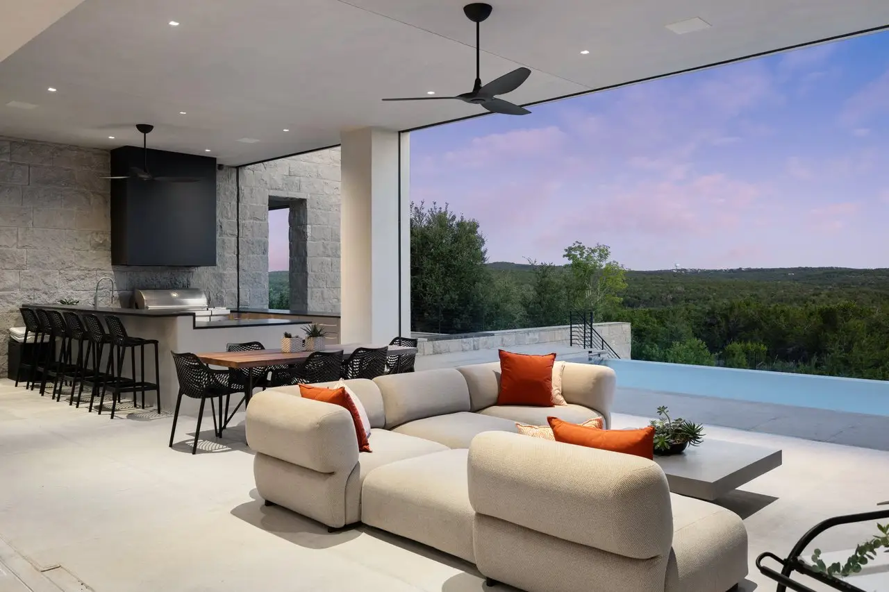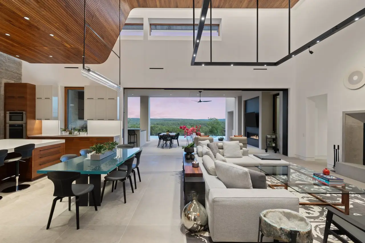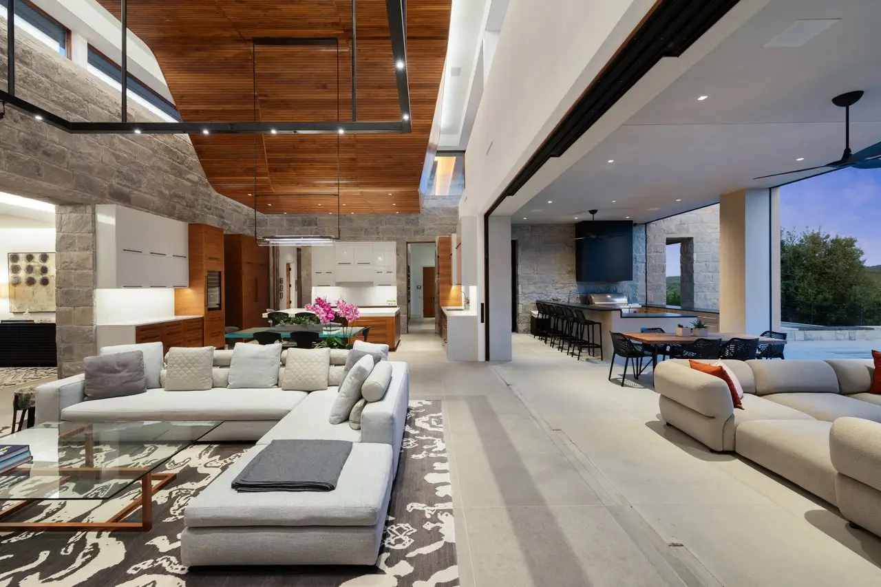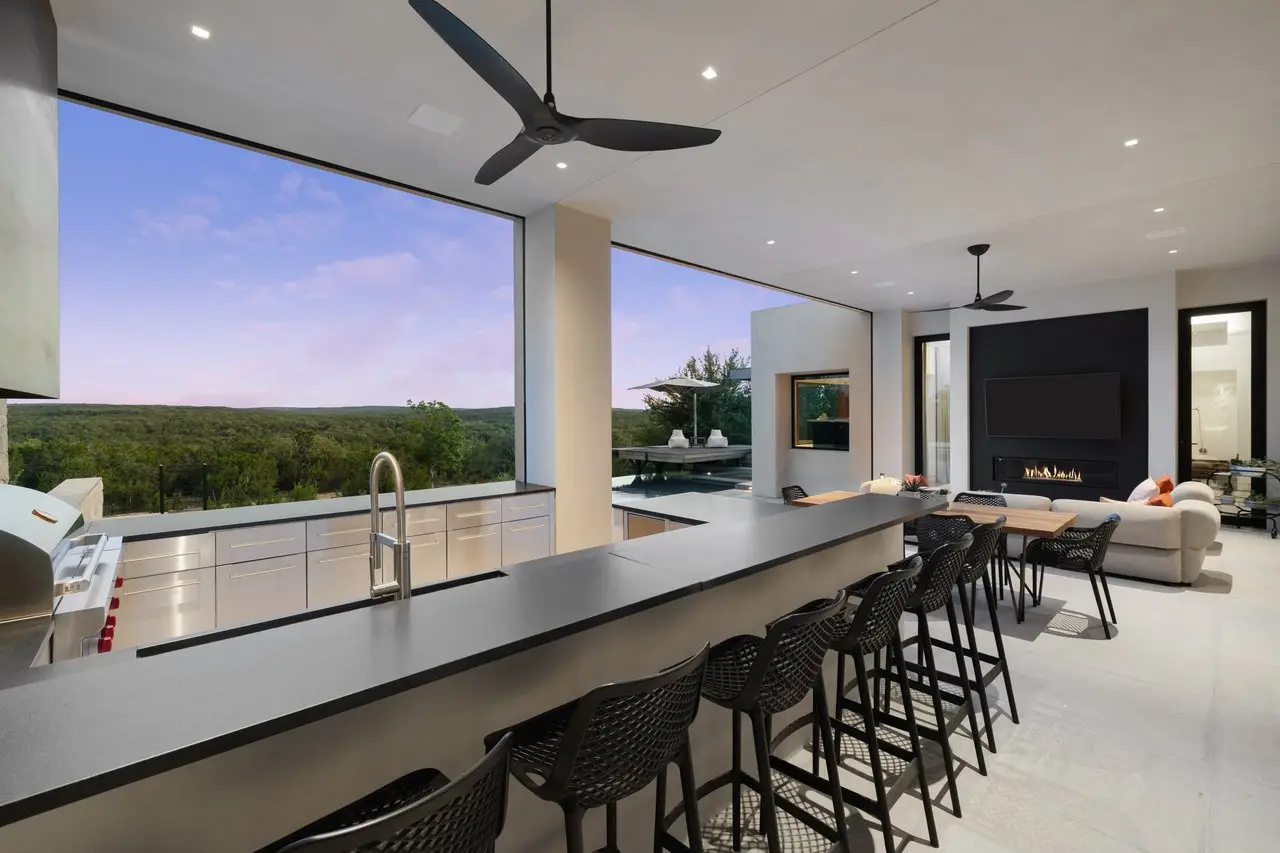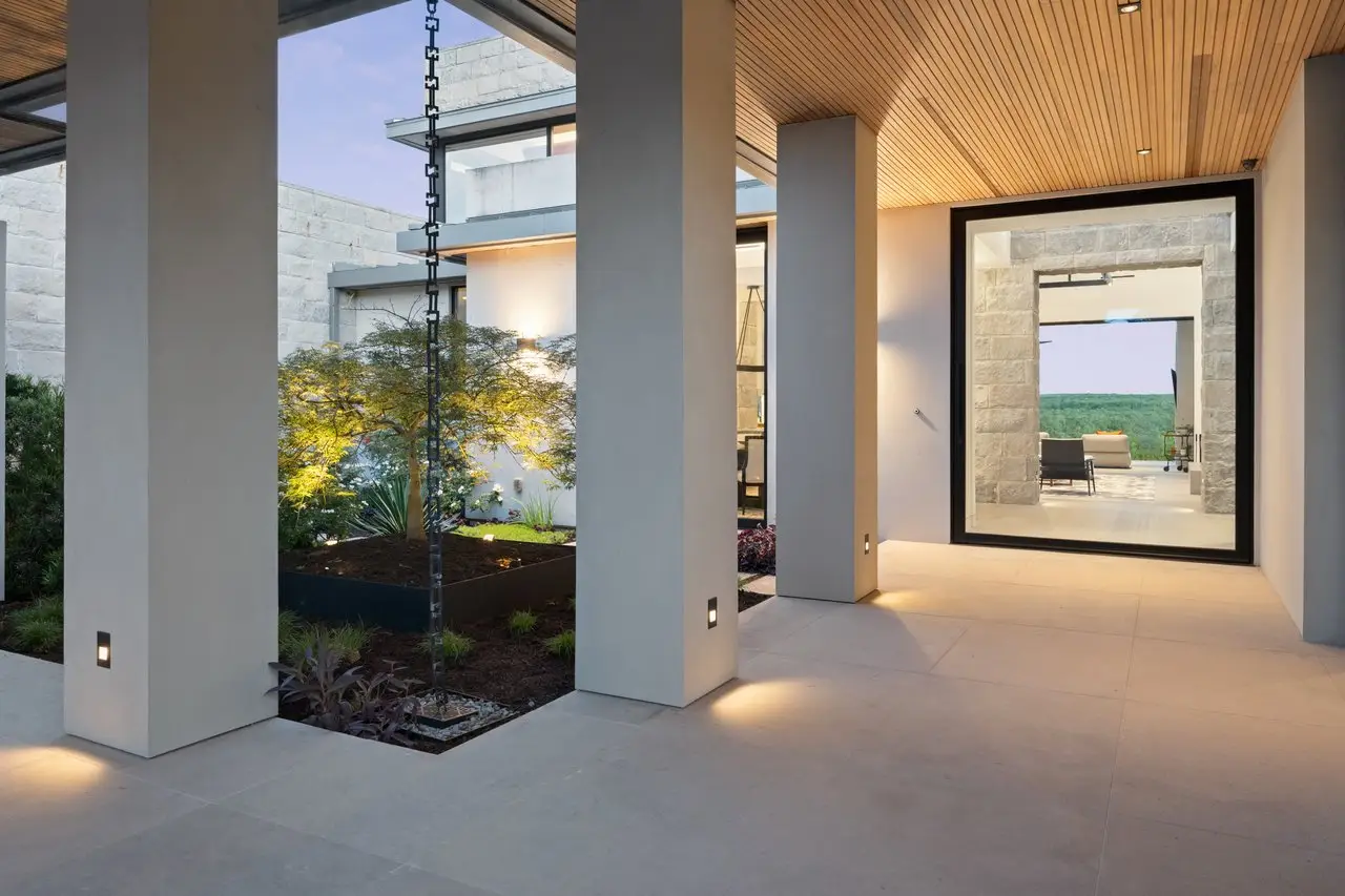 Architecturally Significant | Exceptionally Private | Massive Hill Country Views Introducing 11705 Yaupon Holly Lane — a truly one-of-a-kind luxury estate in the prestigious Estates Section of Spanish Oaks, one of Austin’s most sought-after private, gated communities. Designed by renowned architect Evan Fisher (Studio Architects and Chas Architects) with interiors by Rachel Mast Design, this soft contemporary custom home is a masterclass in balance—where clean lines meet warm textures, and refined sophistication is grounded in natural Hill Country elements. Perfectly positioned on what may be the most private lot in all of Spanish Oaks, the home offers sweeping Hill Country views and the serenity of a property that feels like it sits on hundreds of acres. Architecture, Interiors & Finishes From the moment you step through the 6.5’ x 9’ custom glass pivot door, the home's expansive volume and material palette create a lasting impression. Over 7,300 square feet of thoughtfully designed living space includes 5 bedrooms, 5.5 bathrooms, and a seamless integration of indoor and outdoor living. Floors and walls are wrapped in gray Leuders limestone, sourced from Leuders Texas, and paired with quartz countertops, custom lacquer cabinetry, and warm walnut millwork throughout. The entire home is equipped with high-efficiency LED lighting (all lights are 95+ CRI, 3000K color temperature) for consistent ambiance and visual comfort. Built for both luxury and sustainability, the property includes: 30,000-gallon rainwater collection and filter system for in-home use 65-panel solar array EV charging station Private well for irrigation Chef’s Kitchen & Entertaining Spaces The main kitchen is a statement in both form and function — with 3.5” Cambria Quartz waterfall counters, book-matched walnut cabinetry, and a sleek, fully integrated appliance suite featuring: Wolf convection, steam, induction cooking, and warming drawer Sub-Zero refrigerator and freezer with book-matched walnut panels Sub-zero refrigerator and freezer drawers, and 86-bottle wine column Miele dishwashers A hidden Beverage Center / Back Kitchen offers an oversized walk-in pantry, extra dishwasher, mitered lacquer cabinetry, and ample prep space—perfect for hosting without cluttering the main kitchen space. Indoor dining flows effortlessly into multiple entertaining areas, including: A private formal dining room An everyday dining area A dramatic great room with “walnut wave” ceiling and wood-burning fireplace Four impressive 5.5’ x 9’ each Weiland sliding glass doors fully disappear into the walls, creating a seamless indoor-outdoor living experience. Outdoor Living & Kitchen Enjoy year-round entertaining in the expansive covered patio featuring: Full outdoor kitchen with Wolf cooktop, Sub-Zero fridge & ice maker, and Galley workstation sink Leathered stone countertops with seating for eight Gas fireplace, outdoor TV, and integrated ceiling speakers Automated sunshades by Texas Sun & Shade Room for both alfresco dining, a full outdoor living set, and spacious sectional sofa Primary Suite Retreat The private owner’s wing is a true luxury retreat, with a gas fireplace, lounge/sitting area with automated shades and hideaway TV, cove lighting, and blackout drapes. The spa-inspired bathroom features: Radiant heated floors 5’ x 10’ book-matched Stonepeak Calacatta Vena slabs Floating dual vanity sink area with 6” quartz counters Platform soaking tub & walk-in glass shower Custom makeup vanity, mirrored medicine cabinets Picture window (48’ x 52”) with panoramic Hill Country views An adjacent home gym—bathed in natural light with floor-to-ceiling mirrors, oversize windows, and rift-sawn white oak floors—feels like a modern treehouse. Additional Living Spaces Media Room: Custom entertainment wall, homework station, panoramic views, with flexible space for future bar or buffet Downstairs Guest Suites: Private and thoughtfully appointed, with large closets, cove lighting, and en-suite baths Office: Custom cabinetry, automated standing desk, built-in printer station, and dedicated storage room with gift-wrapping area Mudroom & Laundry: Functional yet elevated, with walnut barn doors, built-ins, and utility storage Upstairs Bedrooms: Two spacious secondary bedrooms with Hill Country views, walk-in closets, and walnut flooring Property Highlights 5 Bedrooms | 5.5 Bathrooms 7,342 SQ FT (per TCAD) 3 Car Garage Space, Carport Space & Golf Cart Parking Private Automatic Driveway Gate Infinity Edge Pool and Hot Tub with Elevated Ipe Wood Swim Platform Lot: 1.3± Acres Architect: Evan Fisher (Studio Architects / Chas Architects) Interior Design: Rachel Mast Design Views: Protected Hill Country Preserve (250+ Acres owned by University of Texas) Location: Spanish Oaks – The Estates Section– Gated, Guarded, Golf Community Owner/Agent