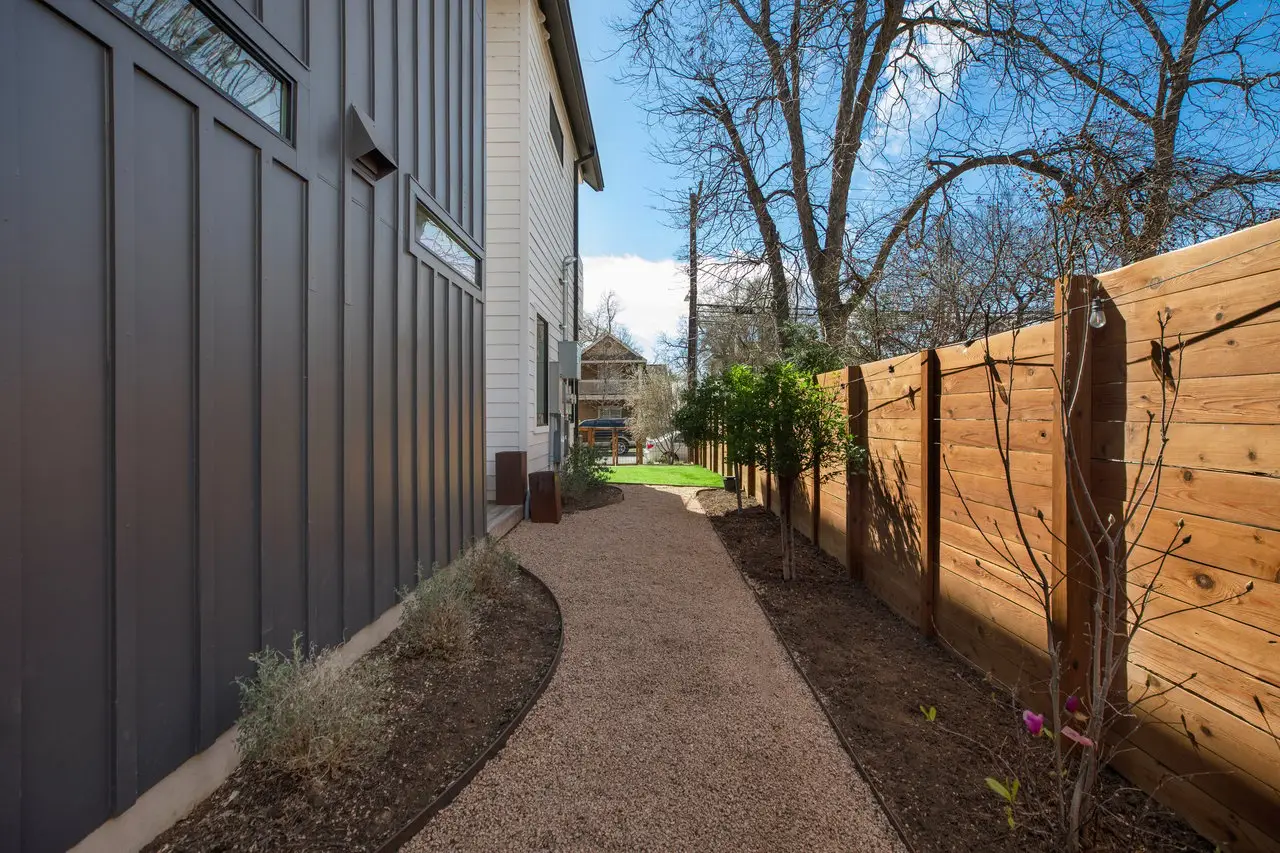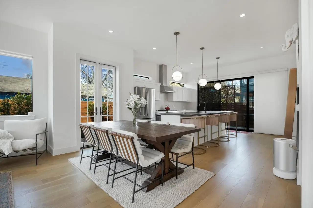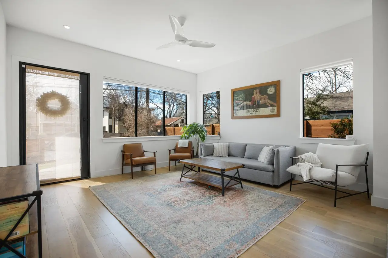 Perfectly positioned in one of Austin’s most dynamic neighborhoods, this stunning contemporary home offers the best of urban living. Steps from award-winning restaurants, craft cocktail bars, live music venues, and the Saltillo shopping district, it also provides easy access to the light rail, river, and Downtown Austin. One of the only ~3,000 sqft homes in the area, 1410 East 3rd Street seamlessly blends space, comfort, modern design, and walkability. Built in 2019, this 4-bed, 4.5-bath home features a thoughtfully designed layout with high-end finishes and effortless functionality. The main level is perfect for entertaining, with an open-concept living and dining space, a sleek gourmet kitchen, an elevated powder room, and seamless access to the front and back patios through elegant French doors. Upstairs, two spacious bedrooms each have private baths and balconies with downtown skyline views. The third-floor suite serves as a versatile live-work space with breathtaking views from its private balcony. A fully finished 1-bed, 1-bath basement offers a wet bar, wine fridge, and skylight windows, ideal as a guest suite, media room, or private retreat. A beautifully designed nursery off the primary suite also functions as a home office. Surrounded by a fully renovated, gated yard, this home boasts ~800 sqft of outdoor patio and deck space for relaxing and entertaining. Lush landscaping includes a three-zone irrigation system, olive trees, honeysuckle vines, fruit trees, Texas sage, and custom trellising. A two-car driveway and a one-car garage add convenience and luxury. Also included are an EV charger and generator for energy efficiency and reliability. 1410e3rd.com
