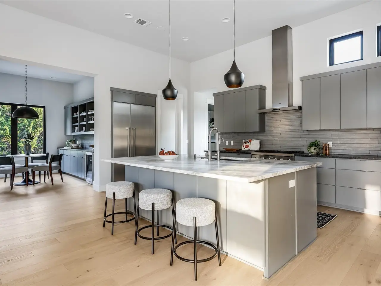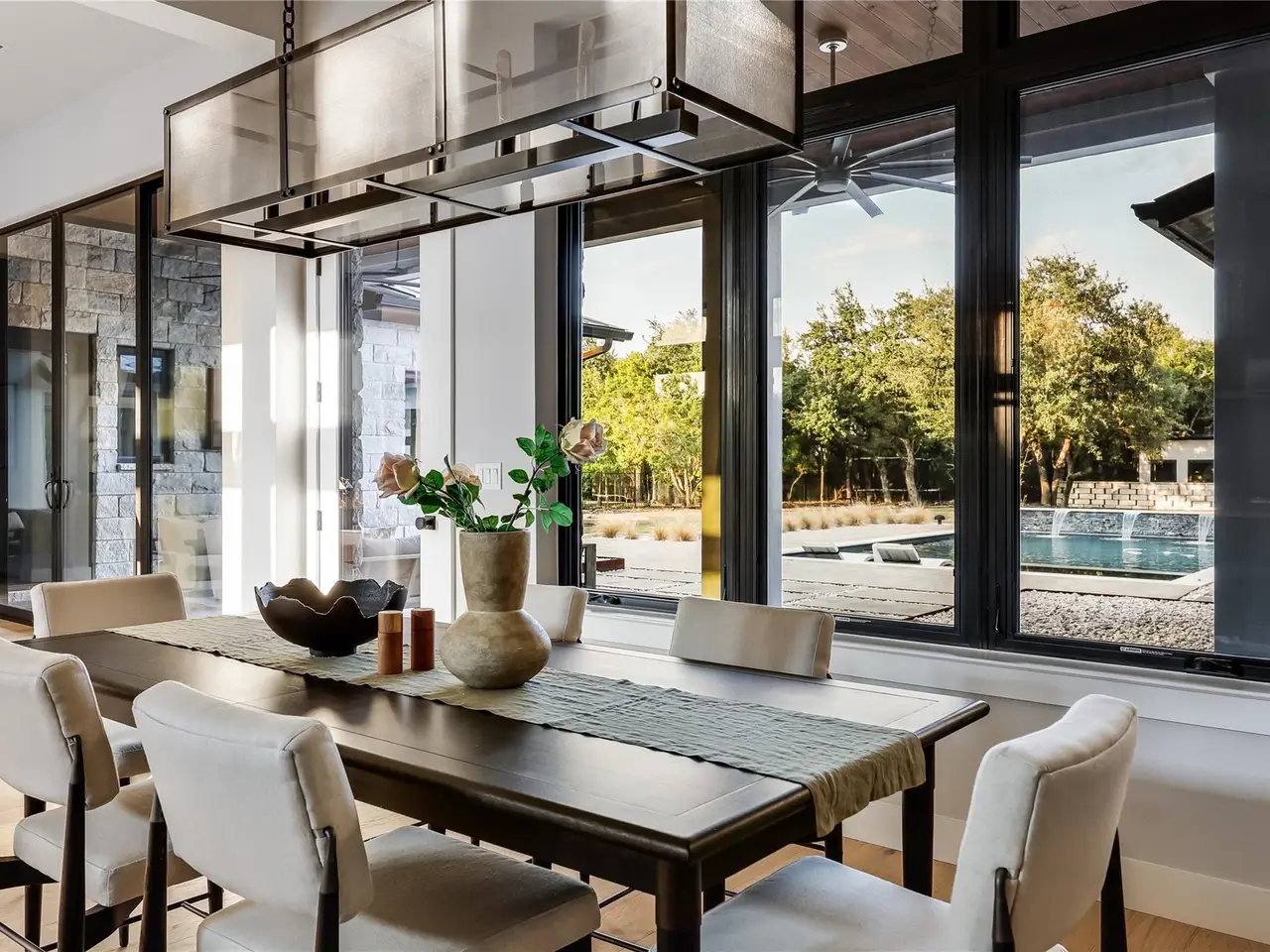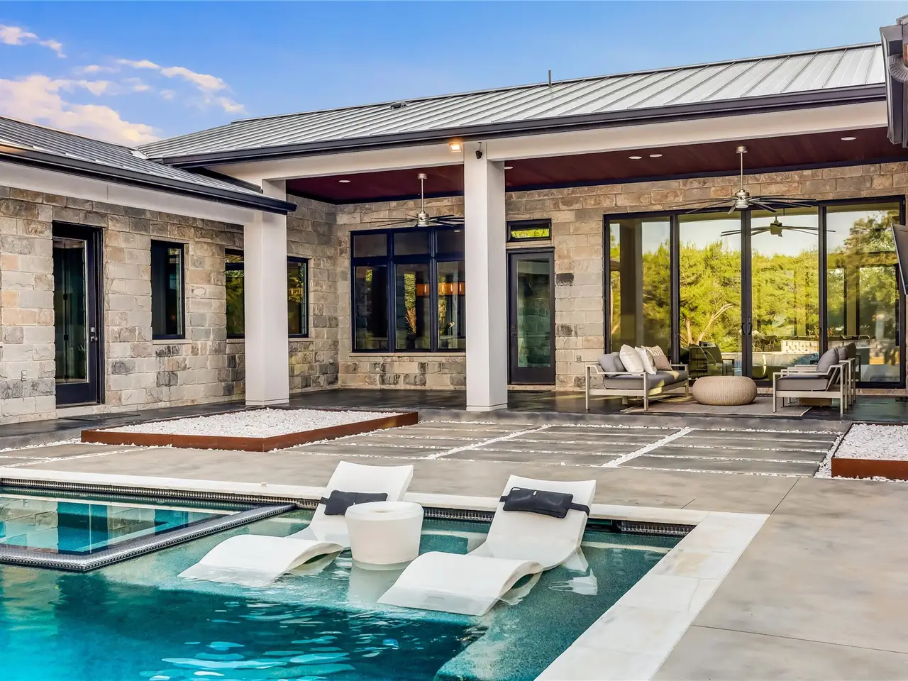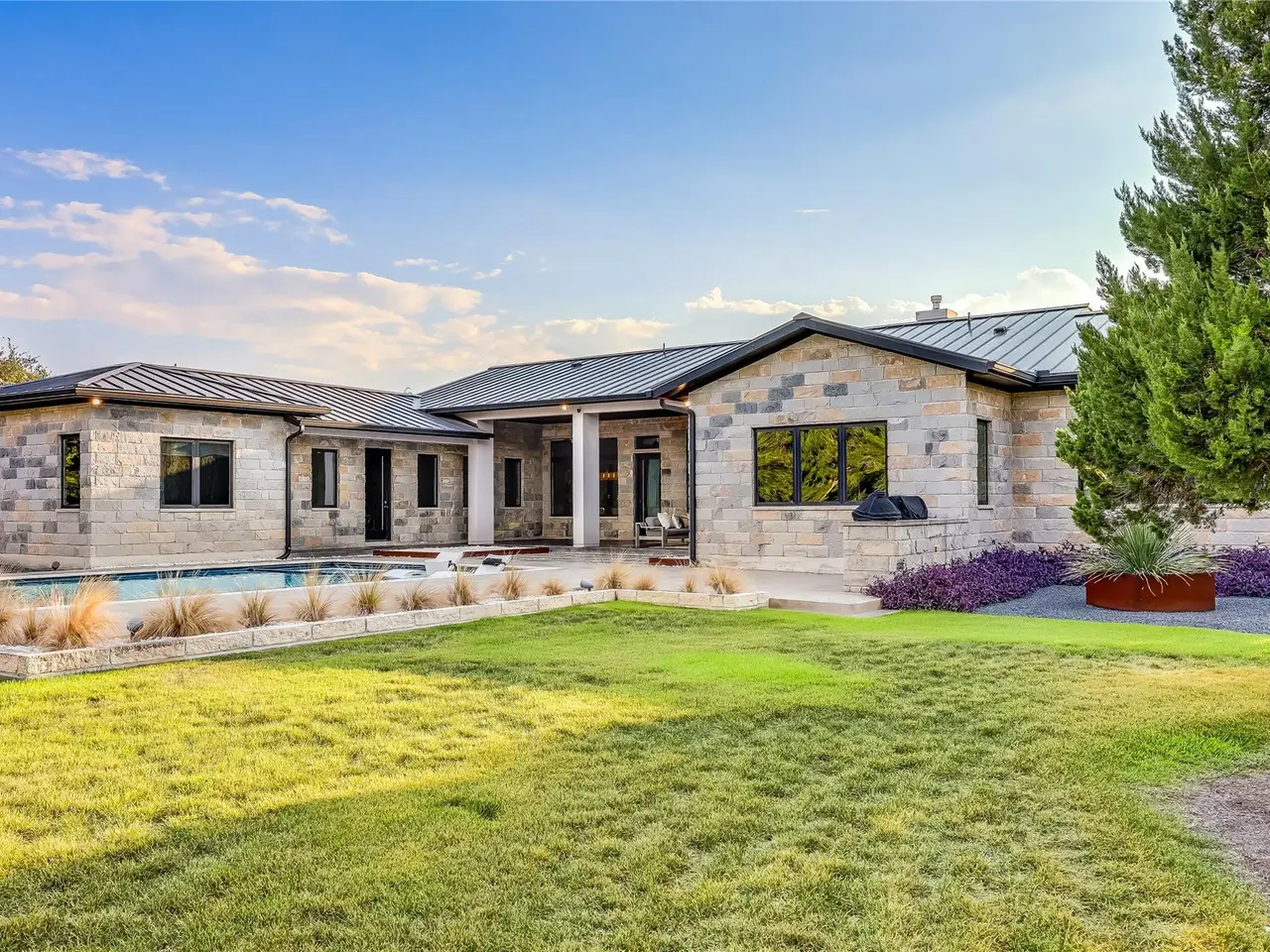 Beautifully Refreshed - With new wood floors, updated bathroom tile, fresh paint, and more! This modern single-story residence in the coveted Meridian community by Nalle Homes combines thoughtful architecture with refined craftsmanship for elevated indoor-outdoor living. A rare lot spanning both Hays and Travis counties provides families with unique flexibility and options for schools--an incredible advantage in addition to custom luxury and lifestyle. The distinctive U-shaped floor plan creates two private wings housing 4 spacious bedrooms, ensuring tranquility for both owners and guests. Expansive sliding glass doors frame views of the resort-style backyard oasis, featuring an oversized heated pool and spa designed by Athena Pools--perfect for both sun-drenched days and starlit evenings. Inside, versatile living spaces flow seamlessly from the study with stained French doors to the airy great room designed for gathering. The chef's kitchen stands as the heart of the home, showcasing Thermador appliances, granite counters, and a sculptural honed marble island that invites both conversation and culinary creativity. Sophisticated enhancements include tinted Andersen 100 windows, a whole-house water softener and filtration system, a central vacuum, and a soundproofed media room that doubles as an additional office or bedroom for evolving needs. The oversized three-car garage features epoxy flooring and built-in storage by Garage Experts, while a fully finished private studio--climate-controlled and fully wired--offers space for creativity or work. The outdoor experience continues with a built-in grilling station featuring a Napoleon grill, a mini-fridge, and a Big Green Egg smoker, all set against lush landscaping with greenbelt views. Located just 15 minutes from downtown Austin within the Meridian master-planned community, residents also enjoy access to a private 10-acre lake, community pool, and walking trails.