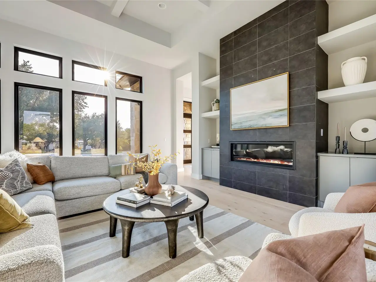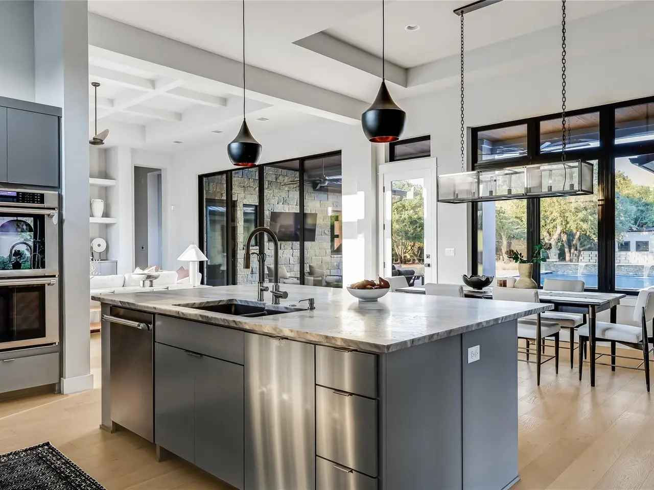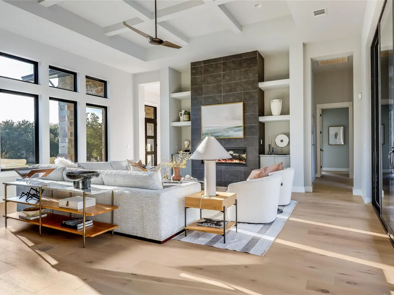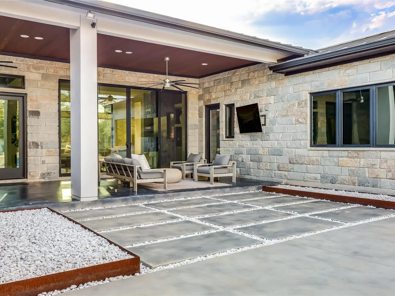 Beautifully Refreshed - With new wood floors, updated bathroom tile, fresh paint, and more! This modern single-story residence in the coveted Meridian community by Nalle Homes combines thoughtful architecture with refined craftsmanship for elevated indoor-outdoor living. A rare lot spanning both Hays and Travis counties provides families with unique flexibility and options for schools--an incredible advantage in addition to custom luxury and lifestyle. The distinctive U-shaped floor plan creates two private wings housing 4 spacious bedrooms, ensuring tranquility for both owners and guests. Expansive sliding glass doors frame views of the resort-style backyard oasis, featuring an oversized heated pool and spa designed by Athena Pools--perfect for both sun-drenched days and starlit evenings. Inside, versatile living spaces flow seamlessly from the study with stained French doors to the airy great room designed for gathering. The chef's kitchen stands as the heart of the home, showcasing Thermador appliances, granite counters, and a sculptural honed marble island that invites both conversation and culinary creativity. Sophisticated enhancements include tinted Andersen 100 windows, a whole-house water softener and filtration system, a central vacuum, and a soundproofed media room that doubles as an additional office or bedroom for evolving needs. The oversized three-car garage features epoxy flooring and built-in storage by Garage Experts, while a fully finished private studio--climate-controlled and fully wired--offers space for creativity or work. The outdoor experience continues with a built-in grilling station featuring a Napoleon grill, a mini-fridge, and a Big Green Egg smoker, all set against lush landscaping with greenbelt views. Located just 15 minutes from downtown Austin within the Meridian master-planned community, residents also enjoy access to a private 10-acre lake, community pool, and walking trails.