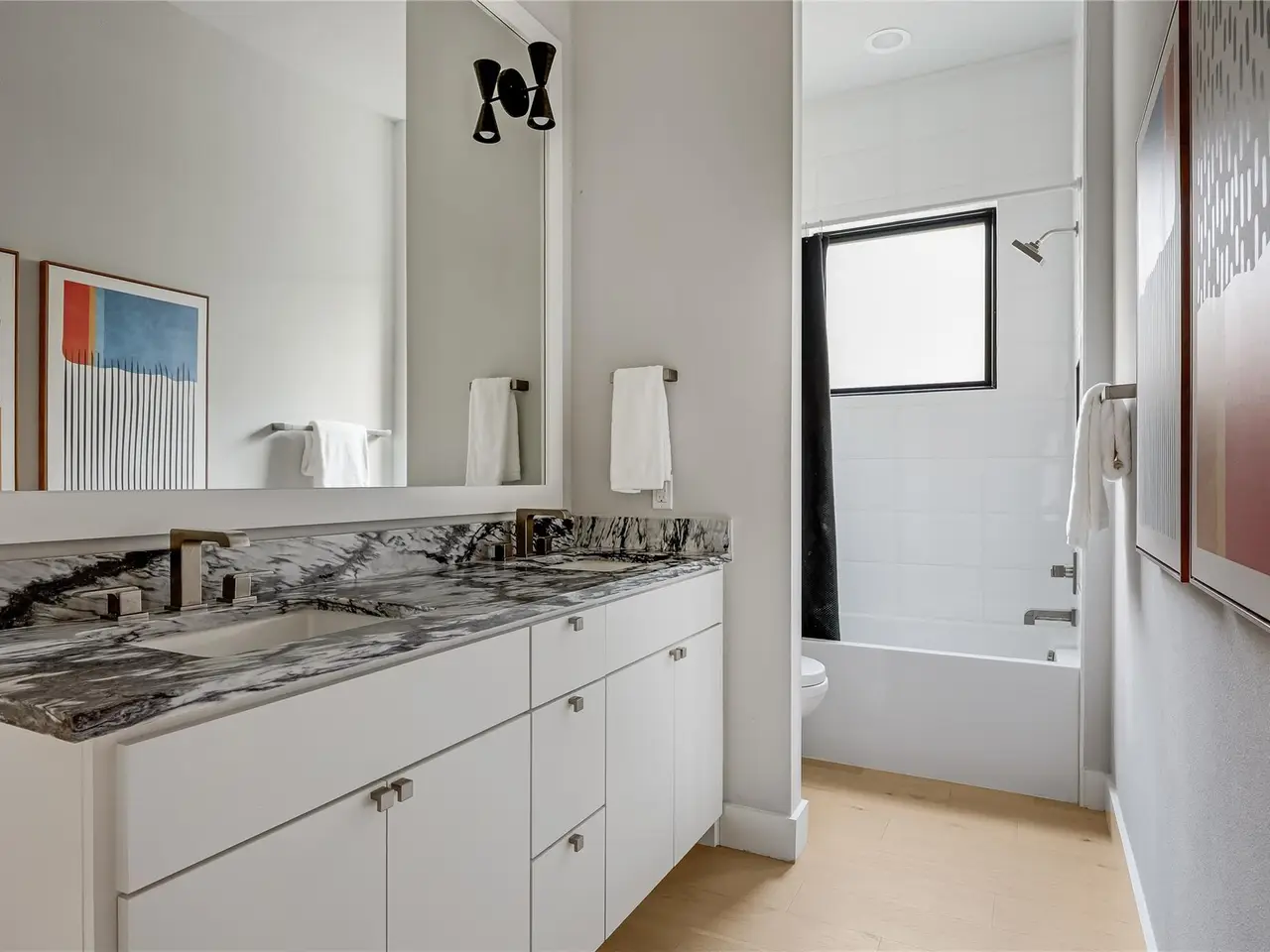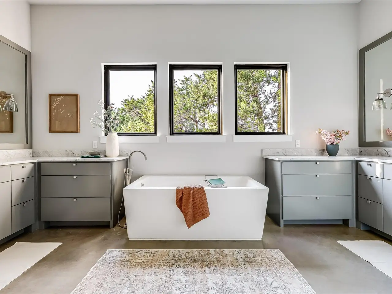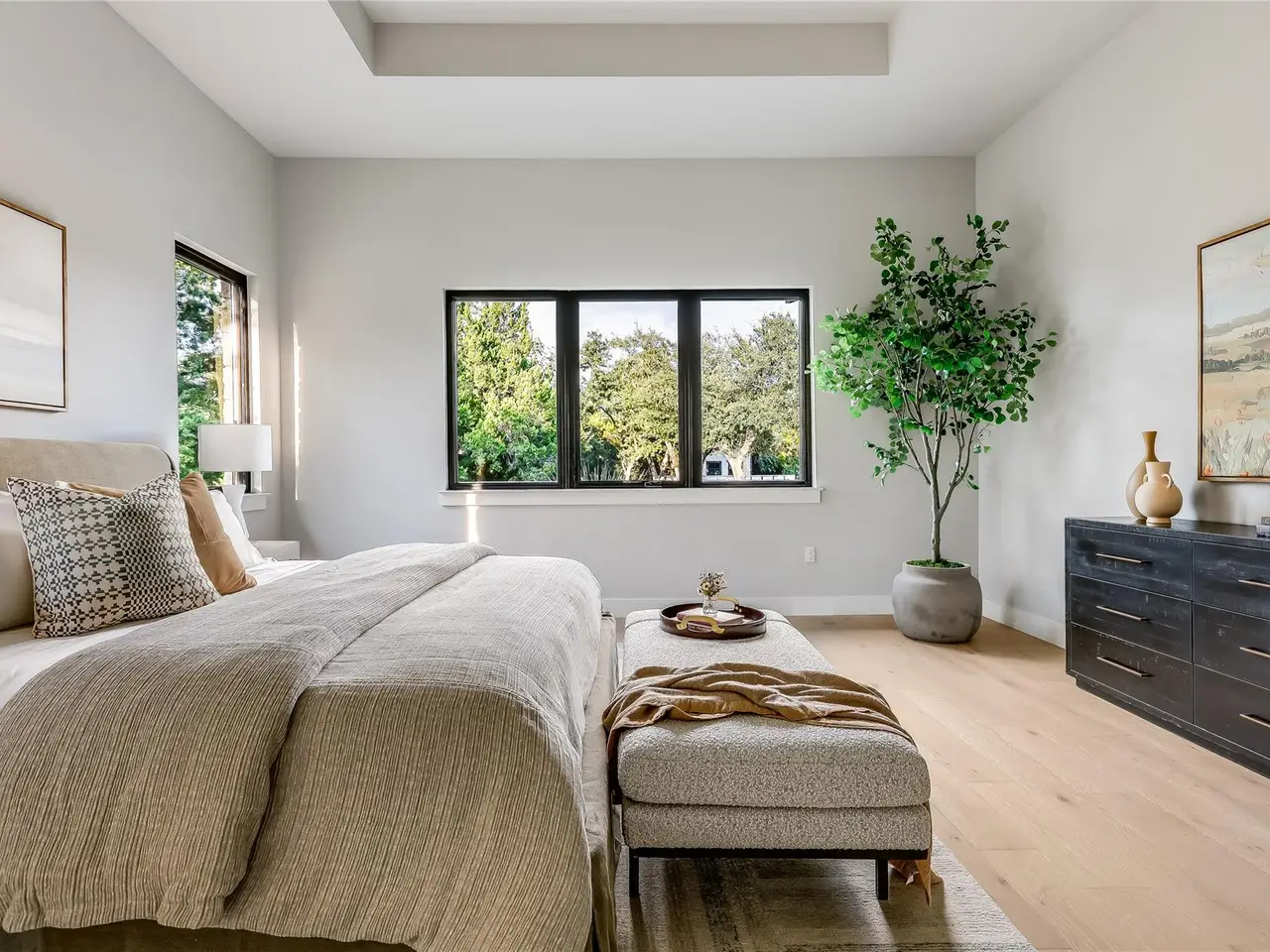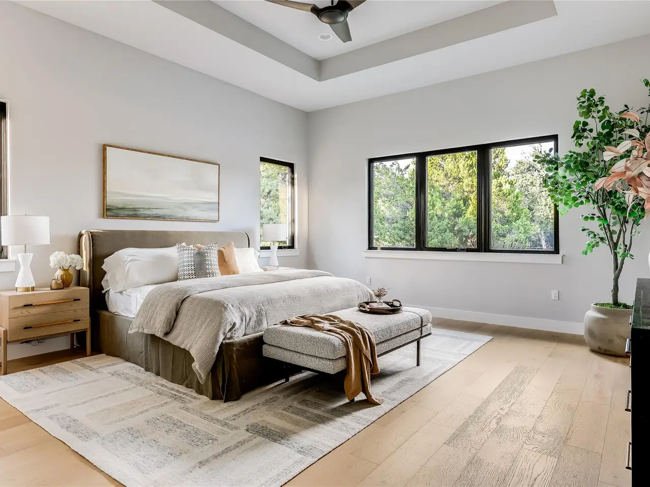 Beautifully Refreshed - With new wood floors, updated bathroom tile, fresh paint, and more! This modern single-story residence in the coveted Meridian community by Nalle Homes combines thoughtful architecture with refined craftsmanship for elevated indoor-outdoor living. A rare lot spanning both Hays and Travis counties provides families with unique flexibility and options for schools--an incredible advantage in addition to custom luxury and lifestyle. The distinctive U-shaped floor plan creates two private wings housing 4 spacious bedrooms, ensuring tranquility for both owners and guests. Expansive sliding glass doors frame views of the resort-style backyard oasis, featuring an oversized heated pool and spa designed by Athena Pools--perfect for both sun-drenched days and starlit evenings. Inside, versatile living spaces flow seamlessly from the study with stained French doors to the airy great room designed for gathering. The chef's kitchen stands as the heart of the home, showcasing Thermador appliances, granite counters, and a sculptural honed marble island that invites both conversation and culinary creativity. Sophisticated enhancements include tinted Andersen 100 windows, a whole-house water softener and filtration system, a central vacuum, and a soundproofed media room that doubles as an additional office or bedroom for evolving needs. The oversized three-car garage features epoxy flooring and built-in storage by Garage Experts, while a fully finished private studio--climate-controlled and fully wired--offers space for creativity or work. The outdoor experience continues with a built-in grilling station featuring a Napoleon grill, a mini-fridge, and a Big Green Egg smoker, all set against lush landscaping with greenbelt views. Located just 15 minutes from downtown Austin within the Meridian master-planned community, residents also enjoy access to a private 10-acre lake, community pool, and walking trails.