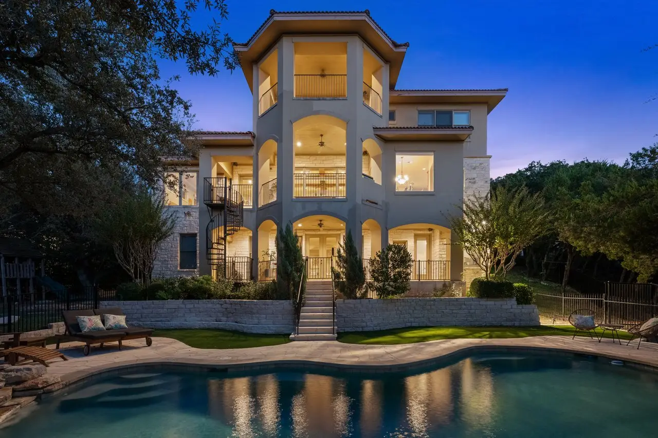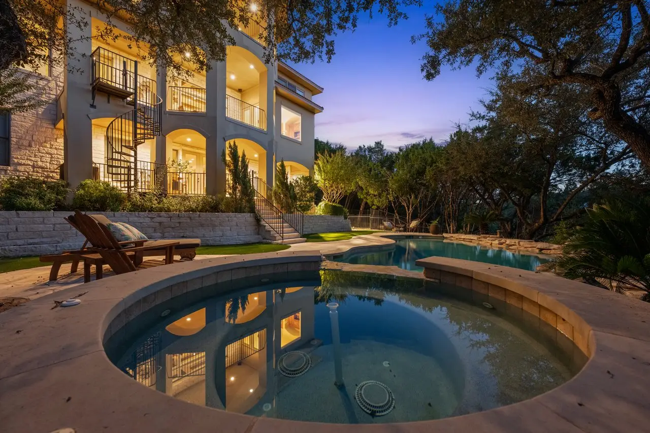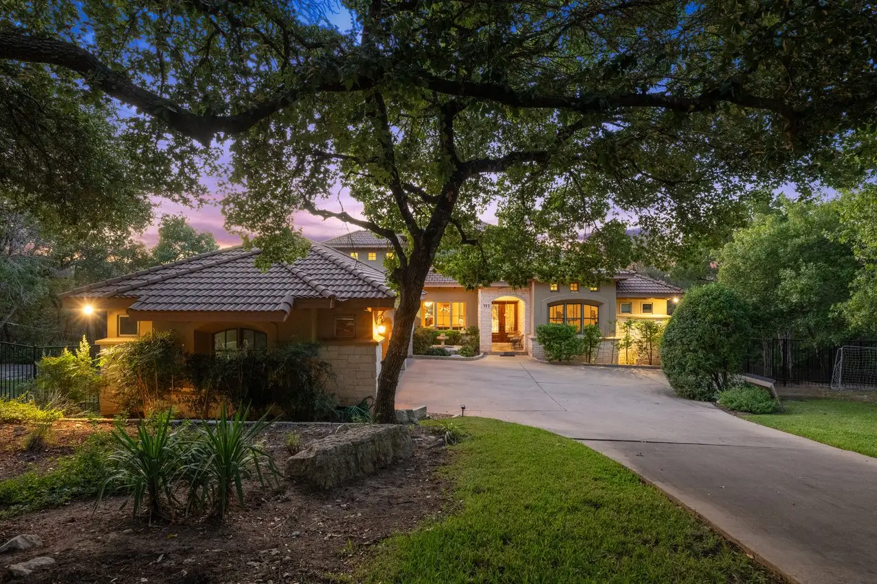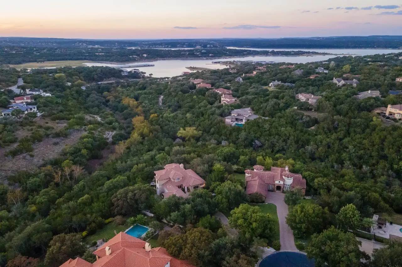 Framed by panoramic Hill Country and Lake Travis sunset views, this 1.5 custom ESTATE home delivers unmatched privacy, natural beauty, and timeless architectural appeal. From your own backyard, follow scenic trails to the lake for boating, paddle boarding, or fishing, or take advantage of the neighborhood’s private waterfront park and day dock for easy lake access.Nestled at the end of a quiet cul-de-sac in the boutique, gated Arbolago community, the home features large picturesque windows that fill the interiors with natural light, including beautiful views from nearly every room in the house. The main level showcases solid oak hardwood flooring and a spacious family room accented with warm wood beams. The open, thoughtfully designed layout offers four generous bedrooms, each with a dedicated en suite bath, as well as multiple living spaces. HVAC keeps utilities efficient and comfortable year-round.The gourmet kitchen includes a commercial-grade refrigerator, double ovens, gas cooktop, granite countertops, a center island, and solid wood cabinetry, complemented by a butler’s pantry or bar for effortless entertaining. Texas limestone accents inside and out add timeless Hill Country character.Outdoor living is exceptional, with three covered living areas, a sparkling pool and spa with waterfall feature, and peaceful green space views. The owner’s retreat provides direct access to a covered outdoor living area—perfect for morning coffee and enjoying the wide-open vistas.The lower level is designed for recreation and hosting, featuring a billiards/game room with walk-out access to the pool, a wet bar with beverage refrigerator, a media room positioned for sound privacy, and a private bedroom suite ideal for guests, a nanny, or teens. A full bath includes exterior access for convenient use from the pool. The upper level includes two children or guest suites and an additional private living space with more stunning views.An oversized three-car side-entry garage, low tax rate, and proximity to top-rated Lake Travis ISD schools, shopping, dining, and medical facilities make this an exceptional opportunity. LOW TAX RATE means ample savings each month. This property combines Hill Country serenity with refined living—truly one of the most special homes in Lakeway.
