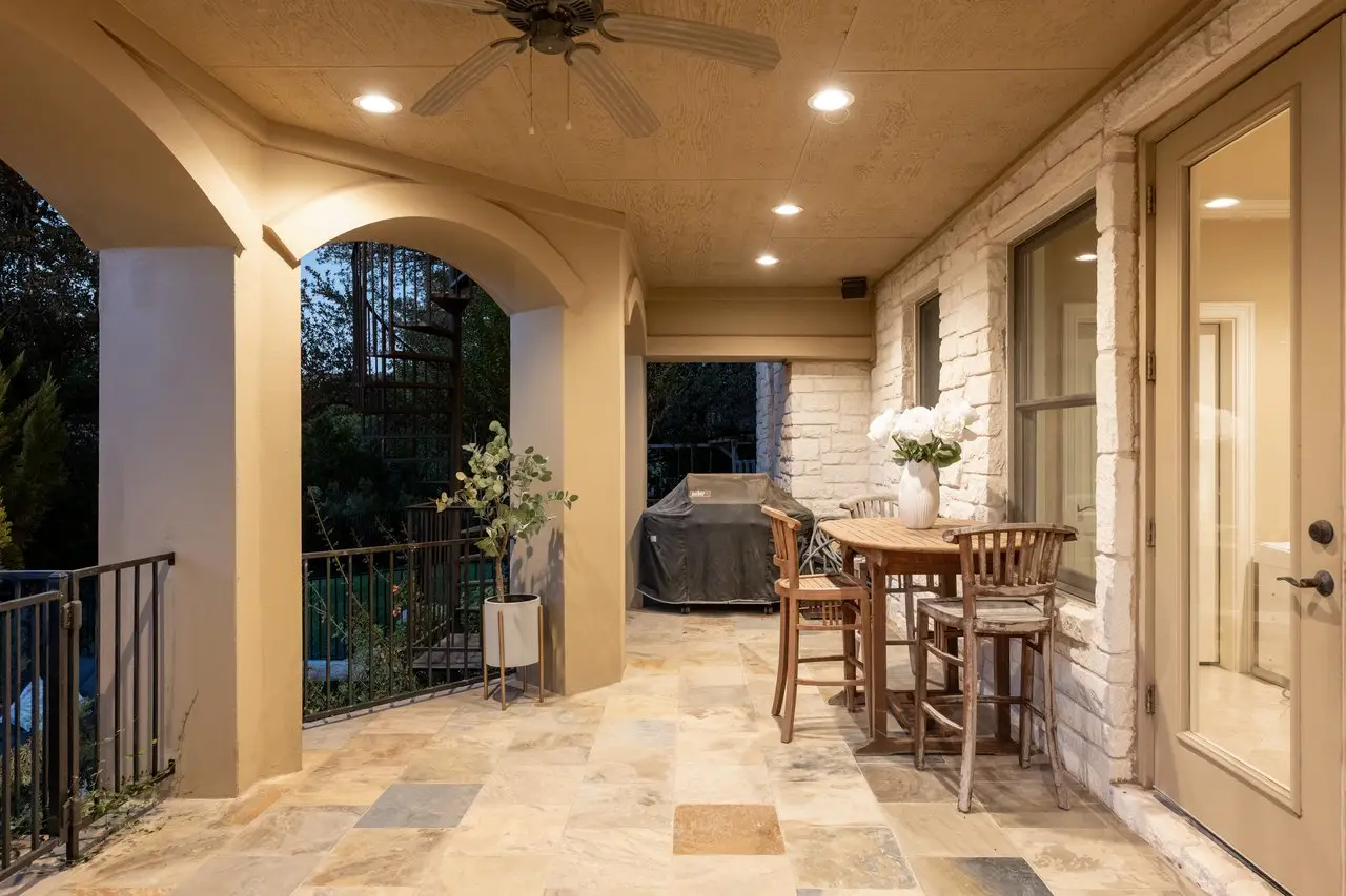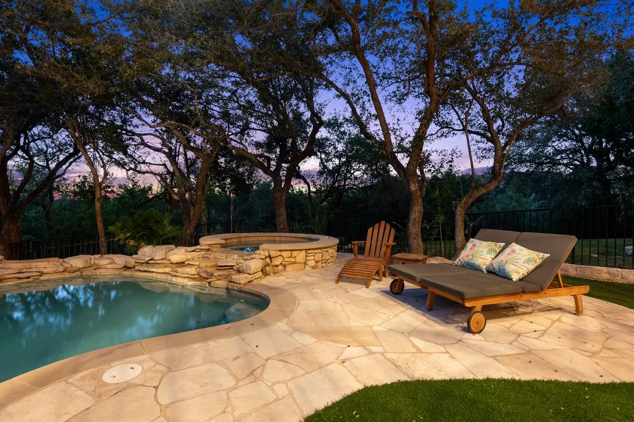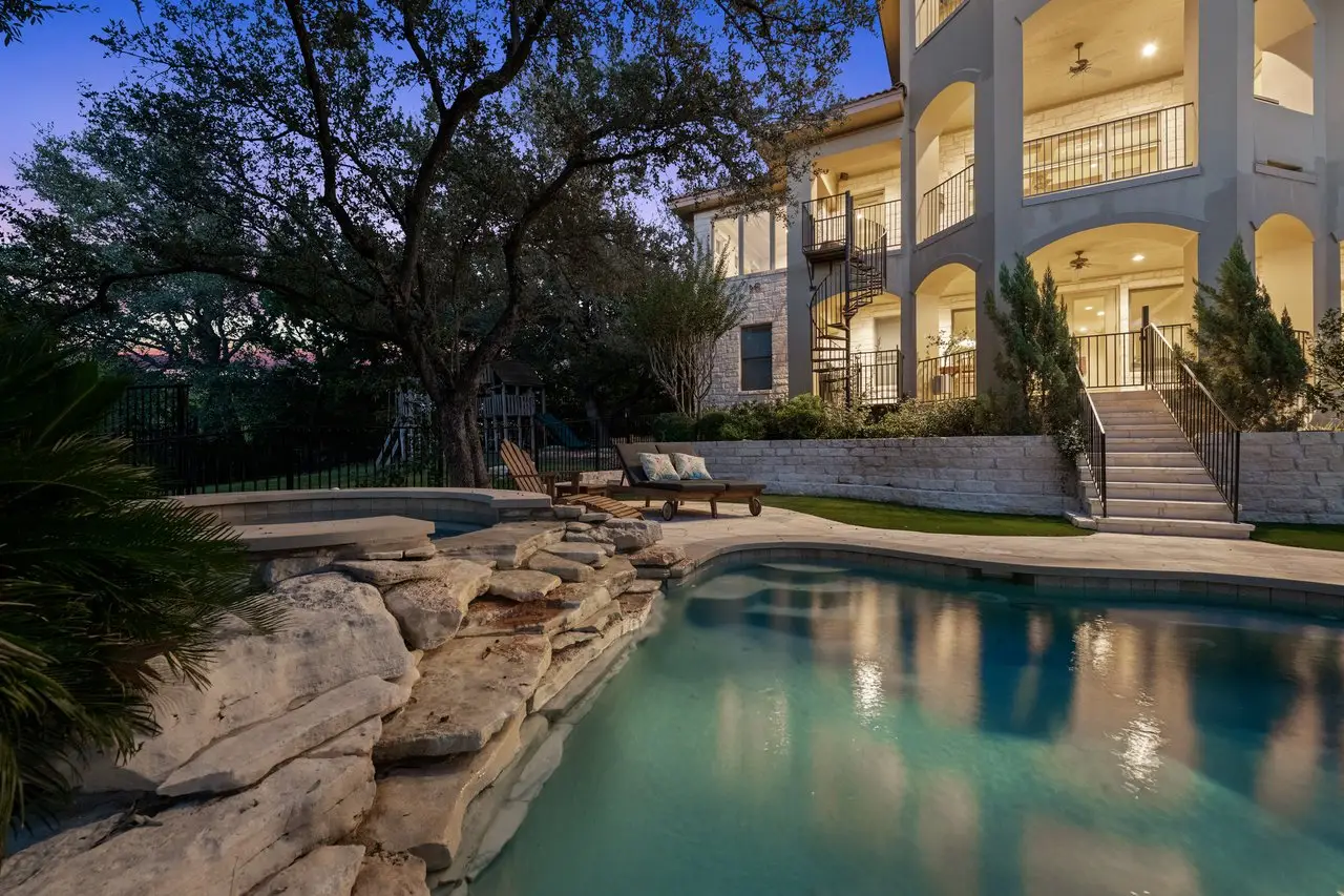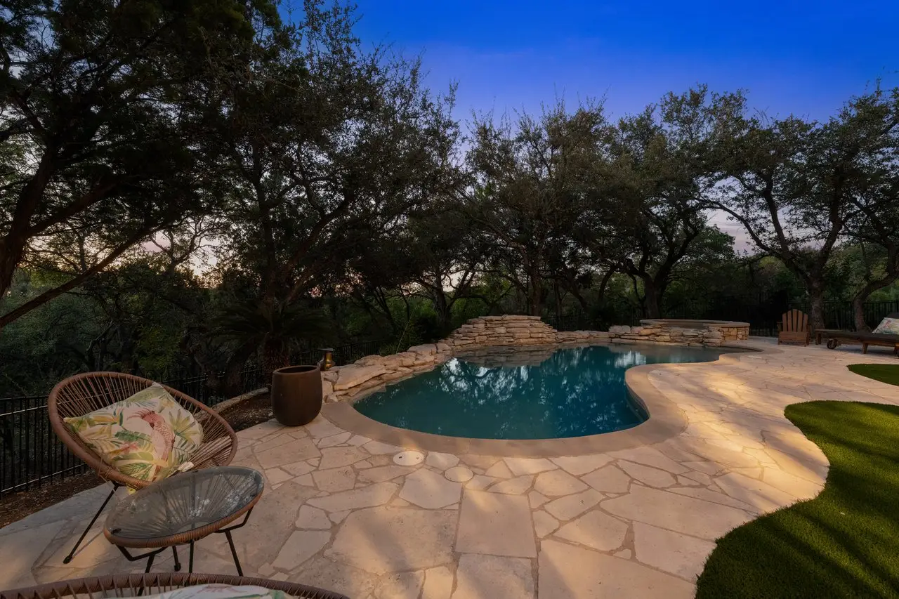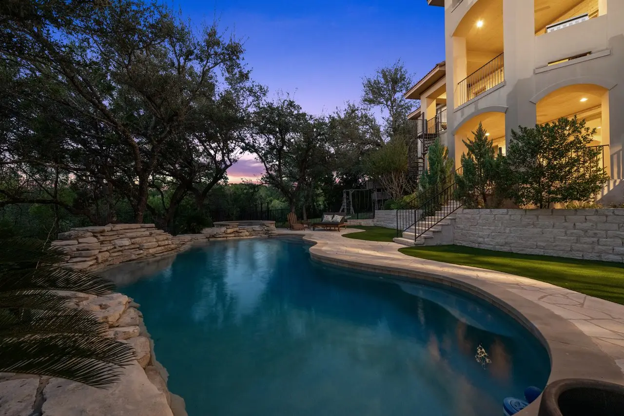 Framed by panoramic Hill Country and Lake Travis sunset views, this 1.5 custom ESTATE home delivers unmatched privacy, natural beauty, and timeless architectural appeal. From your own backyard, follow scenic trails to the lake for boating, paddle boarding, or fishing, or take advantage of the neighborhood’s private waterfront park and day dock for easy lake access.Nestled at the end of a quiet cul-de-sac in the boutique, gated Arbolago community, the home features large picturesque windows that fill the interiors with natural light, including beautiful views from nearly every room in the house. The main level showcases solid oak hardwood flooring and a spacious family room accented with warm wood beams. The open, thoughtfully designed layout offers four generous bedrooms, each with a dedicated en suite bath, as well as multiple living spaces. HVAC keeps utilities efficient and comfortable year-round.The gourmet kitchen includes a commercial-grade refrigerator, double ovens, gas cooktop, granite countertops, a center island, and solid wood cabinetry, complemented by a butler’s pantry or bar for effortless entertaining. Texas limestone accents inside and out add timeless Hill Country character.Outdoor living is exceptional, with three covered living areas, a sparkling pool and spa with waterfall feature, and peaceful green space views. The owner’s retreat provides direct access to a covered outdoor living area—perfect for morning coffee and enjoying the wide-open vistas.The lower level is designed for recreation and hosting, featuring a billiards/game room with walk-out access to the pool, a wet bar with beverage refrigerator, a media room positioned for sound privacy, and a private bedroom suite ideal for guests, a nanny, or teens. A full bath includes exterior access for convenient use from the pool. The upper level includes two children or guest suites and an additional private living space with more stunning views.An oversized three-car side-entry garage, low tax rate, and proximity to top-rated Lake Travis ISD schools, shopping, dining, and medical facilities make this an exceptional opportunity. LOW TAX RATE means ample savings each month. This property combines Hill Country serenity with refined living—truly one of the most special homes in Lakeway.
