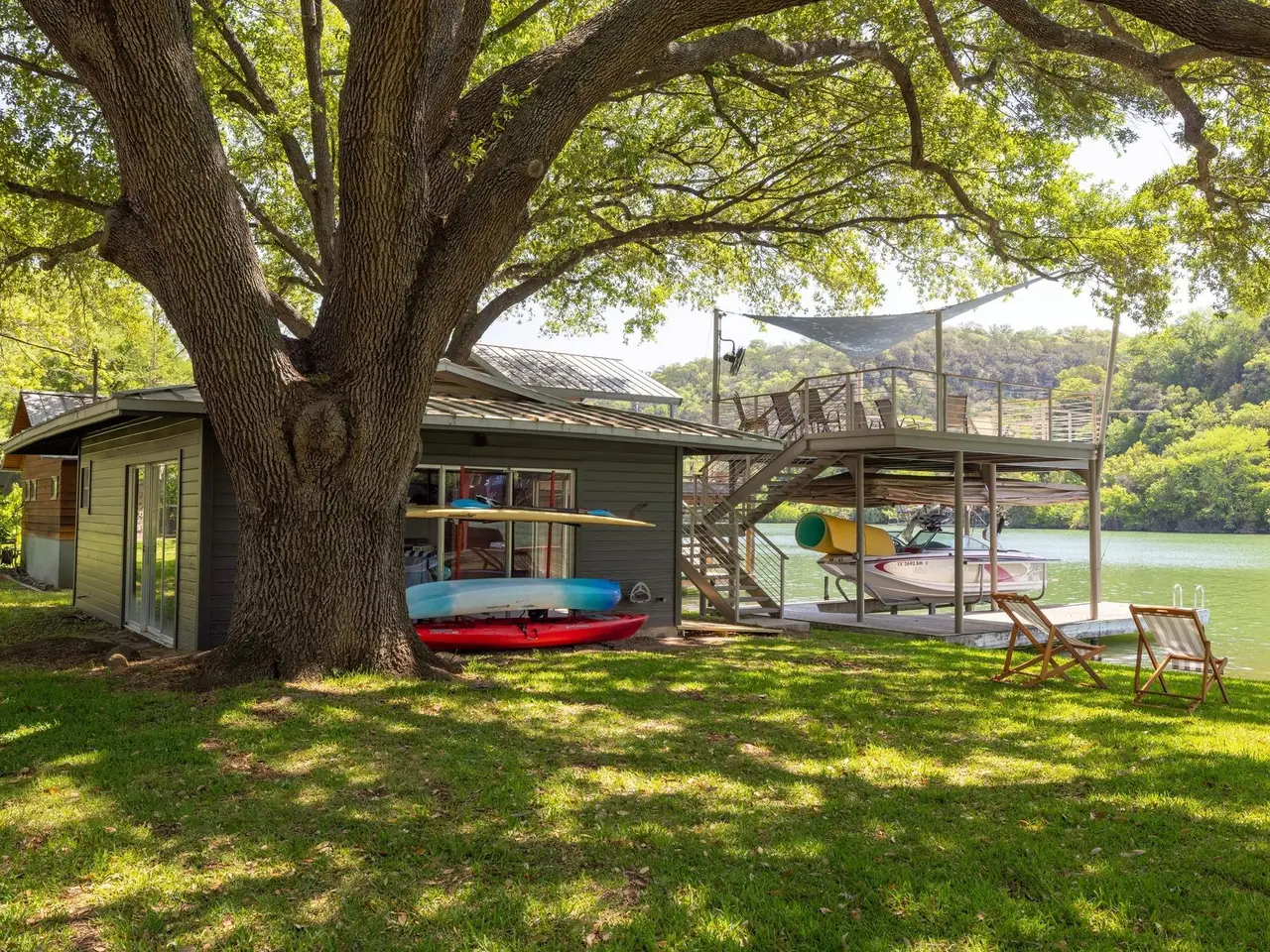 Set on one of the most iconic stretches of Lake Austin, 2401 Manana St. is a rare midcentury retreat that effortlessly balances architectural pedigree with laid-back Lake Austin living. Inspired by Frank Lloyd Wright's organic aesthetic, the rotunda-style home features dramatic yet welcoming vaulted ceilings, warm teak cabinetry in the updated kitchen, and sliding glass doors throughout the entire living and dining space that opens to the expansive, flat lawn. Shaded by a canopy of mature oak trees and two producing heritage pecan trees, the lawn leads you gently toward +/- 100' of private waterfront, where iconic oak trees frame the view. The calm waters here are ideal for water skiing, wakeboarding, and wake surfing--one of the best stretches on the lake for smooth conditions. The main house includes three bedrooms and two full bathrooms, while a detached two-car garage and guest suite offers its own living space, bedroom, and bathroom. On the water, a rare, grandfathered boathouse includes a full bathroom and lounge outfitted with a kitchenette, and the recently updated two-story boat dock features ipe decking, a hydraulic boat lift, touchless boat cover, shaded lounging and sunbathing areas, and even a jump gate into the lake. The property also boasts a full-yard sprinkler system and an updated water purification system. Located on a coveted neighborhood street, this home is within walking distance of Ski Shores Café (but just far enough to avoid the crowds), close to the natural beauty of Emma Long Park and all its recreational offerings, and benefits from a private neighborhood fireworks show on the Fourth of July. Tax and assessed values are estimates for illustration purposes only. All figures should be independently verified.