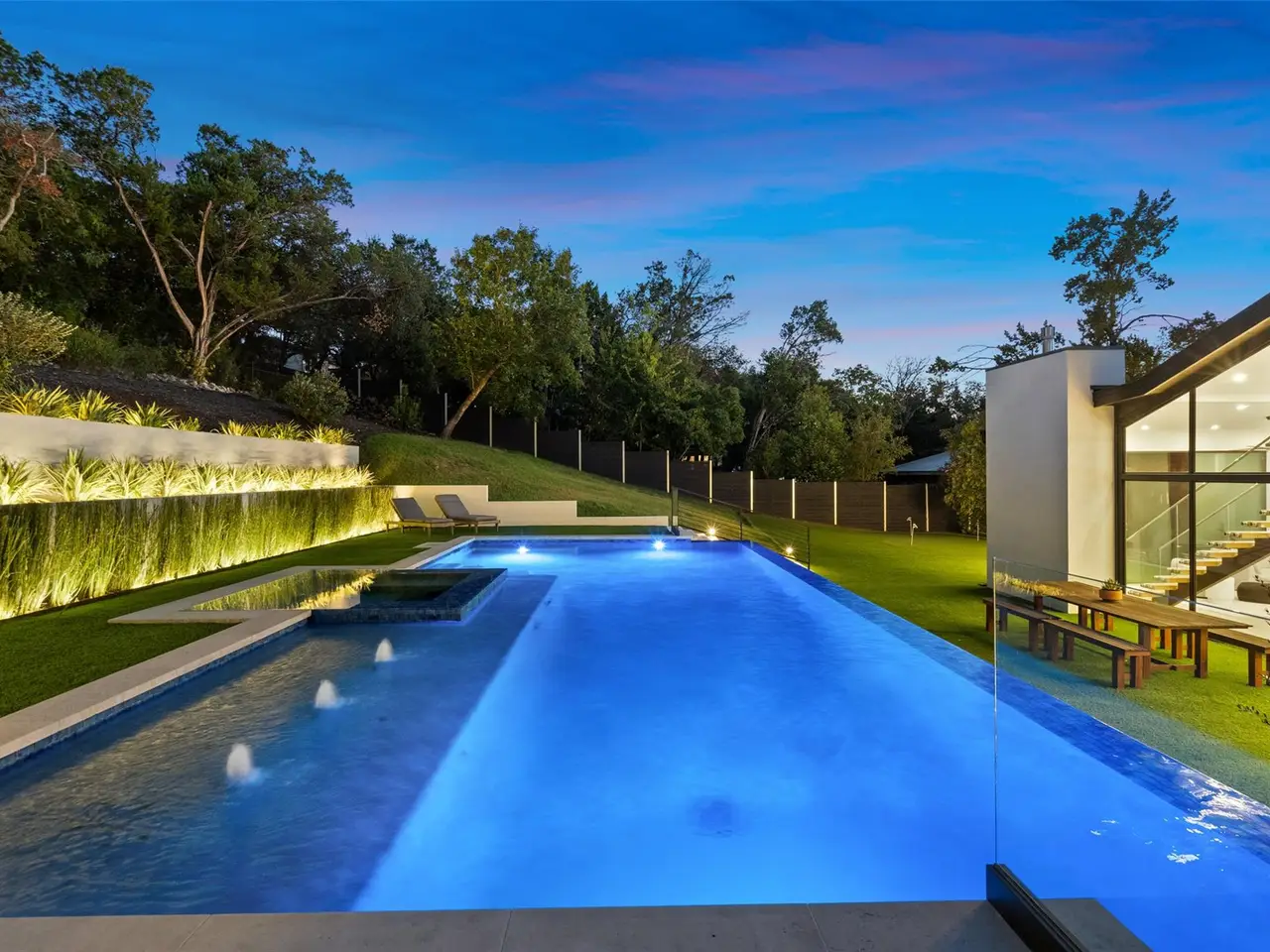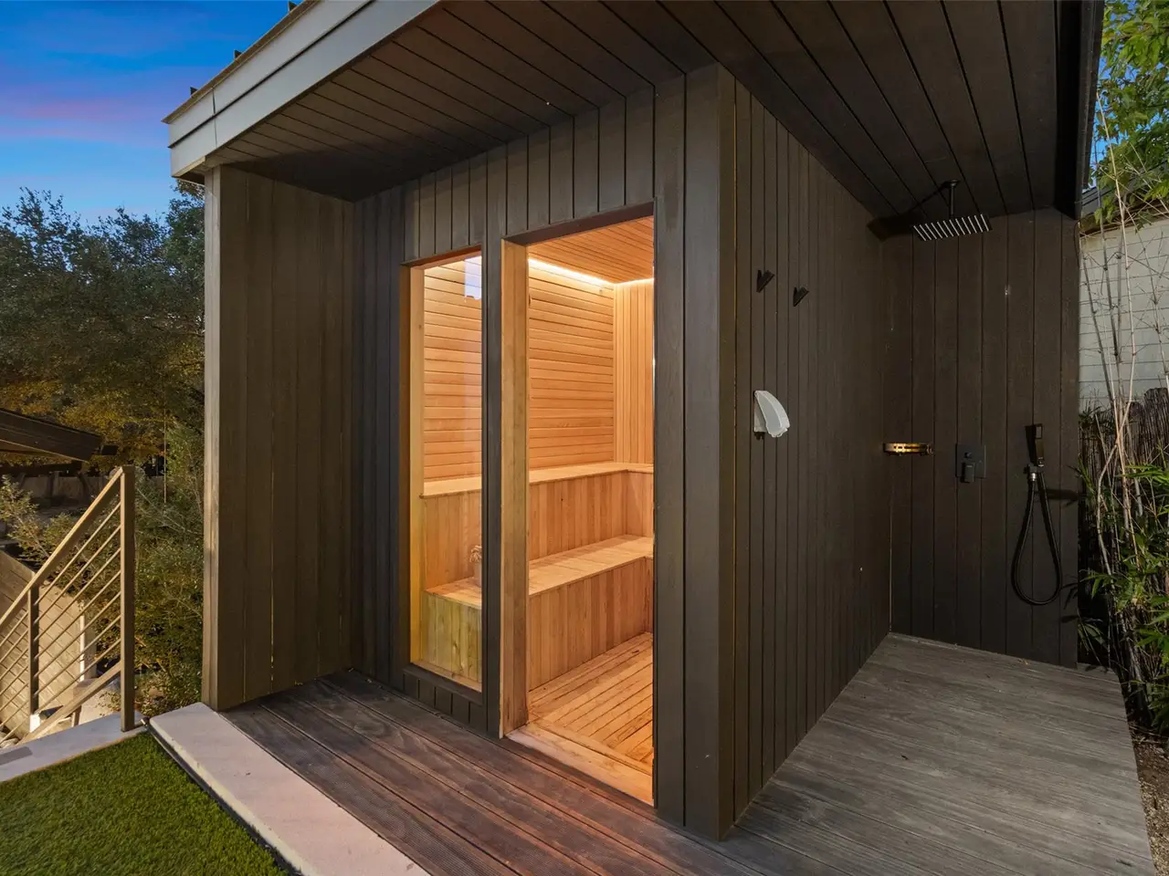 Outdoors, resort-style amenities include a 20' x 40' infinity pool, integrated spa, eight-seat sauna, outdoor shower, and putting green. A pre-designed 1,100-sqft cabana offers potential for a gym, studio, or entertainment pavilion. Terraced landscaping and LED lighting elevate the setting after sunset.