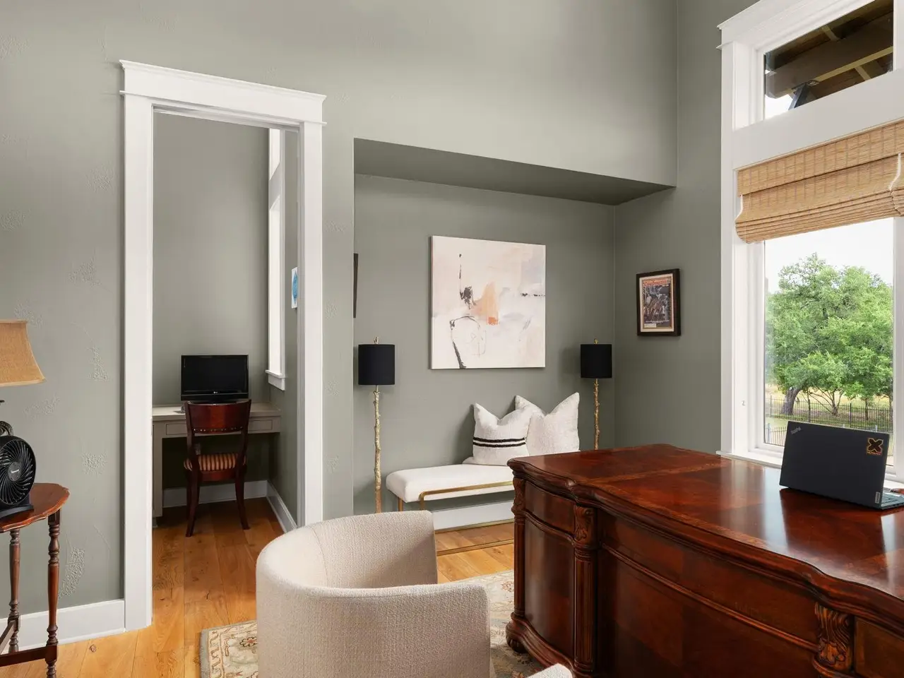 The Primary Suite offers a private deck, dual closets, and a spa-like bath. The nearby bedroom, currently the office, functions beautifully as nursery or guest room, and the Casita, just off the front courtyard, also serves beautifully as an office or guest suite with private full bath.