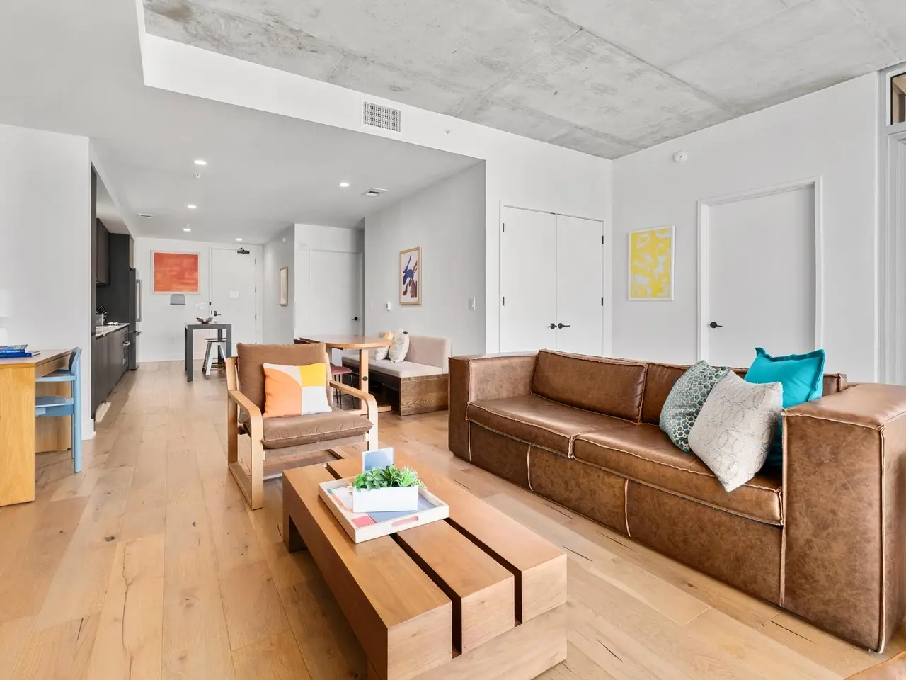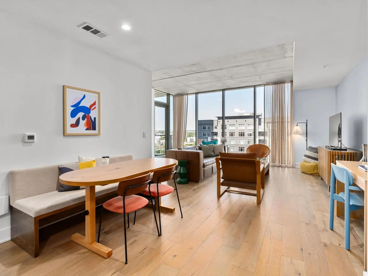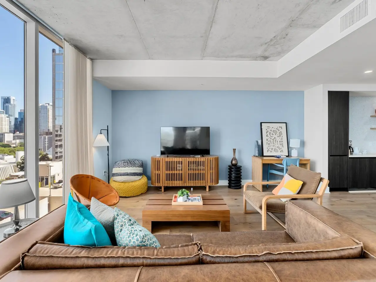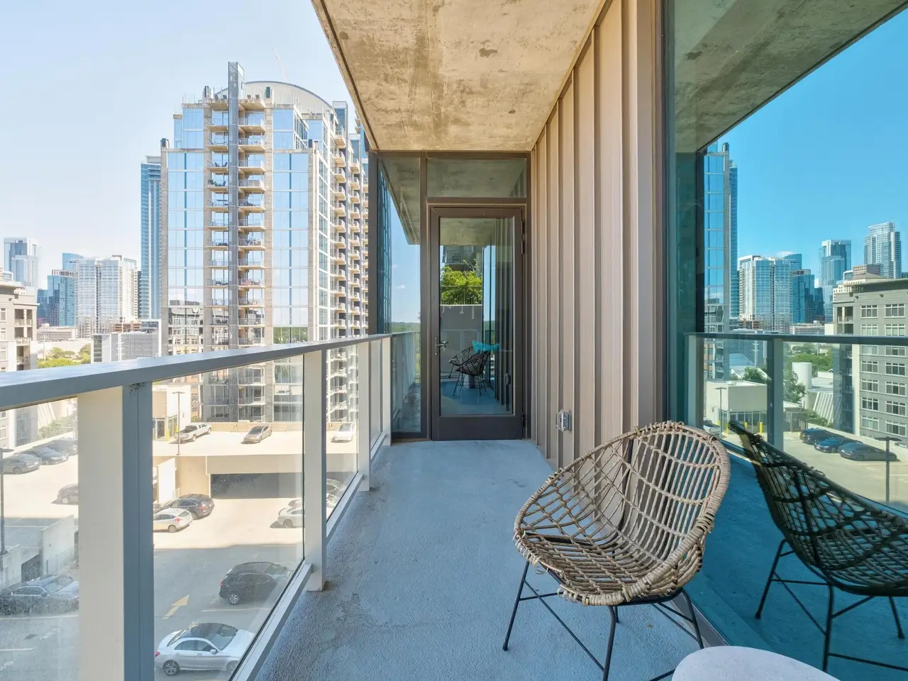 Located on the southeast corner of Natiivo Austin, Unit 1310 is a stunning ADA-compliant, two-bedroom, two-bathroom residence offering a modern and luxurious living experience. The fully furnished unit features an open-concept design with smooth-finished 10-foot ceilings and floor-to-ceiling glass doors and windows, creating a bright and airy ambiance. A private terrace provides a seamless indoor-outdoor connection with expansive views. The European-style kitchen boasts sleek cabinetry with contemporary hardware and premium European-style plumbing fixtures, perfect for both everyday living and entertaining. Stylish and turnkey, this unit exemplifies elevated urban living in the heart of Austin. Natiivo is a new concept in hospitality that offers a flexible ownership. As a high-end hotel, it allows owners the unique opportunity to reside part-time and lease their condos as a short-term rental with the service and luxury that comes with a hotel. Housekeeping and 24-hour concierge service are also available on-site. Take advantage of the full suite of luxury amenities, including a rooftop pool, a 33rd-floor clubhouse, an outdoor terrace and garden, keyless entry, a fitness center, bike storage, a dog run, and a pet washing station. *Utilities (water/electric) are metered and billed to the owner on a monthly basis. TV and internet are $47 / Month.