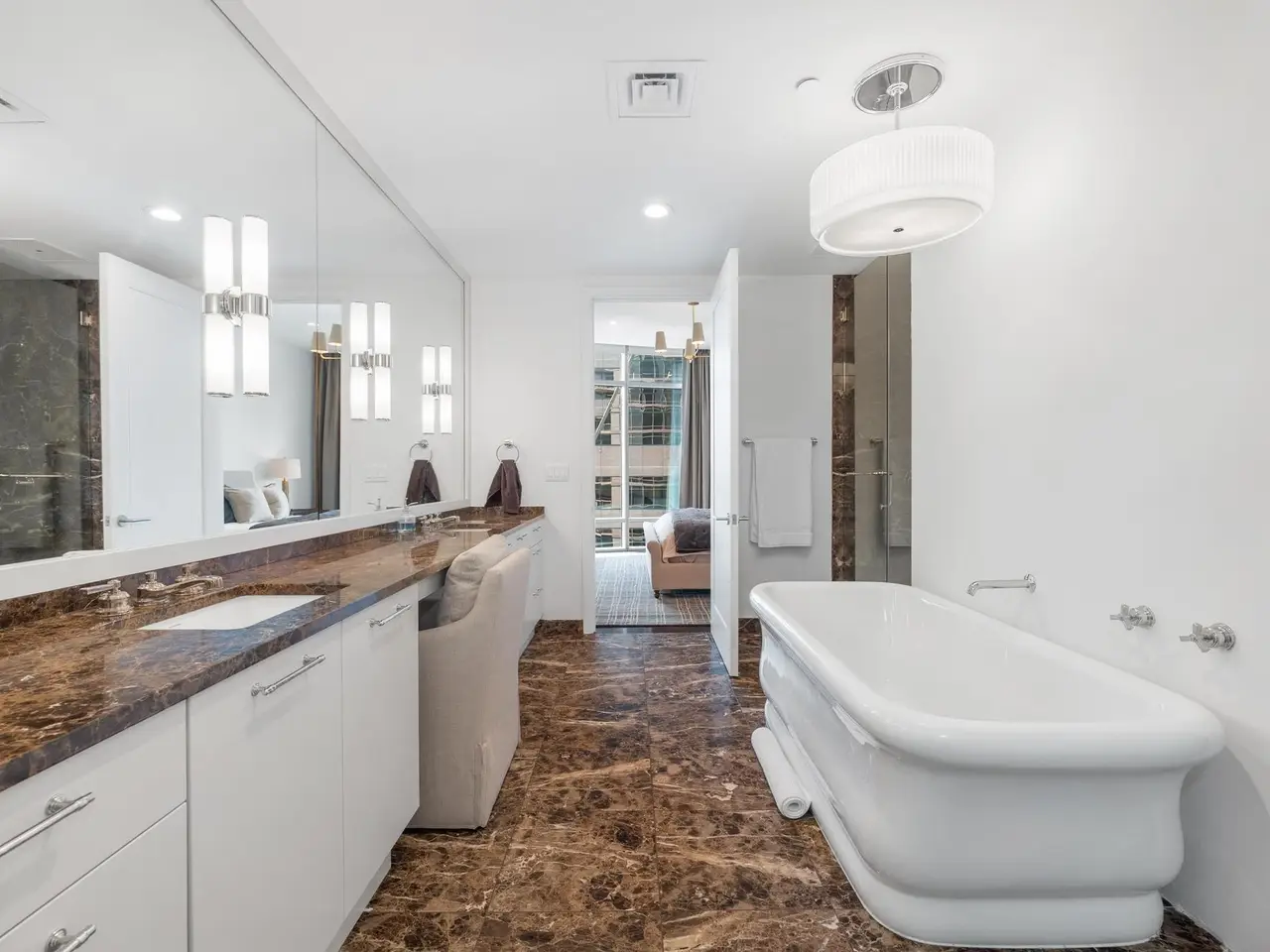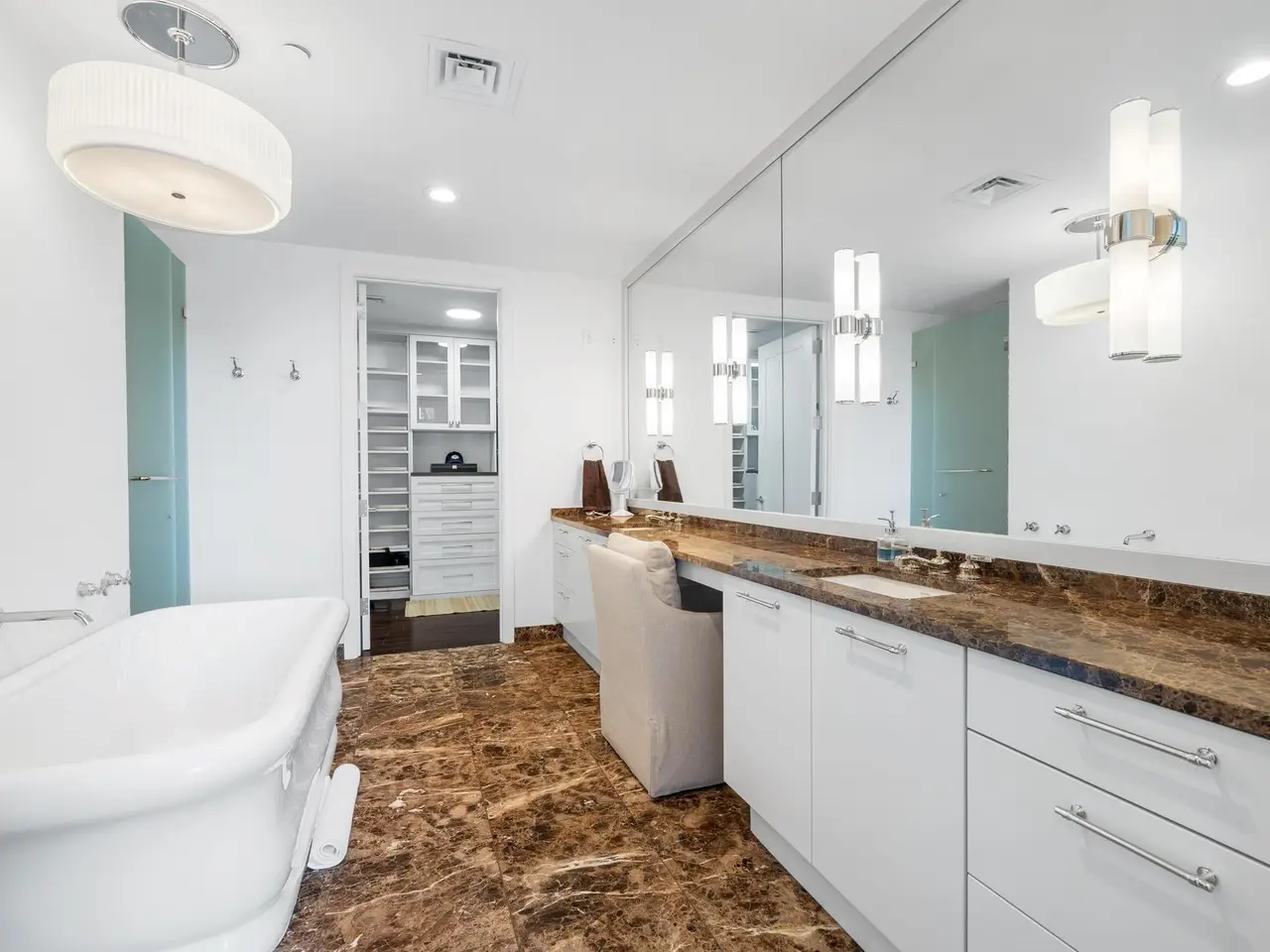 - Expansive primary bathroom with dual sinks, soaking tub, and walk-in shower