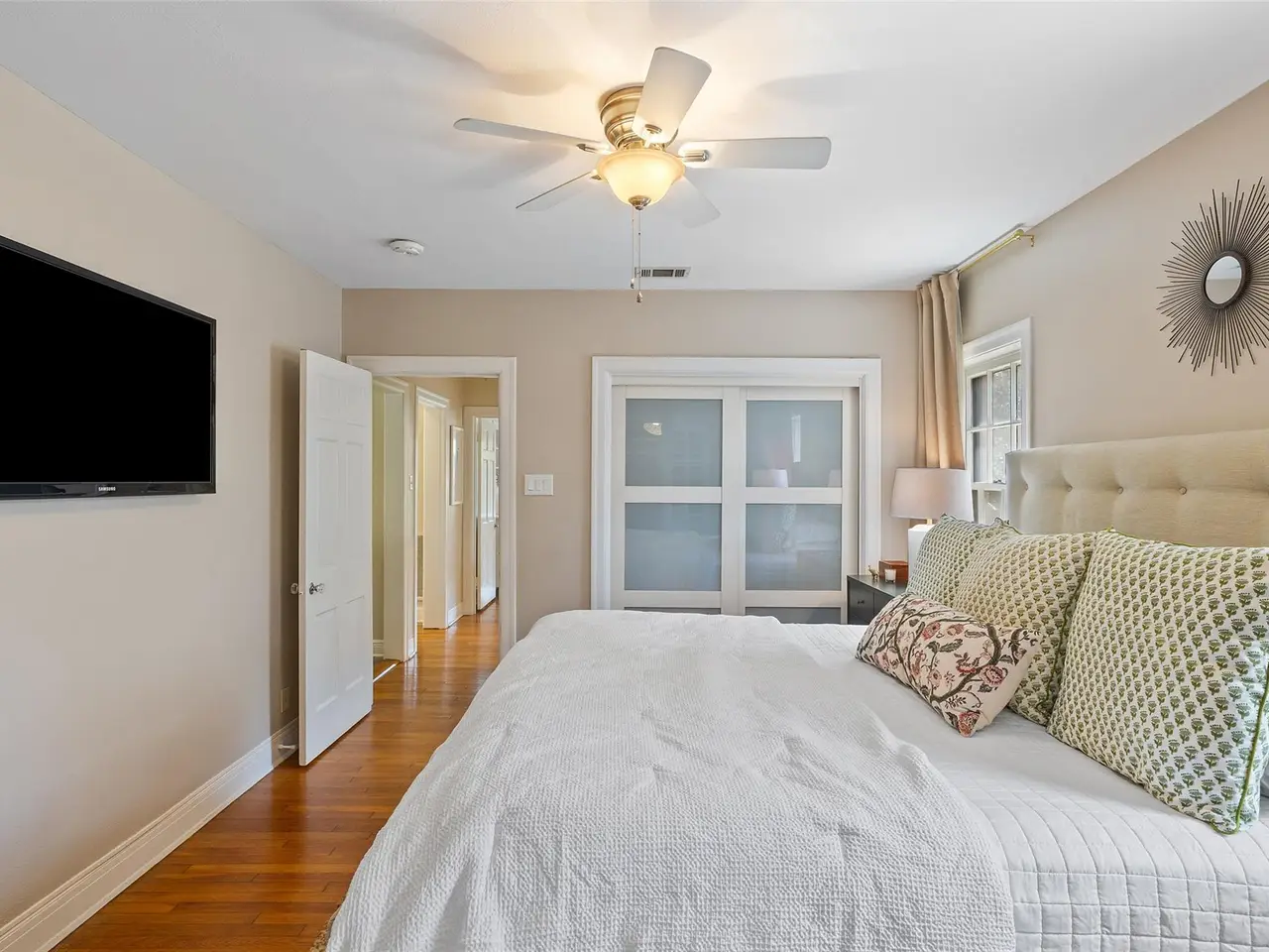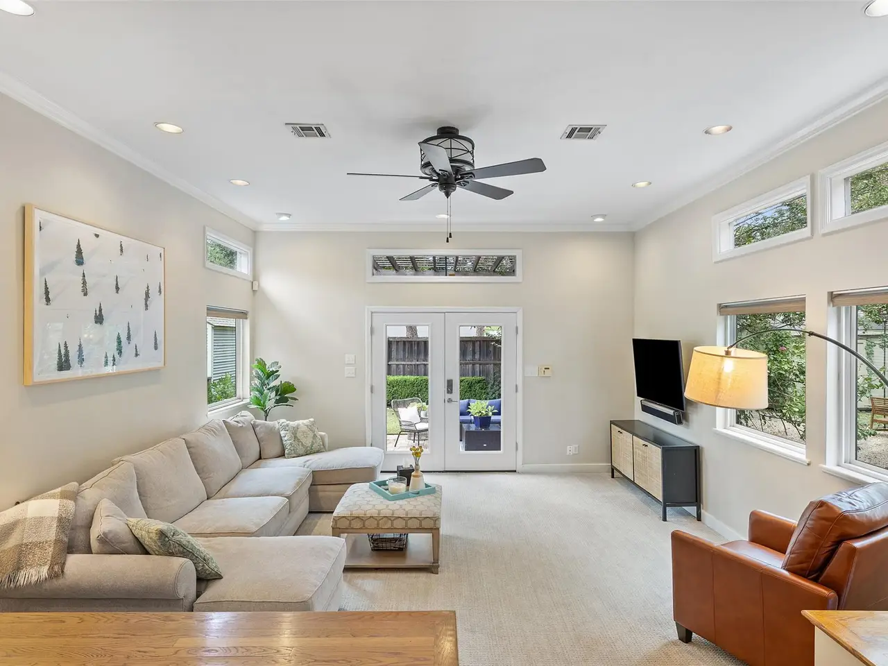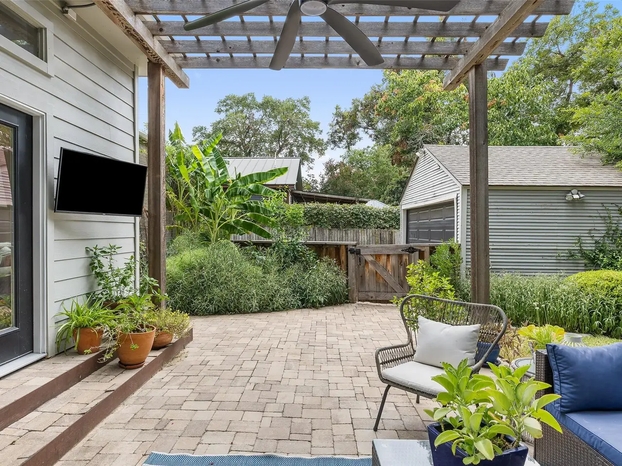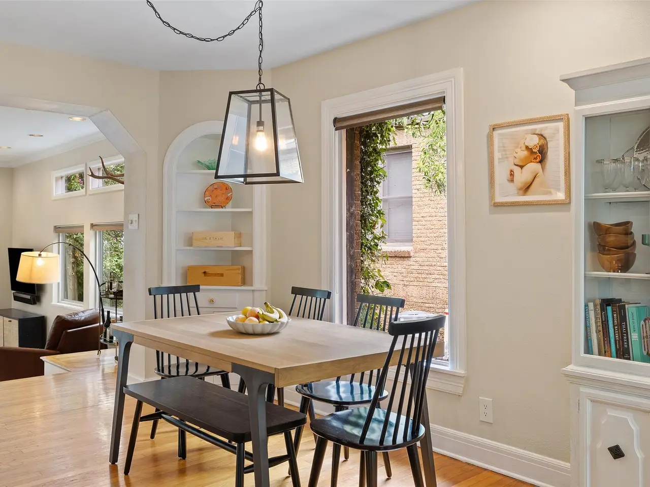 Welcome to 1510 Hartford Road, a timeless 1940 residence lovingly updated to pair modern comfort with classic character. From the moment you step inside, the charm is undeniable--corner windows in the front living room frame views of the porch and yard, bathing the space in natural light. This inviting area flows into the kitchen and dining room, where dark green cabinetry, counter seating, and a statement chandelier strike the perfect balance of style and function.Just beyond, a sunken living room offers a cozy yet open atmosphere with built-in shelving, expansive windows, and French doors to the backyard. It's a versatile space--ideal for gatherings, quiet evenings, or simply enjoying the home's abundant natural light.The primary suite has been re-imagined as a true retreat. A custom walk-in closet with a center island connects seamlessly to a light-filled bathroom featuring dual vanities and fresh, modern finishes. A spacious second bedroom and full bath complete the interior, offering comfort and flexibility for guests, family, or a home office.Out back, a covered porch with a mounted TV sets the stage for relaxed evenings, while the grassy lawn offers room for pets, play, or gardening. A detached two-car garage with a long private driveway adds convenience and storage.Situated in the coveted Old Enfield neighborhood, 1510 Hartford Road places you moments from Clarksville's shops, restaurants, and parks, as well as the University of Texas, the Texas Capitol, and Downtown Austin. With its rich character and central setting, this home is a true Central Austin treasure.