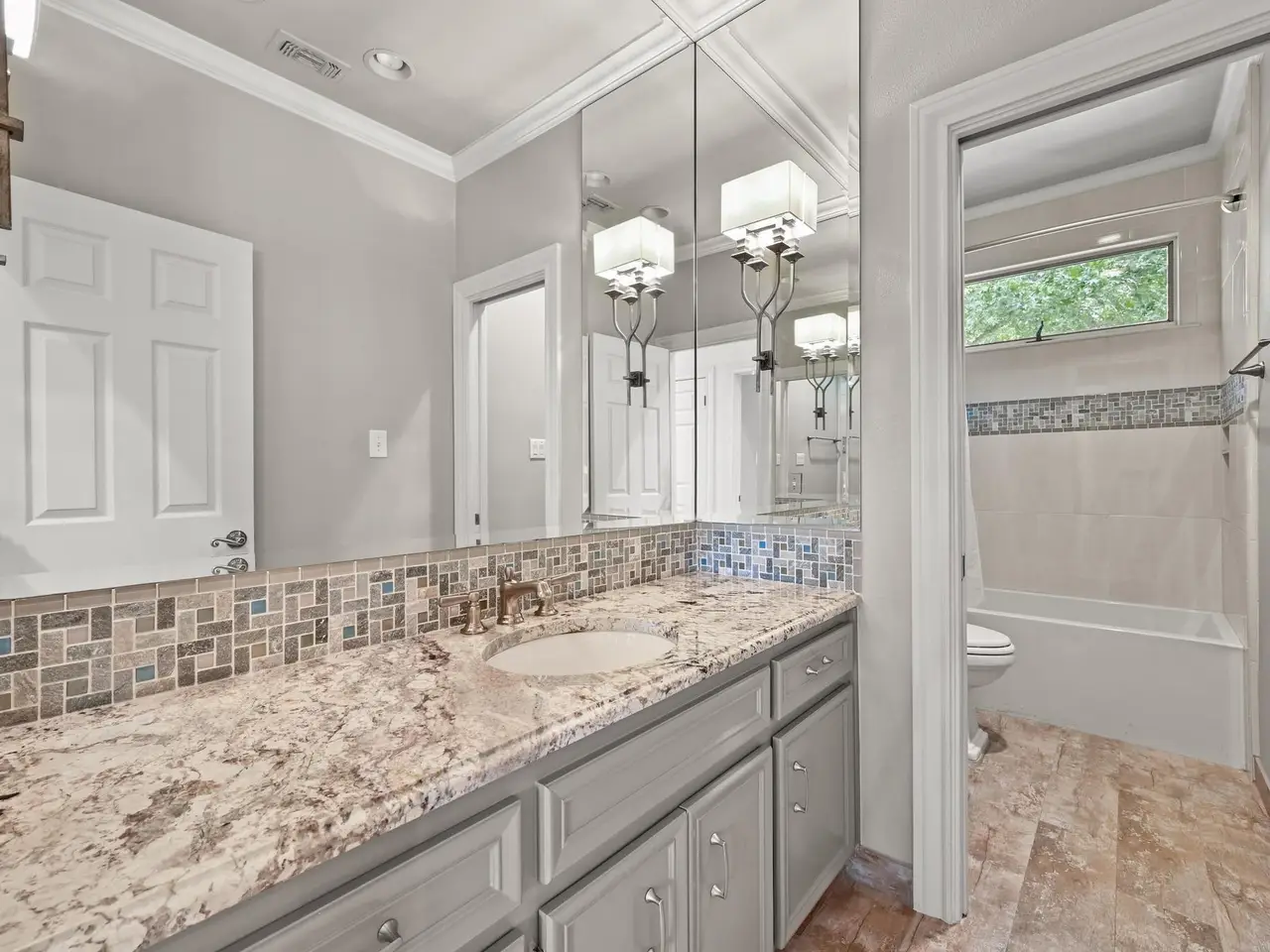 Built in 1982, this beautiful Traditional home has been thoughtfully updated. The slurred stone exterior radiates charm on the fully manicured .67 acre lot. Wood beams encase the front entrance porch and double glass doors. The entrance foyer opens to both the formal and informal living areas, providing easy flow through the downstairs. The formal dining room is adjacent to the formal living room. The newly remodeled kitchen has stainless appliances, a center island and plenty of counter space on the breakfast bar. The kitchen overlooks the covered back patio, pool and backyard. Enjoy an extra dining area off the kitchen. The informal living room has a wet bar with storage, overlooks the front yard, and is open to the kitchen and breakfast area. A delightful mud room adjoins the garage, providing 4 "cubbies", an extra refrigerator, ice maker, extra storage and exterior door to the pool. There is one secondary bedroom on the main level with a full bathroom. A primary suite was added over the garage several years ago with stunning windows overlooking a majestic treaty oak tree. The primary bathroom is a cozy retreat with double vanities, oversized shower and gorgeous walk in closet with built in cabinets. 3 additional bedrooms are located upstairs with one full bathroom. A large game room is also upstairs. The laundry room was added upstairs and is a dream come true! Tons on storage and plenty of counter space make this an ideal craft room as well. The backyard has a newly resurfaced and tiled pool and spa. The lot backs to a hillside, providing privacy and beautiful landscaping. West Rim HOA owns a park on Lake Austin within walking distance of the property. Homeowners enjoy a playscape, tennis court, basketball court, gazebo with grill, picnic area, day dock, kayak & paddle board storage and a 20 boat slip marina.