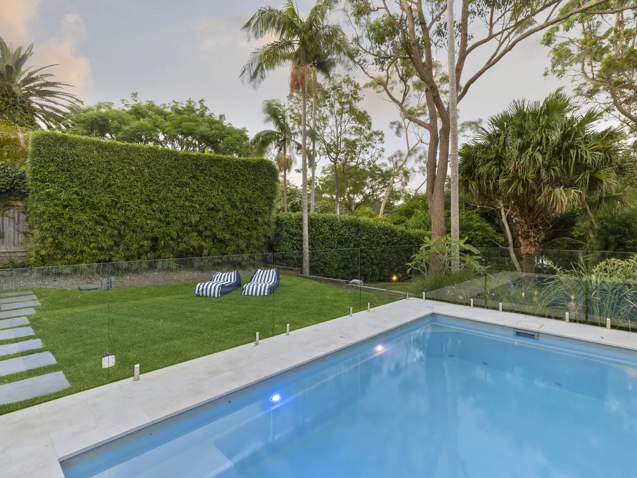 Solar-heated saltwater pool with landscaped gardens