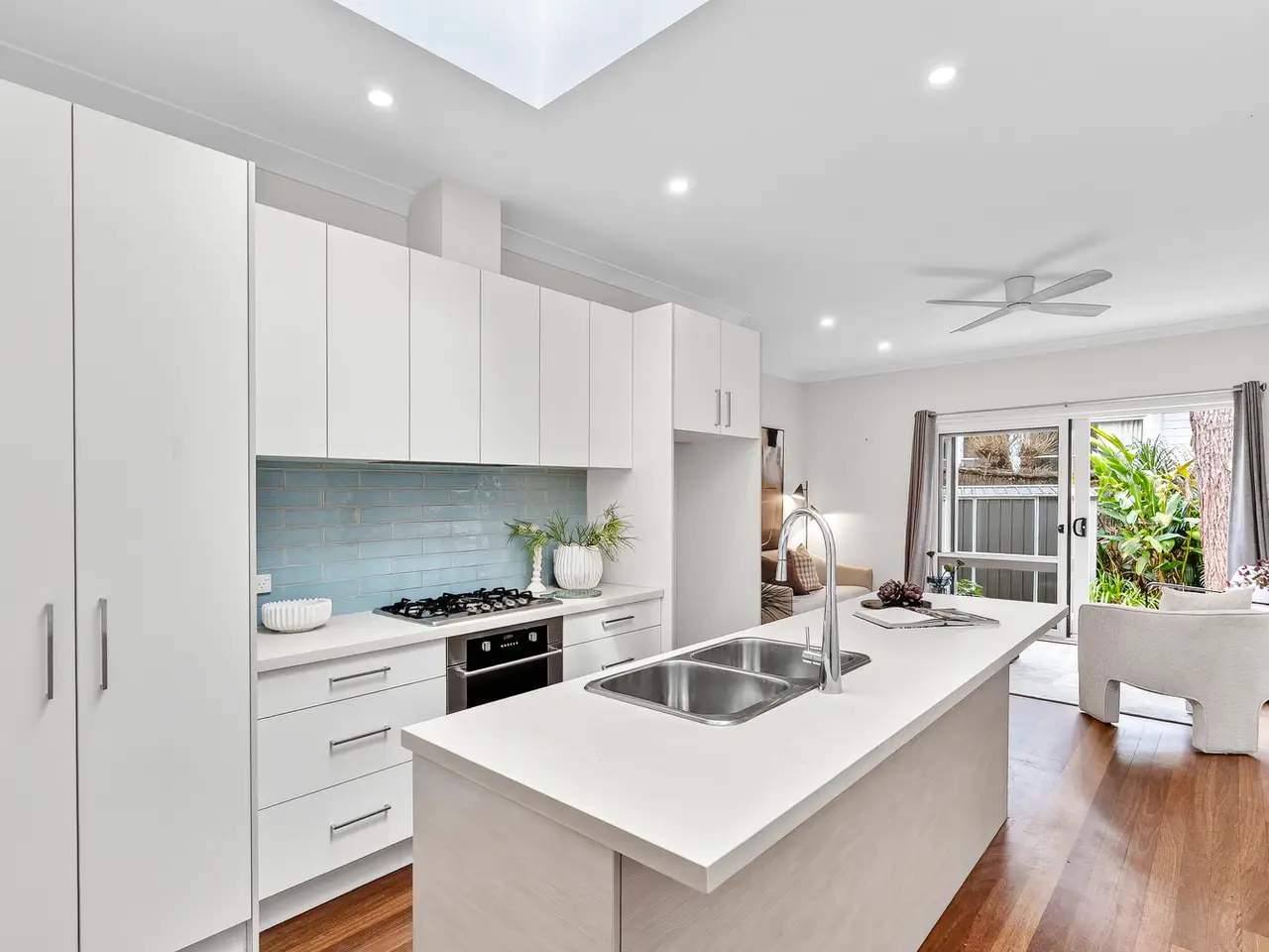 French doors to decks - Skylit island kitchen with stone benches