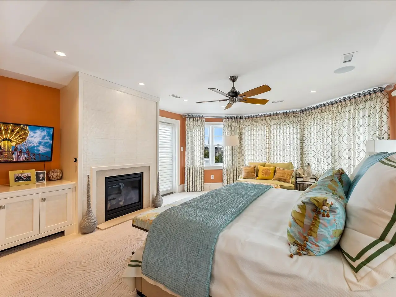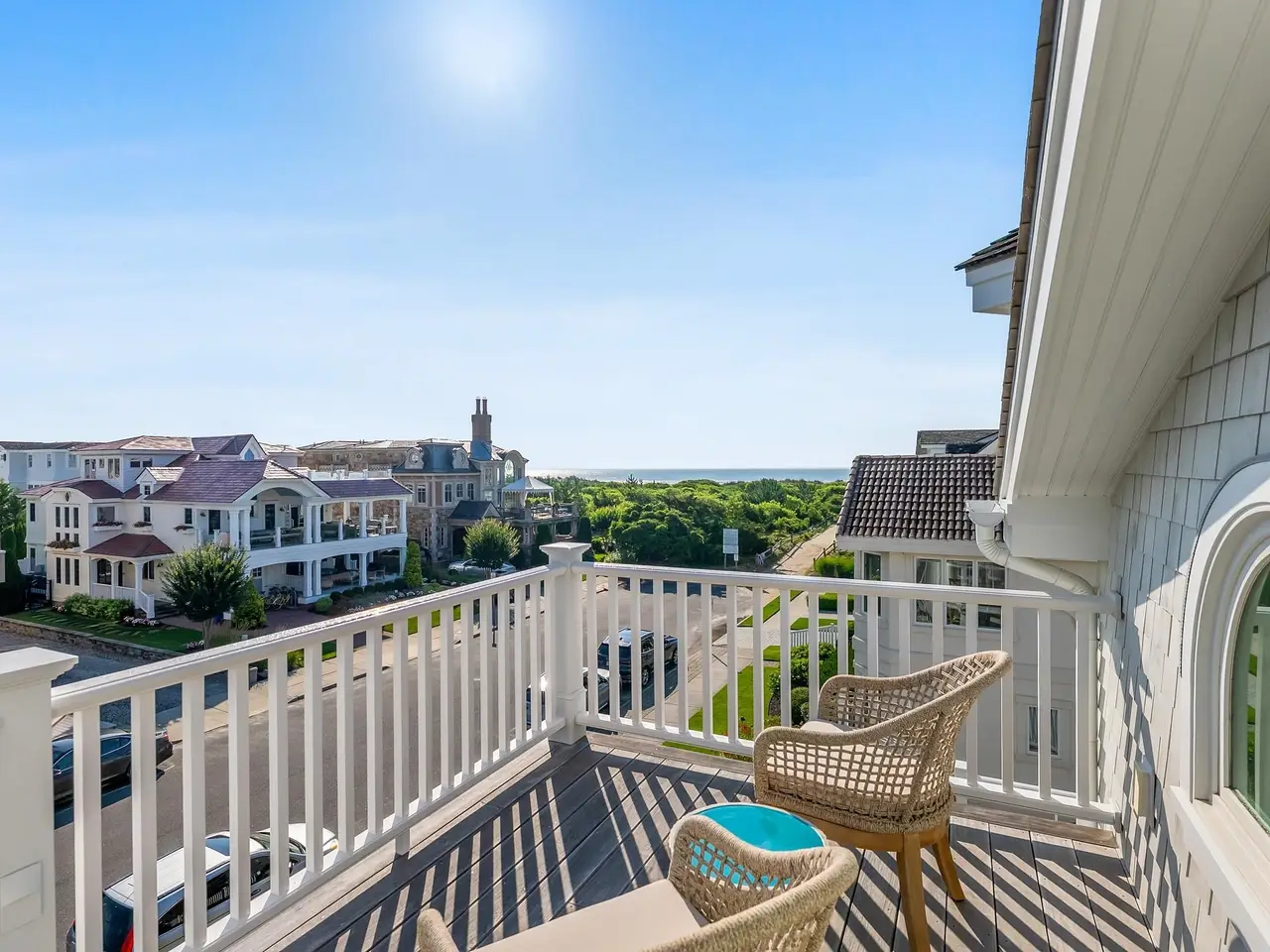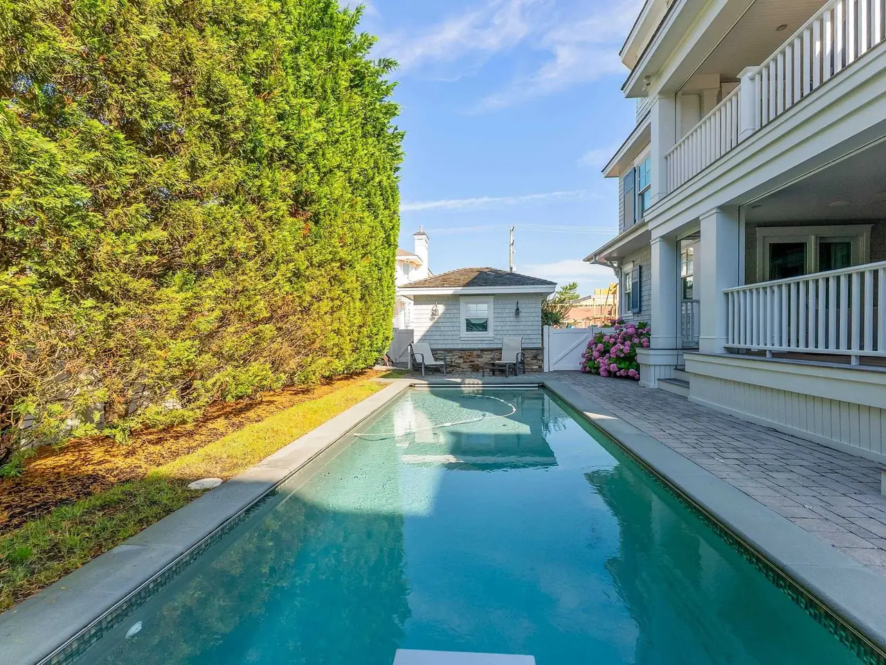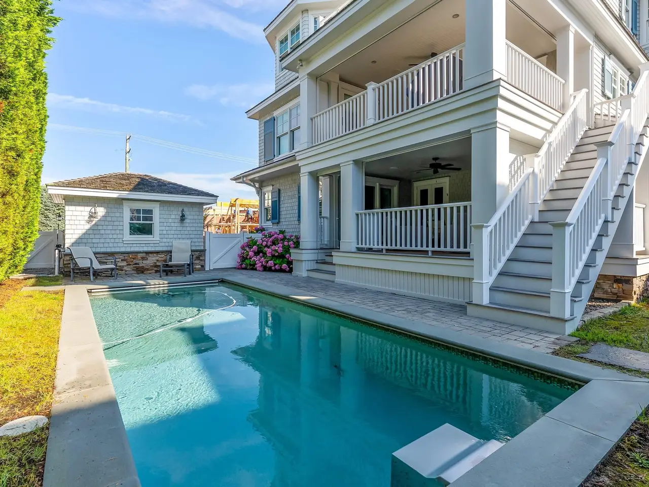 Welcome to 182 65th Street, a stunning summer haven located only 2 homes from Avalon's premier south end 65th St. beach. Completed in 2013, the home was expertly crafted by architect Paul Kiss of OSK Architects, meticulously built and continuously updated by Brandywine Builders, and professionally decorated by Joyce Pearl of Interior Concepts Design of MD. The high-quality design features and bespoke materials reflect superior craftsmanship in every detail. The decor captures a tranquil island-inspired vibe intertwined with refined finishes, all in pristine condition due to very light seasonal usage by owners - home presents like it was just finished very recently and is the ideal beach retreat for creating cherished family memories for generations to come. The three stories flow seamlessly with hardwood floors, installed and honed in place throughout all areas of the home. Entering from the driveway you will find a four-stop elevator for convenient transport of luggage and groceries, plus an electric car charging outlet. Ascend the front steps to a mahogany wraparound deck where a grand custom entry door awaits. Entering the first floor, French doors lead into a spacious family room with wet bar and sliders that open onto the covered front deck. Down the hall, three generously sized bedrooms each equipped with ensuite baths await, one enhanced by a decorative wall of opaque dune reeds and grasses evocative of a serene spa atmosphere. The two rear bedrooms offer sliders leading to the four season back porch which opens directly to the backyard pool area. The porch features motorized shutters on all sides allowing for privacy and can be adjusted for open-air enjoyment. The full southern exposed pool is a standout feature complete with an "endless pool fast lane" w power cover for seasonal use. Also on the first floor, a separate east side entrance leads into a full-size laundry room with side-by-side washer and dryer, ample storage closets and hall cabinetry housing the full home 'Creston' integrated technology system. The second level showcases an impressive great room spanning the north and east sides of the home, complete with a wet bar, soaring cathedral ceiling, and gas fireplace with a dramatic wave inspired cove lighting carved fixture reaching to the ceiling. The great room offers sliders onto the front wraparound sundeck ideal for lounging and soaking in the breathtaking ocean views. The kitchen is designed for the culinary enthusiast, featuring premium cabinets, countertops, and appliances, including a custom built-in refrigerator. A second enclosed four season porch off the rear of the kitchen provides additional space for outdoor dining and motorized shutters for added privacy and protection during the off-season. This level also includes a junior master suite with its own access to the rear porch, as well as a charming turreted sitting area with plantation-style ceiling opening onto the front wraparound beach view deck. The third level master suite is the crowning jewel of this home. Indulge in luxury with a full-sized ocean view gym featuring soundproof flooring, a private turreted room on the east side with it's own deck for morning coffee to take in the spectacular ocean sunrise, and a lavish master bath equipped with a jetted tub and heated floors. This owner's retreat features an additional deck off the bathroom & bedroom, a separate powder room, gas fireplace, a wet bar, a second stacked washer-dryer, and spacious walk-in closet. With countless exceptional features, 182 65th Street is a must-visit property that embodies a luxurious tropical essence within a captivating coastal environment. Offered furnished w exclusions.