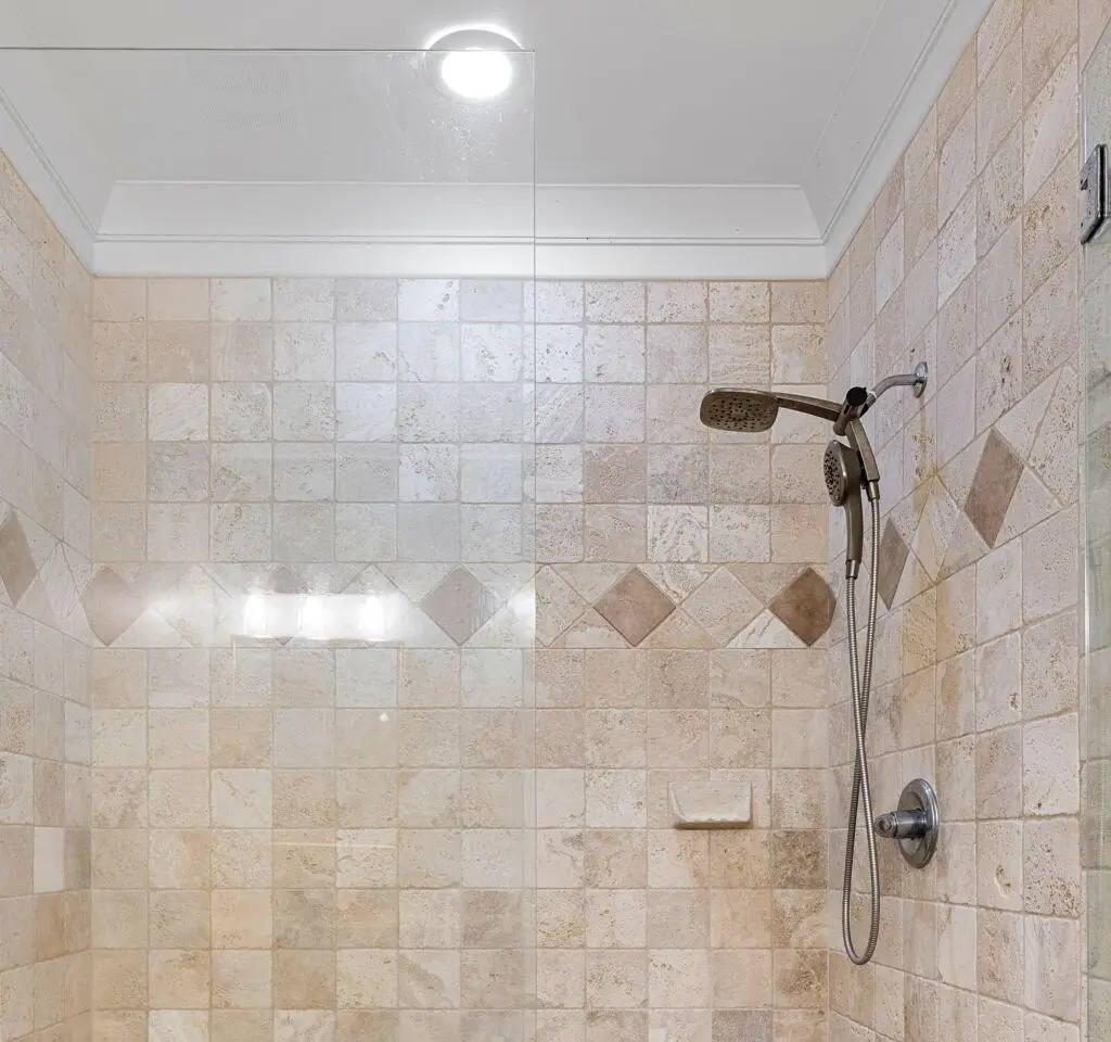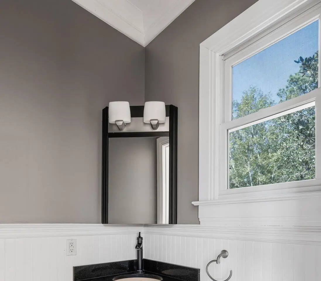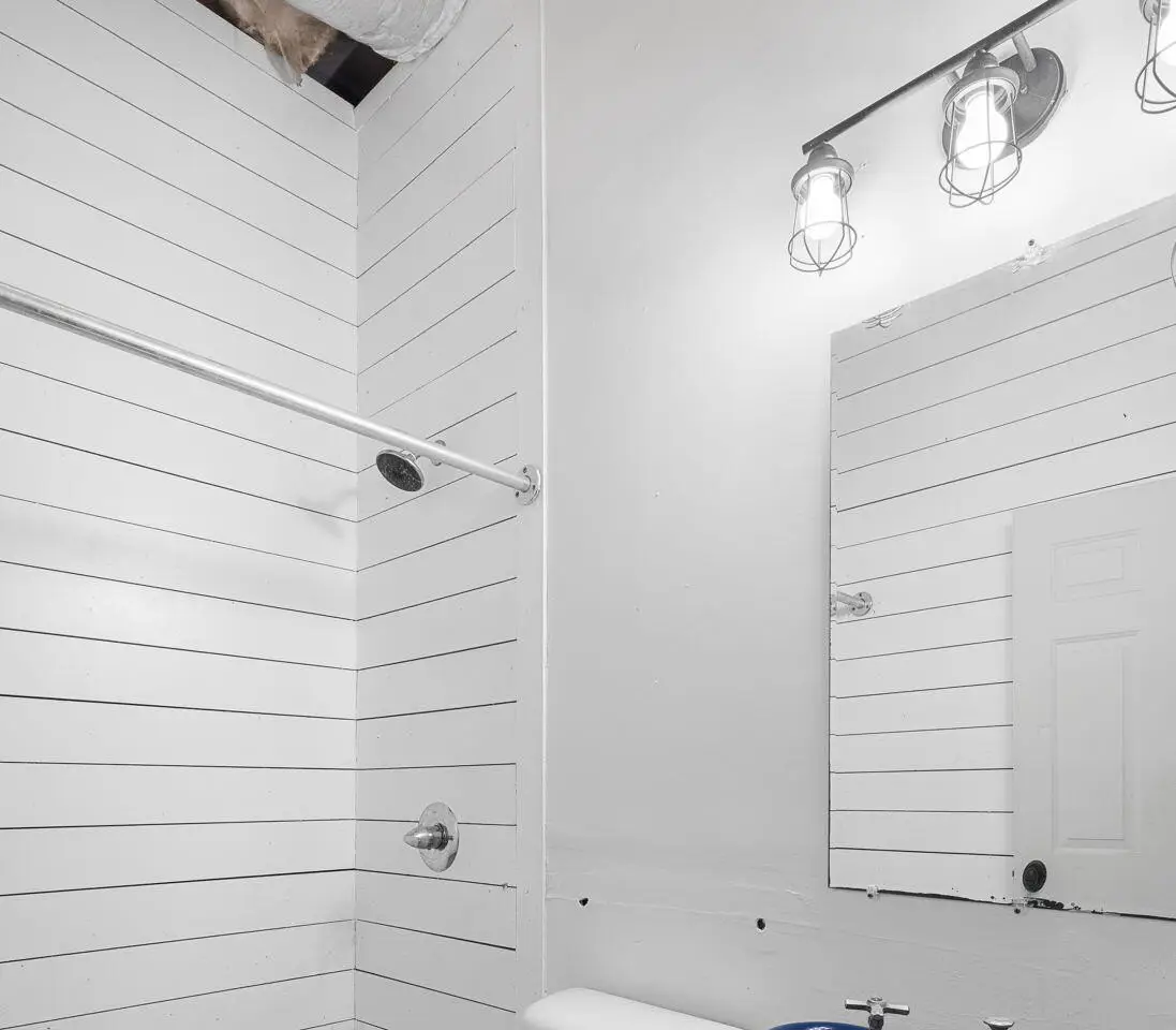Side-loading, enormous two bay garage Scrub/mud bathroom space