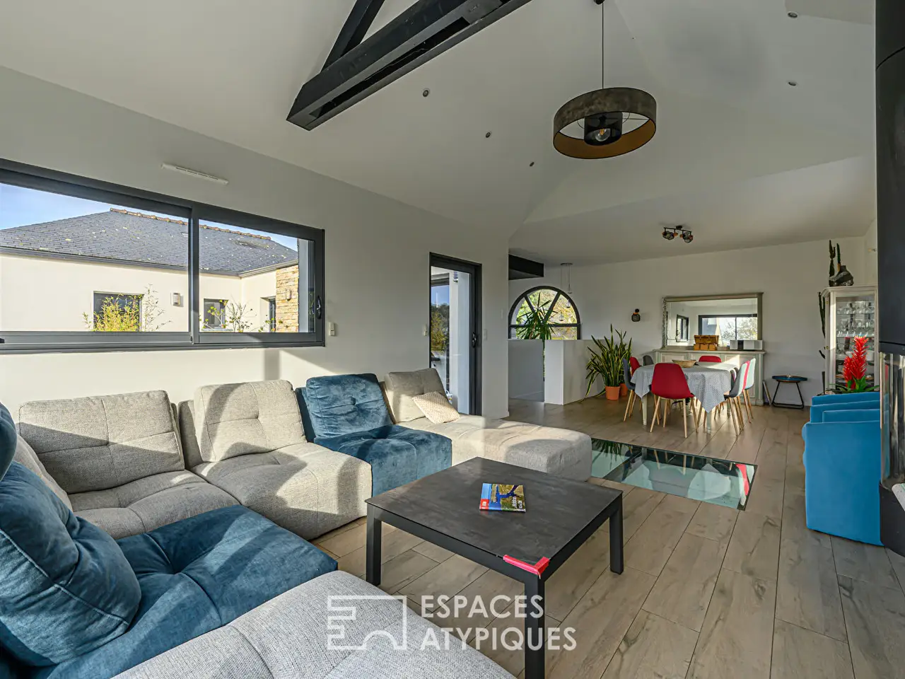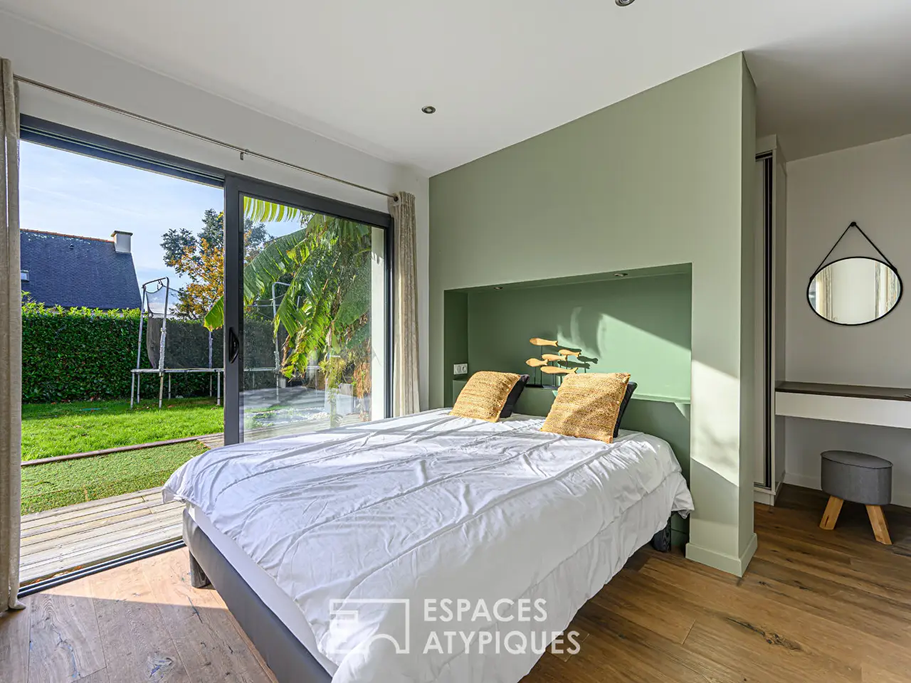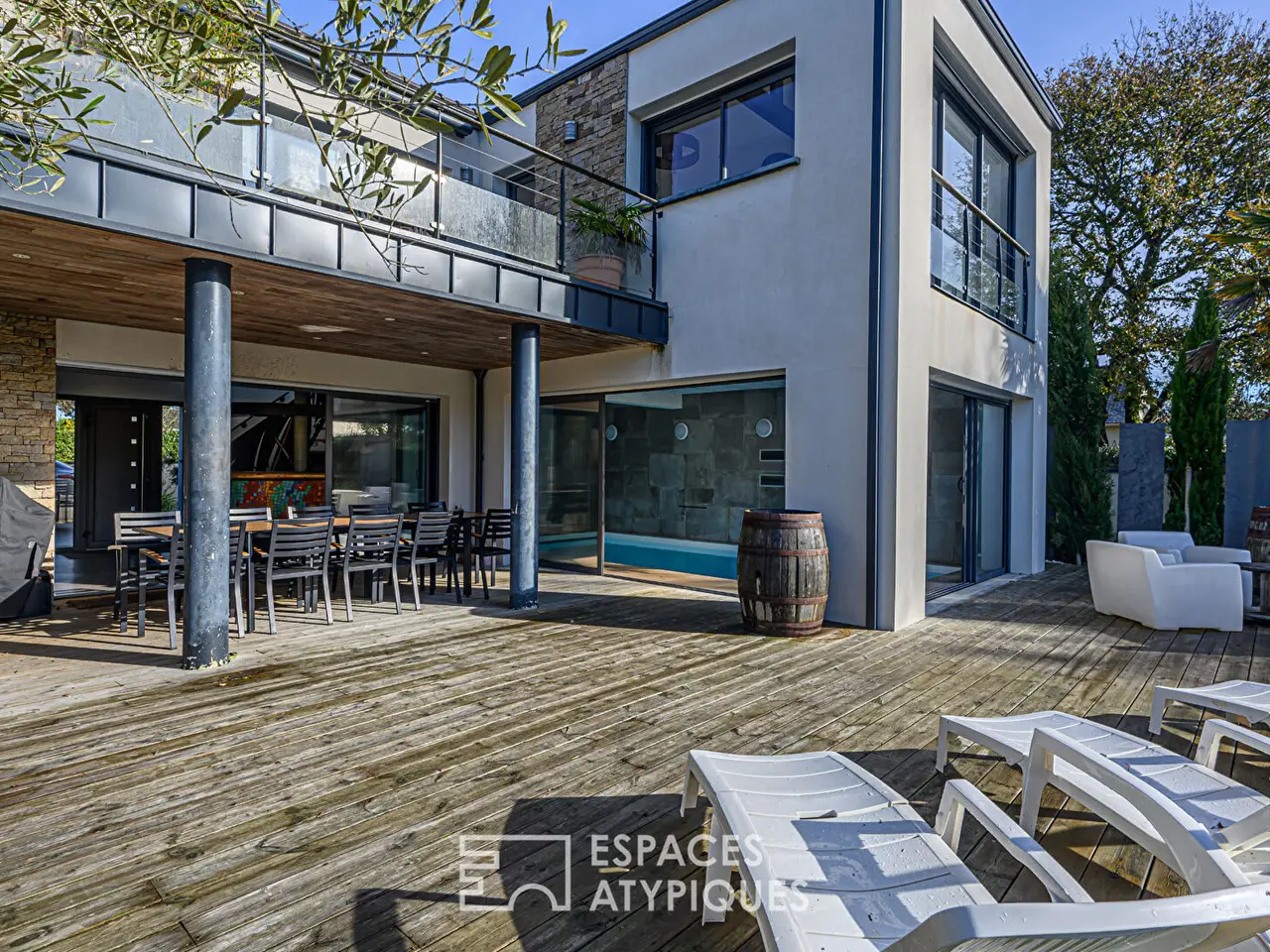 In Baden, this contemporary house of 186 m2 offers an exceptional living environment, combining elegance and functionality. Located on a plot of more than 640 m2, it stands out for its neat design, its generous volumes and its distant view of the Gulf of Morbihan. With its 6 rooms spread over two levels, this property combines bright living spaces and high-end services. On the ground floor, a welcoming entrance with a bar sets the tone. An indoor swimming pool, accompanied by its shower and toilet area, invites you to relax all year round. Two bedrooms, one of which with a dressing room and private bathroom, complete this space. A linen room, a laundry room and additional toilets blend harmoniously into this configuration. The upper floor reveals a vast living room bathed in light, thanks to large bay windows and an impressive ceiling height. A suspended wood stove reinforces the warm atmosphere of this space. The open, fitted and equipped kitchen is part of a contemporary design. Two bedrooms, a shower room and toilets complete this level. On each floor, a terrace of more than 20 m2 allows you to enjoy the outdoors in complete privacy. The carefully laid out land and the garage provide comfort and practicality on a daily basis. Nestled in a peaceful environment, this house benefits from optimized energy performance, with a DPE classified C and greenhouse gas emissions rated A. Its contemporary architecture, its rare services and its view of the Gulf make it a unique property, ideal for lovers of atypical spaces and refinement. The town centre of Baden is easily accessible from Vannes or Auray via the D 101, which is partially equipped with a cycle path. By car, the N165 and N166 expressways allow you to reach the town in 1h15 from Nantes or Rennes. By train, the high-speed line connects Paris to Vannes in 2h30. Finally, Nantes-Atlantique airport can be reached in 1h30 by car. ENERGY CLASS: C / CLIMATE CLASS: A Estimated average amount of annual energy expenditure for standard use based on 2021 energy prices: between 1820 euros and 2520 euros REF. 410EAM Additional information * 4 bedrooms * 1 bathroom * 2 shower rooms * Floor : 1 * 1 floor in the building * Outdoor space : 641 SQM * Parking : 2 parking spaces