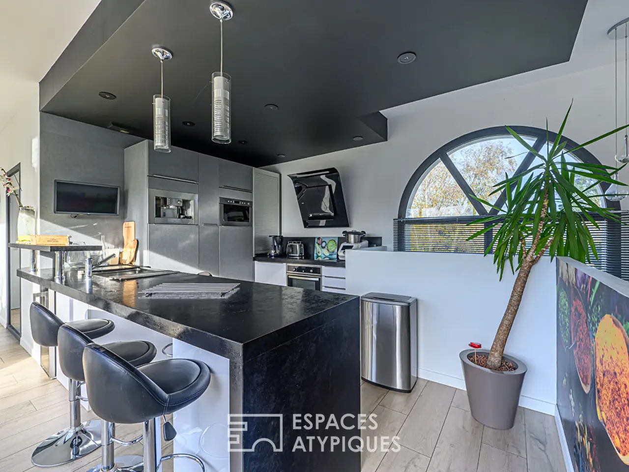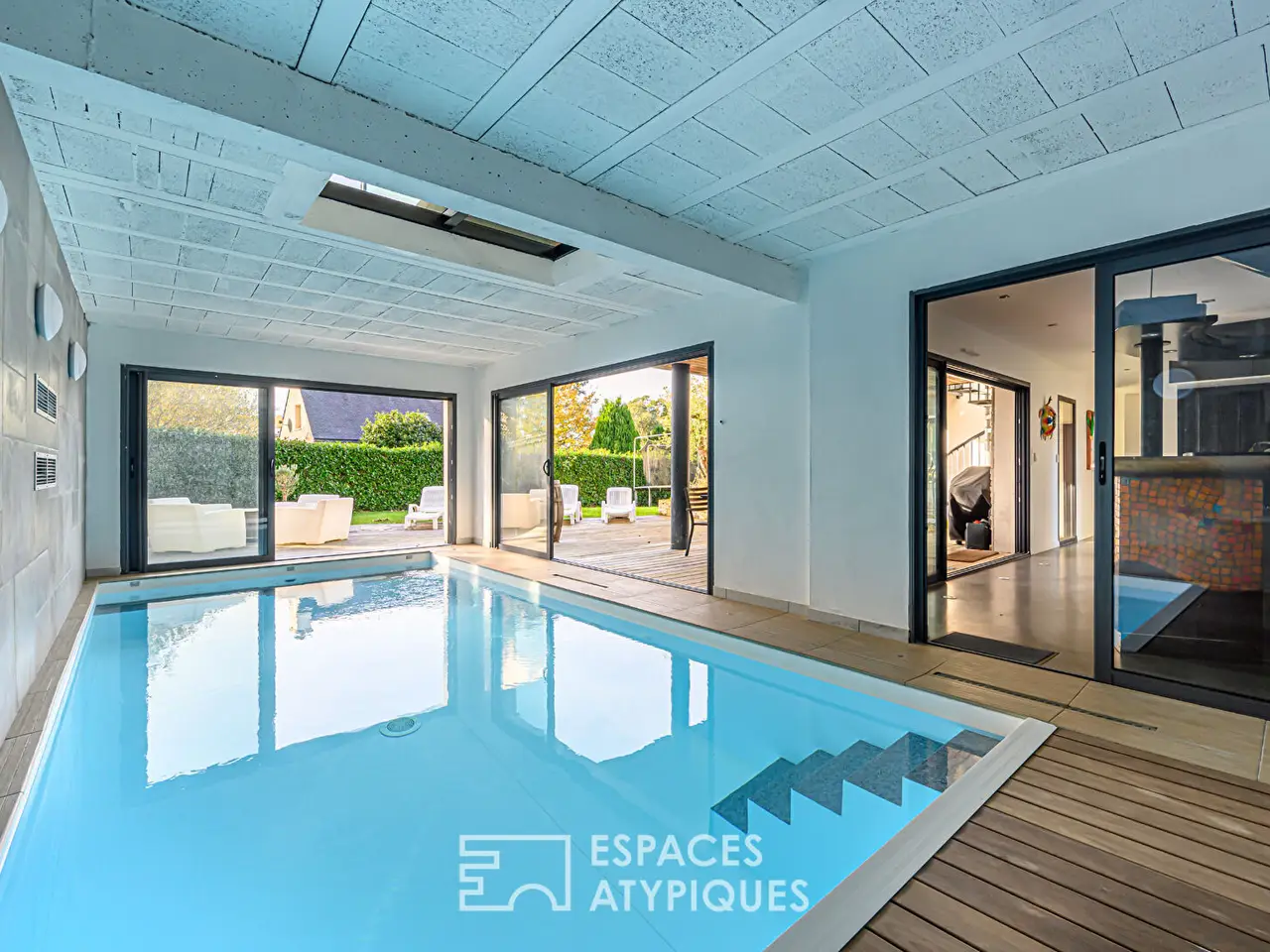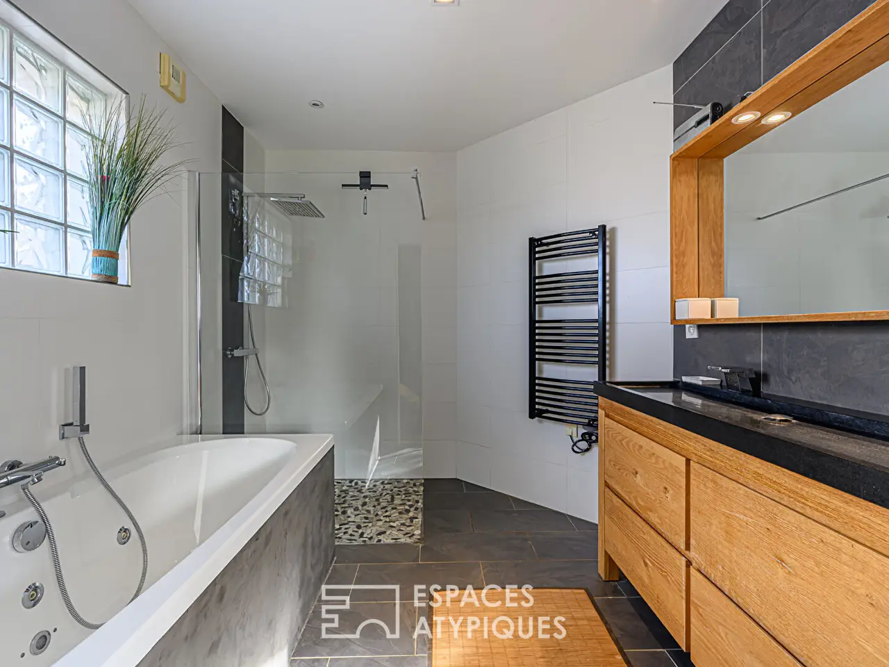 In Baden, this contemporary house of 186 m2 offers an exceptional living environment, combining elegance and functionality. Located on a plot of more than 640 m2, it stands out for its neat design, its generous volumes and its distant view of the Gulf of Morbihan. With its 6 rooms spread over two levels, this property combines bright living spaces and high-end services. On the ground floor, a welcoming entrance with a bar sets the tone. An indoor swimming pool, accompanied by its shower and toilet area, invites you to relax all year round. Two bedrooms, one of which with a dressing room and private bathroom, complete this space. A linen room, a laundry room and additional toilets blend harmoniously into this configuration. The upper floor reveals a vast living room bathed in light, thanks to large bay windows and an impressive ceiling height. A suspended wood stove reinforces the warm atmosphere of this space. The open, fitted and equipped kitchen is part of a contemporary design. Two bedrooms, a shower room and toilets complete this level. On each floor, a terrace of more than 20 m2 allows you to enjoy the outdoors in complete privacy. The carefully laid out land and the garage provide comfort and practicality on a daily basis. Nestled in a peaceful environment, this house benefits from optimized energy performance, with a DPE classified C and greenhouse gas emissions rated A. Its contemporary architecture, its rare services and its view of the Gulf make it a unique property, ideal for lovers of atypical spaces and refinement. The town centre of Baden is easily accessible from Vannes or Auray via the D 101, which is partially equipped with a cycle path. By car, the N165 and N166 expressways allow you to reach the town in 1h15 from Nantes or Rennes. By train, the high-speed line connects Paris to Vannes in 2h30. Finally, Nantes-Atlantique airport can be reached in 1h30 by car. ENERGY CLASS: C / CLIMATE CLASS: A Estimated average amount of annual energy expenditure for standard use based on 2021 energy prices: between 1820 euros and 2520 euros REF. 410EAM Additional information * 4 bedrooms * 1 bathroom * 2 shower rooms * Floor : 1 * 1 floor in the building * Outdoor space : 641 SQM * Parking : 2 parking spaces