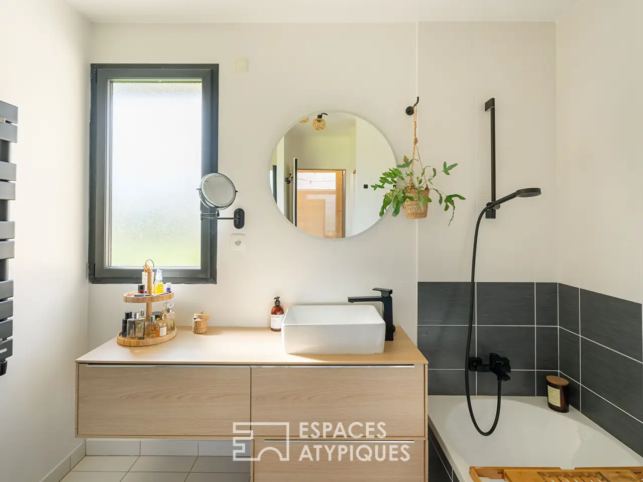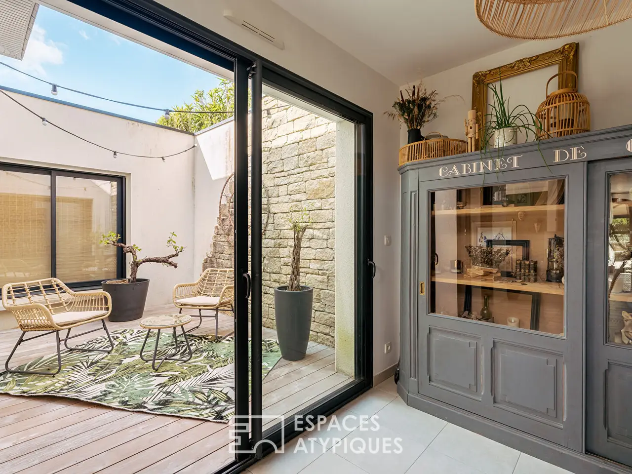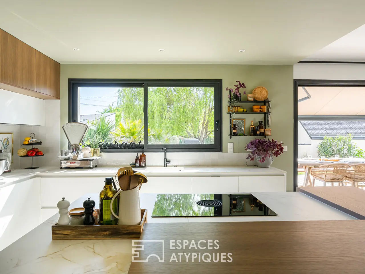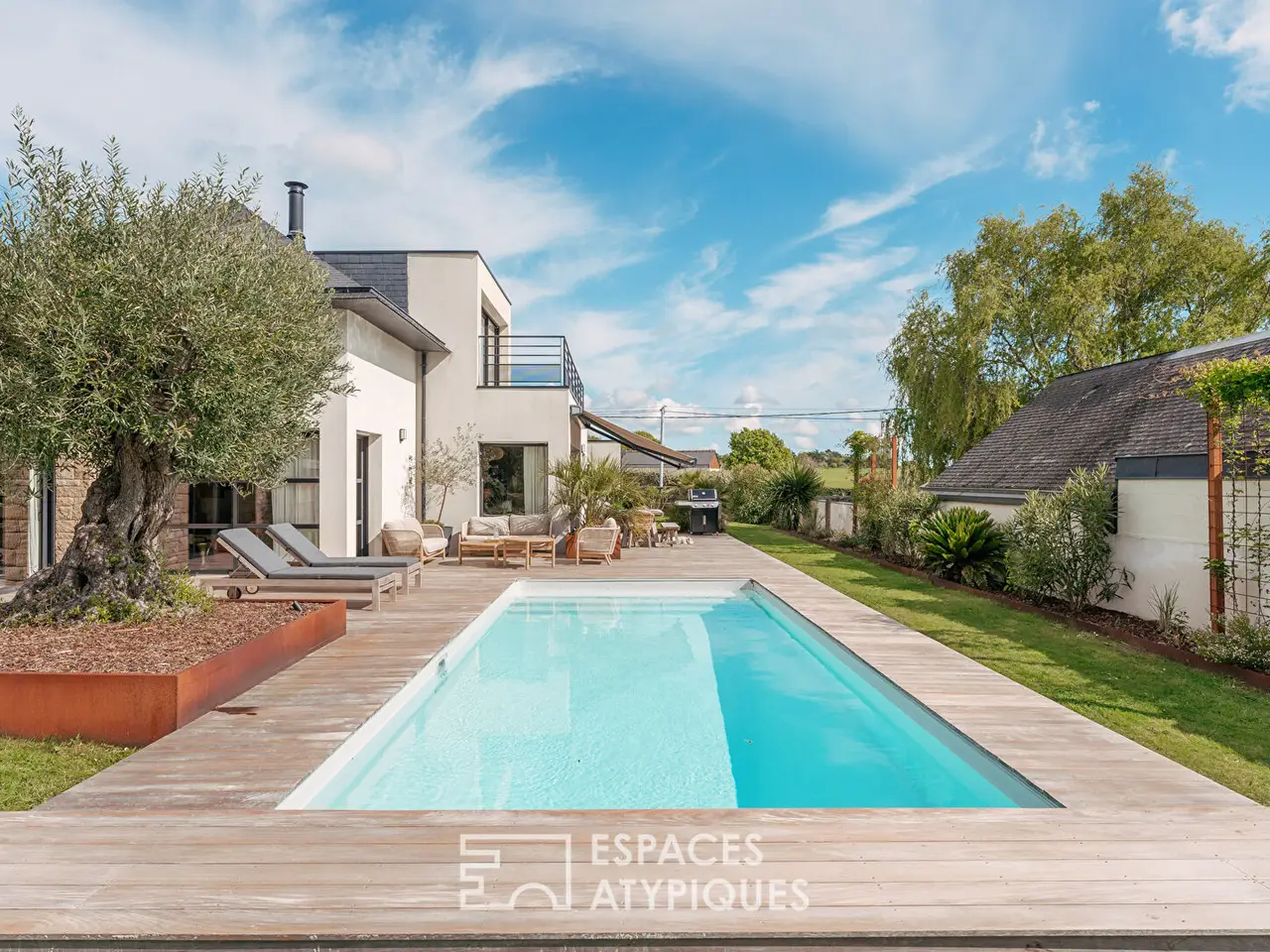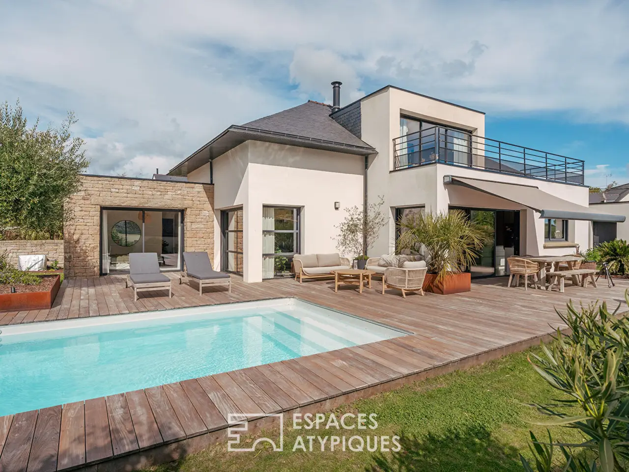 Nestled in a quiet and green environment, just 10 minutes from the beaches of the Gulf of Morbihan, this architect's house located in Baden develops a generous living area of approximately 190 m2, located on a landscaped plot of almost 1000 m2. Designed to combine aesthetics, comfort and functionality, it is distinguished by its atypical shape, its elegant heated swimming pool of 10 x 3.5 m, its terraces, its balcony upstairs, and a fully landscaped garden. As soon as you enter, natural light invites itself through large openings, sublimating the volumes of the living room which is articulated around a wood stove. The kitchen, renovated in 2023, is contemporary and perfectly integrated into the spaces. The master suite on the ground floor enjoys an intimate atmosphere. Upstairs, three comfortable bedrooms open onto a balcony with garden views. A mezzanine, ideal as a reading area or office, completes this sleeping area, accompanied by a family bathroom. The bold architecture, the care taken in the decoration and the technical services (geothermal energy, wood stove) give the whole a remarkable living comfort. Outside, the property reveals a landscaped garden of various species, designed as a real additional living room. The swimming pool, terraces and various relaxation areas allow you to take full advantage of the sunny days. The setting is both intimate and open to the surrounding nature. The location, close to beaches, coastal paths, the market town of Baden, shops and schools, guarantees a sought-after quality of life. A singular property that will seduce lovers of contemporary architecture and harmonious living spaces. ENERGY CLASS: C / CLIMATE CLASS: A Estimated average amount of annual energy expenditure for standard use, based on average energy prices indexed to the year 2021: between €1131 and €1531/year Information on the risks to which this property is exposed is available on the Georisques website: www.georisques.gouv.fr AURÉLIE TATARD 07 62 98 22 96 RSAC Valves 803 683 606 REF. 465EAM Additional information * 7 rooms * 4 bedrooms * 2 bathrooms * Outdoor space : 995 SQM * Property tax : 1 800 € Energy Performance Certificate EPC : 118 kWhEP/m2.year