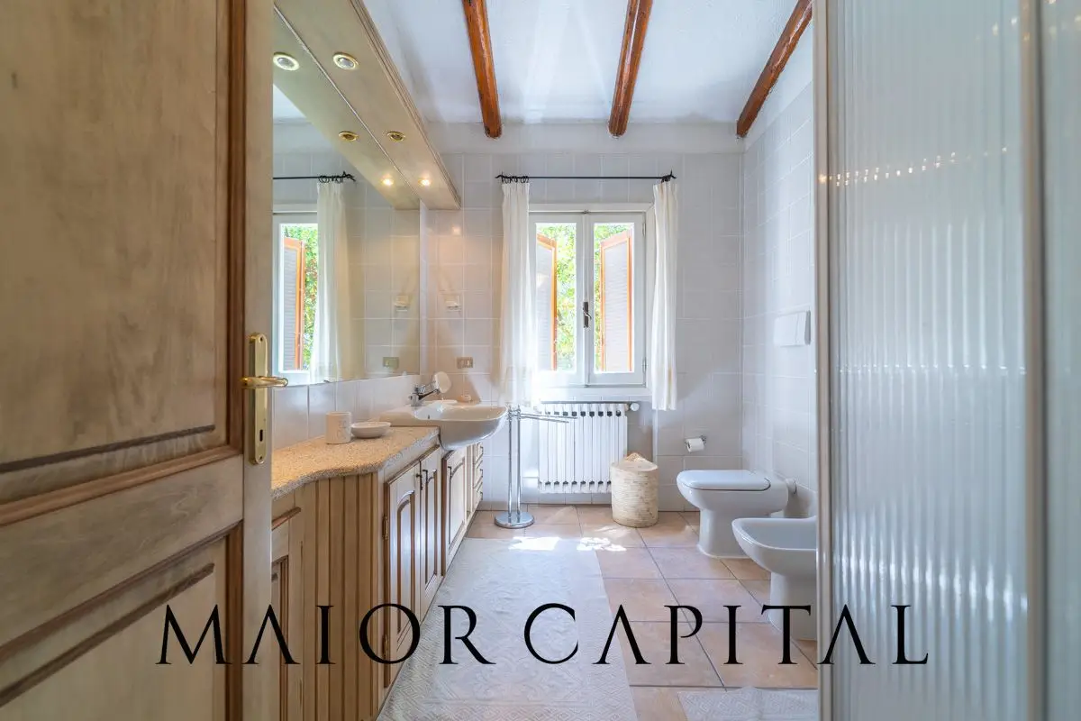 The villa has a garage and ample space for guests. It is spread over two floors, with a semi-basement floor housing five bedrooms with independent bathrooms, ensuring maximum comfort and privacy for all guests. The semi-basement floor is reached via an external staircase adorned with an archway of flowers, leading to a large courtyard that extends onto the property's grounds.