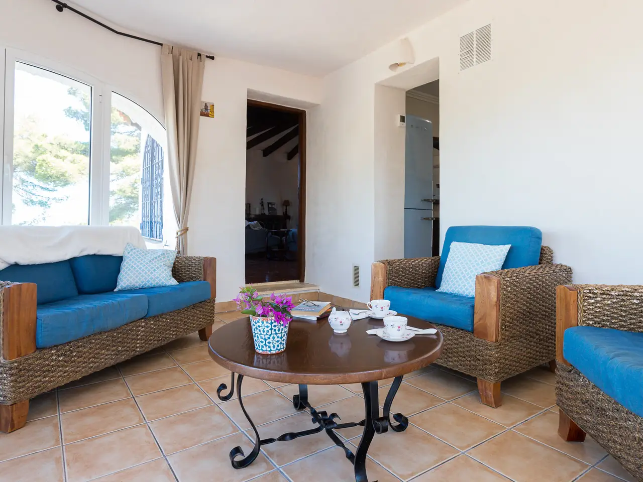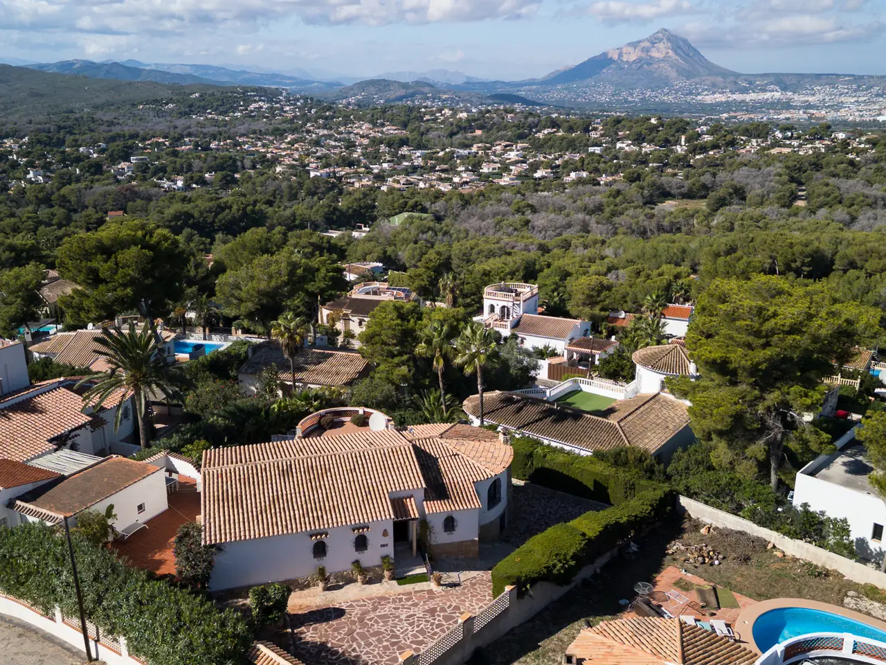 Traditional 1980s-style house with views of Montgó mountain, located in the quiet Balcón al Mar residential area, Jávea (Alicante) Spain. The main floor comprises a charming living-dining room with views of Montgó, a wood-burning fireplace, an equipped open-plan kitchen, a west-facing glazed terrace (naya) perfect for enjoying beautiful sunsets, three double bedrooms (the master with an en-suite bathroom), and a full bathroom. Also on this floor is an open terrace with a barbecue area. On the lower level, at pool level, there is a separate studio with a bedroom open to a small sitting area and the kitchen, plus a bathroom. The house is very functional, as both the main floor and the studio are accessible from the street with almost no steps. The garden features a private and pleasant pool area with tropical plants, and the plot includes ample parking for more than four vehicles. There is also a closed garage for one vehicle. Air conditioning is installed in all bedrooms and the living-dining room.