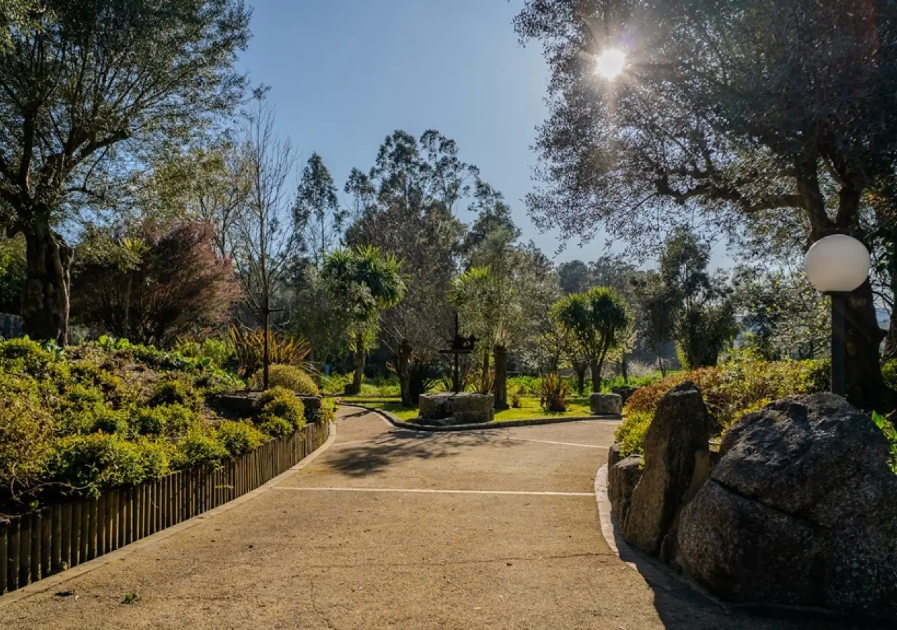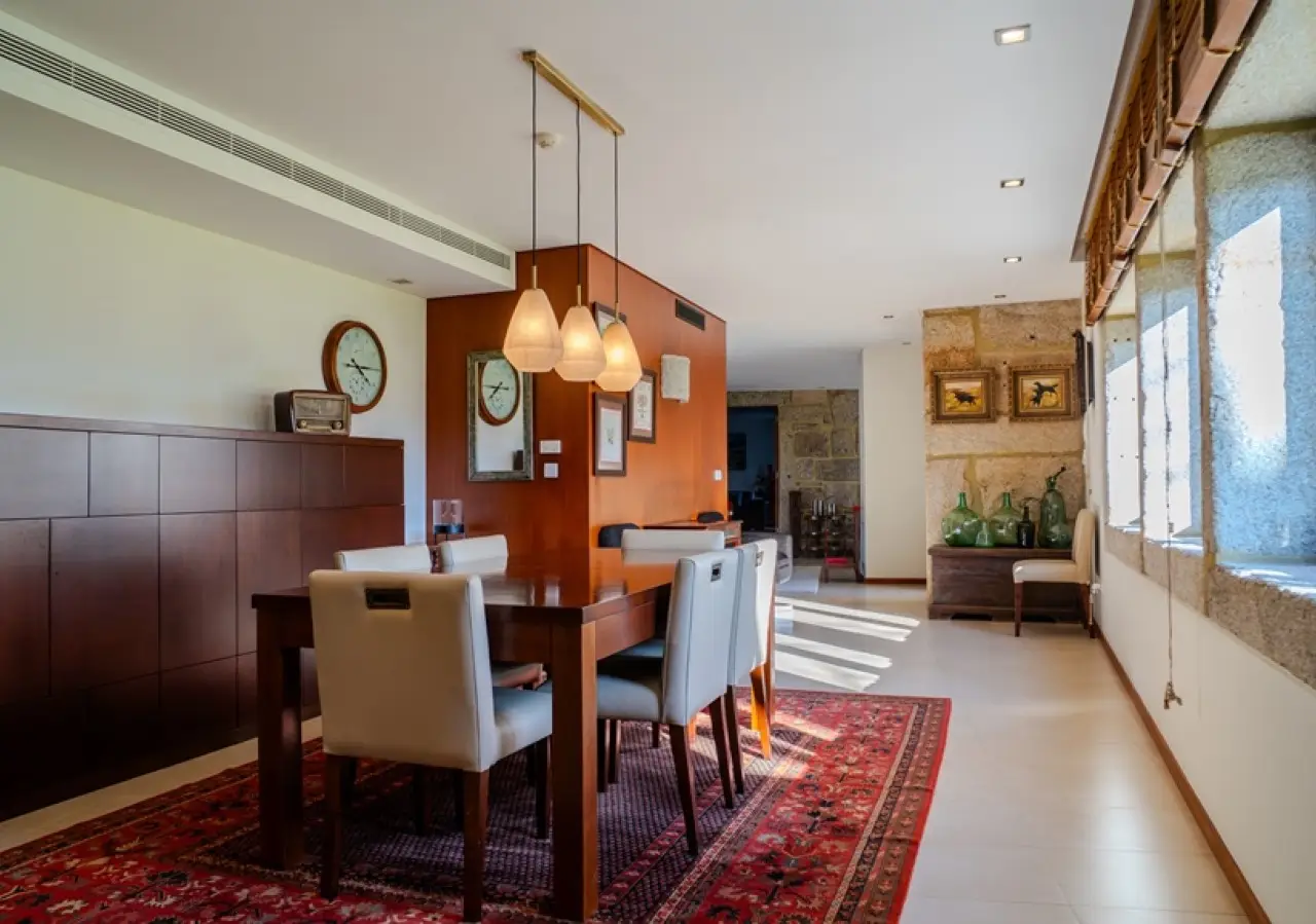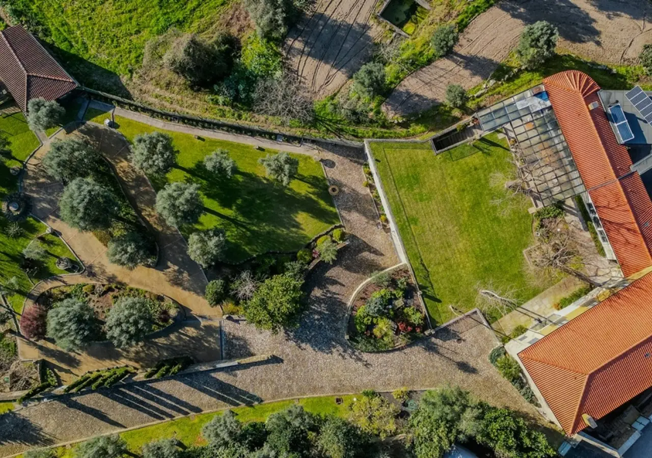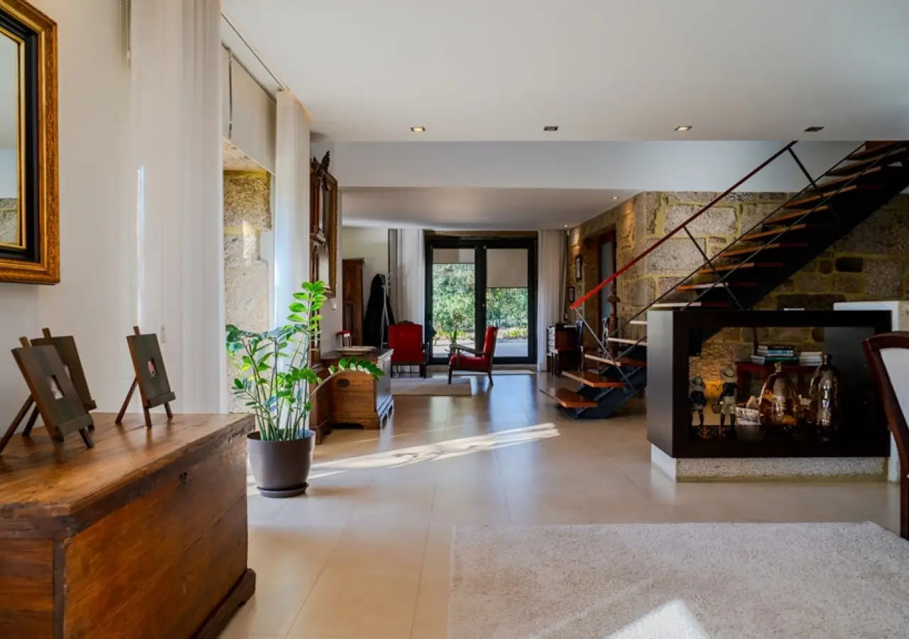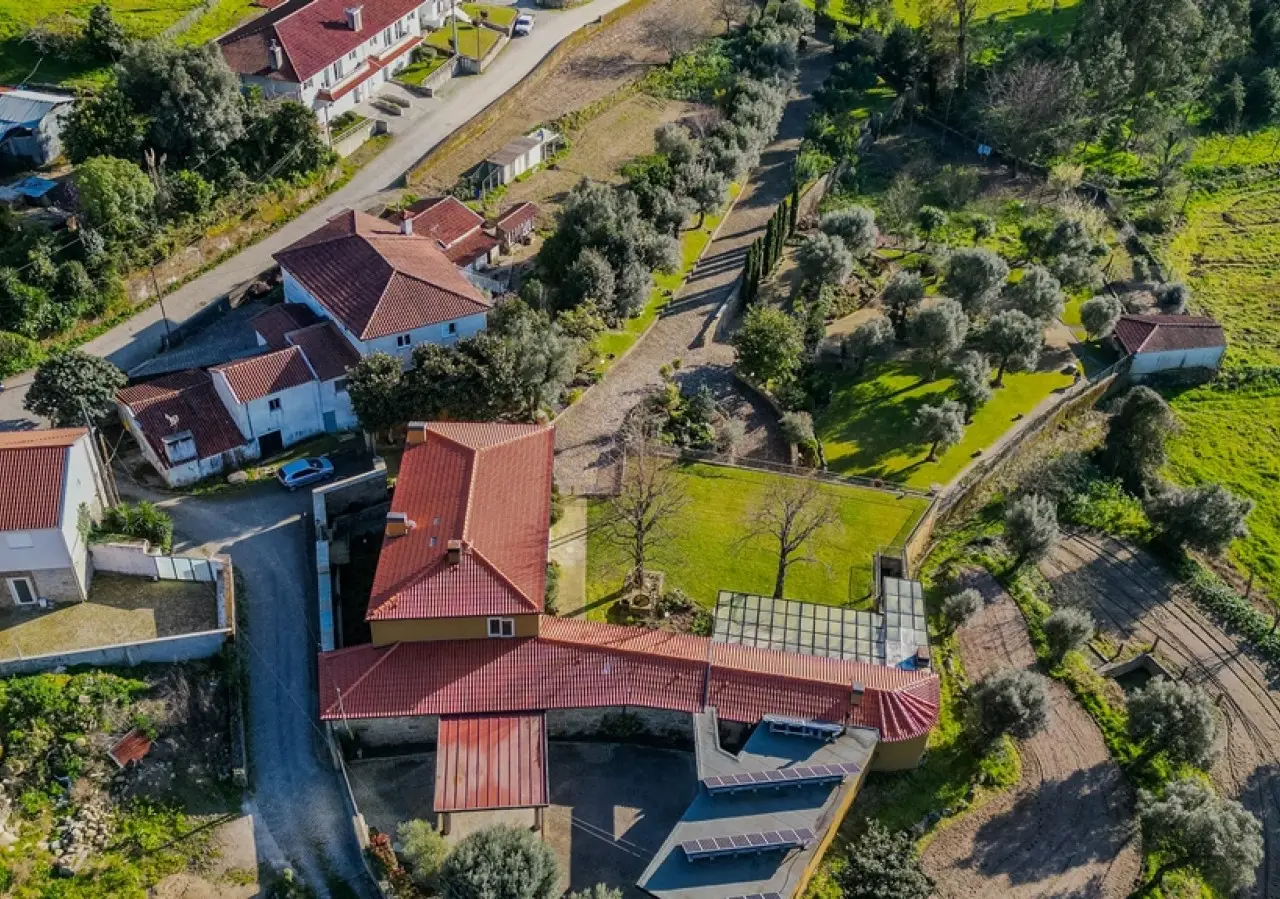 This unique villa was built with exceptional care and attention, ensuring that every space would be functional and welcoming for its residents. Every nook and cranny of this house reflects the commitment to quality and well-being, creating a perfect environment for those who value comfort and practicality in harmony with the details of wood and granite, so specific to Northern Portugal. The four bedrooms, including two suites, on the second floor offer breathtaking views over the large, green gardens, surrounded by centuries-old olive trees, and provide an atmosphere of total privacy and tranquillity. The extensive outdoor space has several different settings for you to enjoy to the full, as there are various types of trees, plants and decorative pieces that embellish this sublime bucolic setting. On the first floor you'll find another suite, a library and kitchen, as well as dining and living rooms; the house is of high quality in terms of energy efficiency, making it ideal for those looking for a home that combines functionality with elegance: a place designed for comfort, where all the spaces have been designed for communal living, with large areas in contact with each other, without compromising on aesthetics and harmony with nature. Easy access and proximity to Barcelos city center make this property even more unique. CHARACTERISTICS: Plot Area: 5 073 m2 | 54 605 sq ft Deployment Area: 455 m2 | 4 899 sq ft Building Area: 629 m2 | 6 768 sq ft Bedrooms: 5 Bathrooms: 5 Garage: 8 Energy efficiency: A+ FEATURES: Three suites; Hot and cold air conditioning by heat pump Solar panels; Photovoltaic panels.