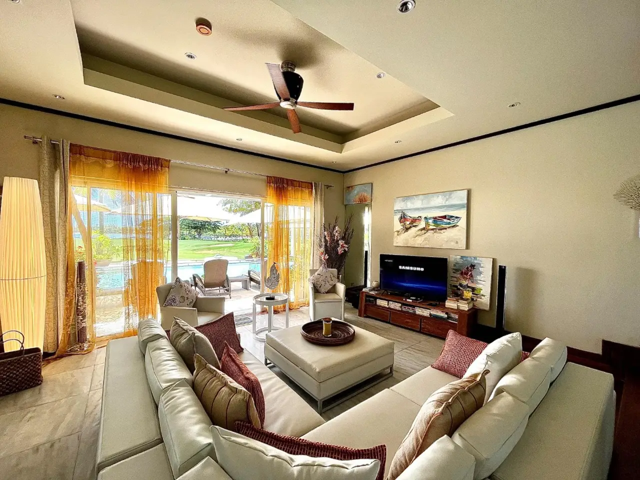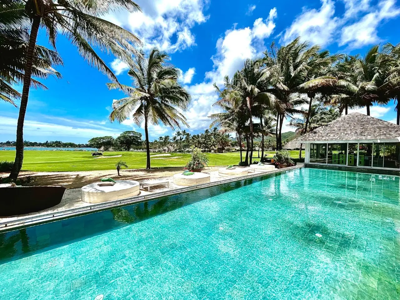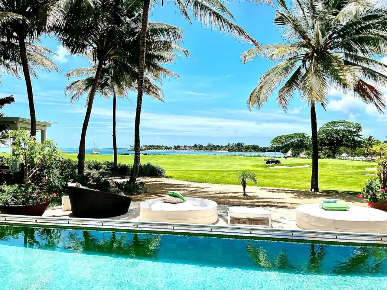 Located in the heart of a magnificent golf estate with 5 star hotel, this 4 ensuite-bedroom villa is exceptionally well positioned, offering an exclusive golf and sea view. On the ground floor, the entrance opens onto the living area comprising a dining room overlooking a television lounge opening onto the outside. A large living room with marble floors opens onto a terrace overlooking the large slate swimming pool and an extensive view of the golf course and the lagoon. A fitted kitchen and a breakfast area also opens onto the outdoor terrace. At the edge of the swimming pool, a large fitted out and closed kiosk is the ideal room to receive or relax in peace. The bedrooms section is articulated on the left wing with two large ensuite bedrooms with dressing room, the master bedroom being additionally serviced with a private lounge opening onto the garden. Upstairs, two ensuite bedrooms with shower and bath, an office area and an open terrace with outdoor lounge and a dominant view of the sea. The independent massage room completes an exceptional offer within this sea side golf resort, with tennis, restaurants, communal swimming pool, renowned 5-star hotel, and à la carte services.