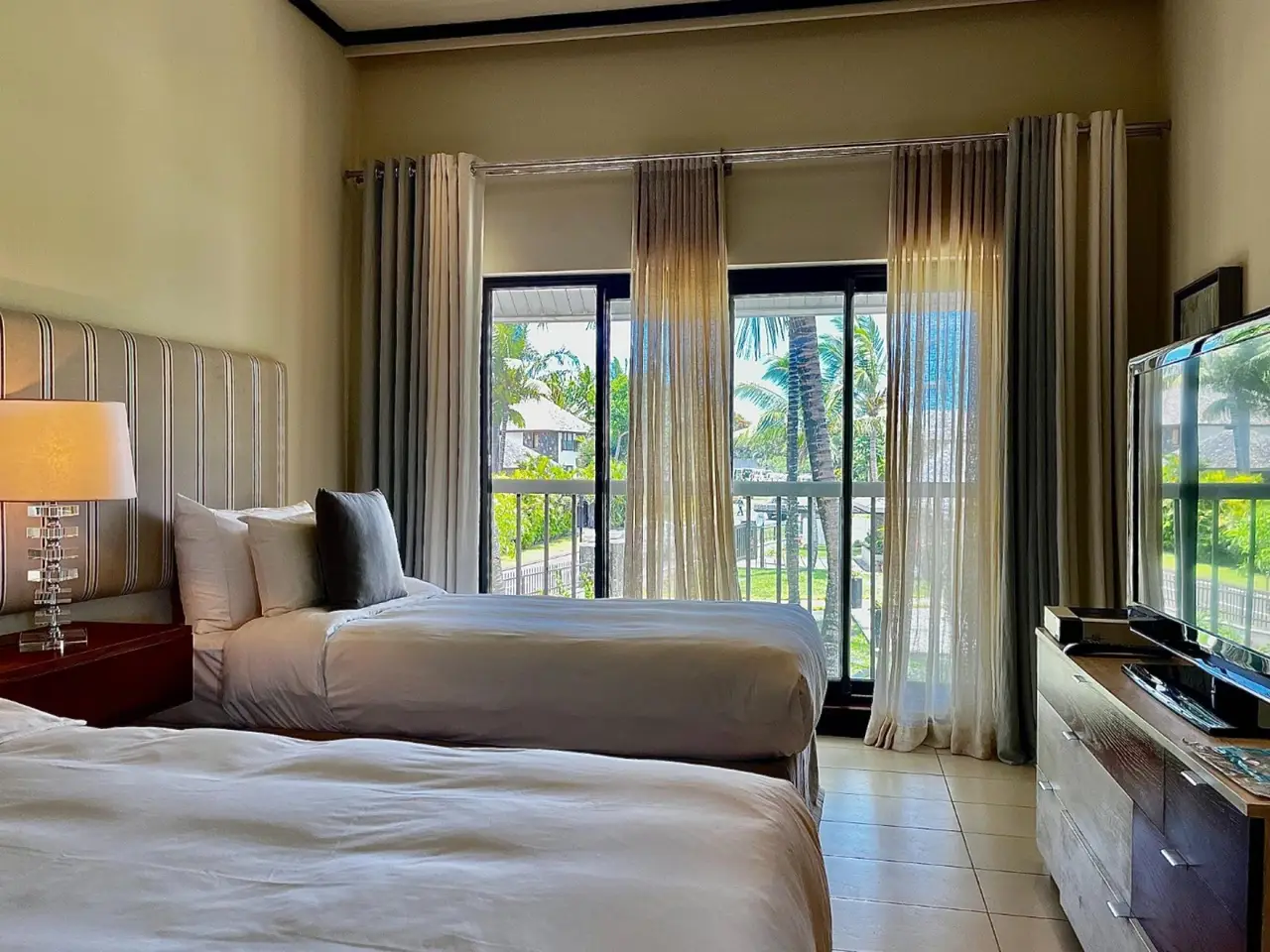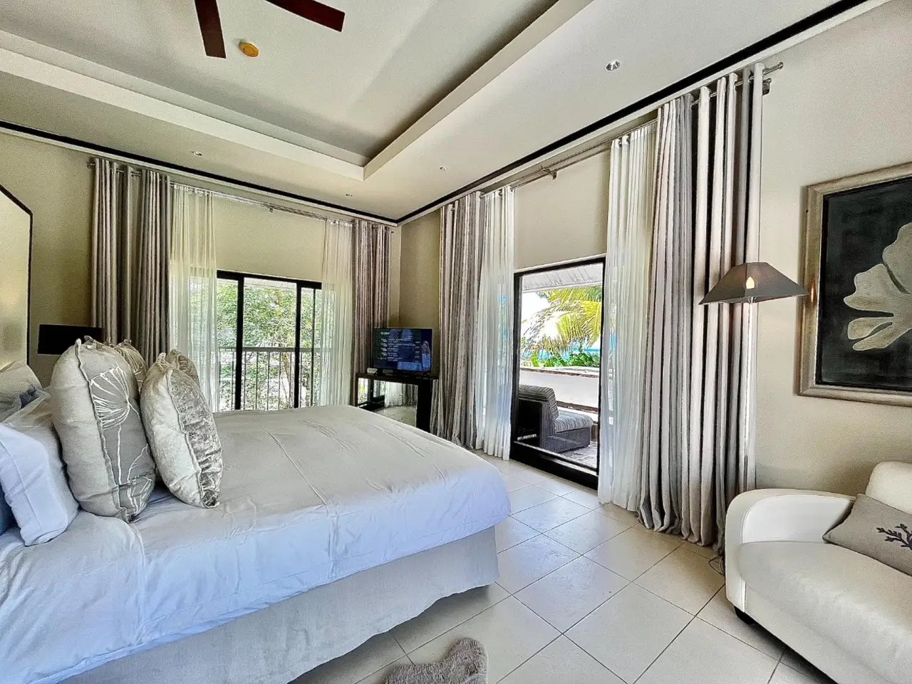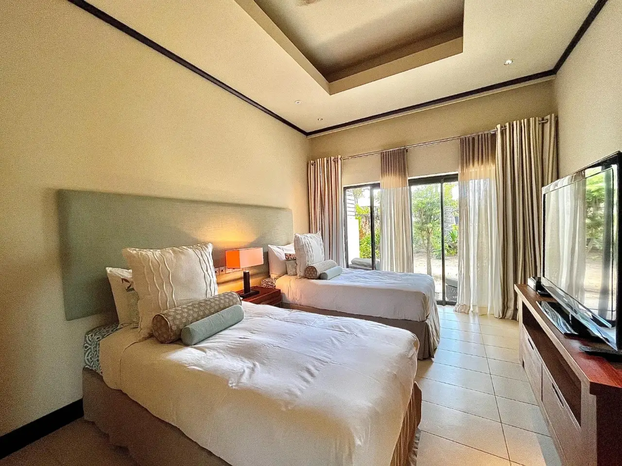 Located in the heart of a magnificent golf estate with 5 star hotel, this 4 ensuite-bedroom villa is exceptionally well positioned, offering an exclusive golf and sea view. On the ground floor, the entrance opens onto the living area comprising a dining room overlooking a television lounge opening onto the outside. A large living room with marble floors opens onto a terrace overlooking the large slate swimming pool and an extensive view of the golf course and the lagoon. A fitted kitchen and a breakfast area also opens onto the outdoor terrace. At the edge of the swimming pool, a large fitted out and closed kiosk is the ideal room to receive or relax in peace. The bedrooms section is articulated on the left wing with two large ensuite bedrooms with dressing room, the master bedroom being additionally serviced with a private lounge opening onto the garden. Upstairs, two ensuite bedrooms with shower and bath, an office area and an open terrace with outdoor lounge and a dominant view of the sea. The independent massage room completes an exceptional offer within this sea side golf resort, with tennis, restaurants, communal swimming pool, renowned 5-star hotel, and à la carte services.