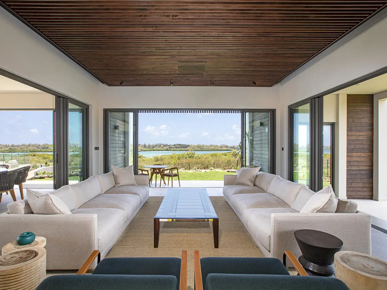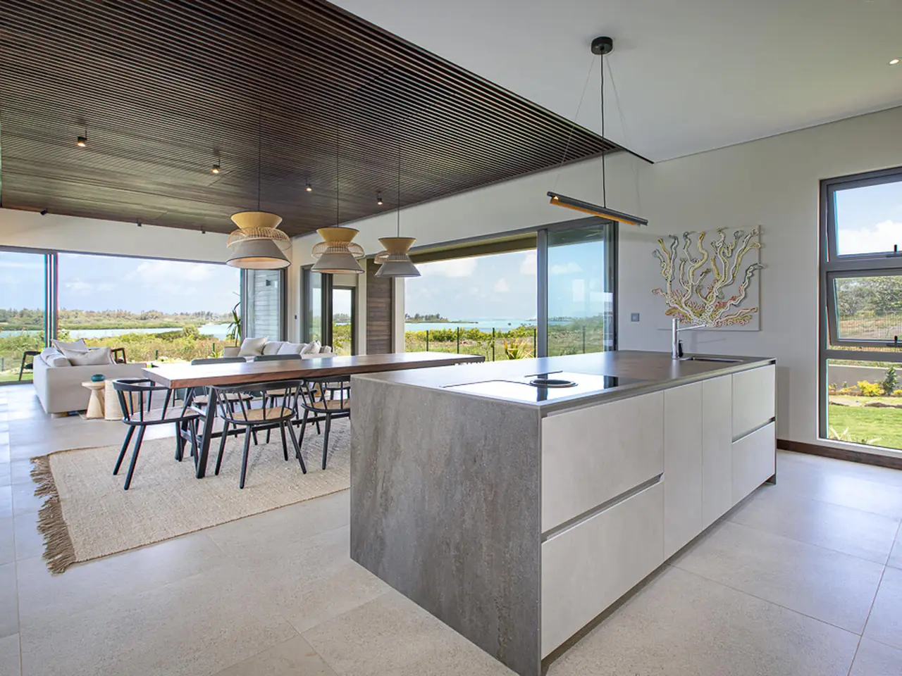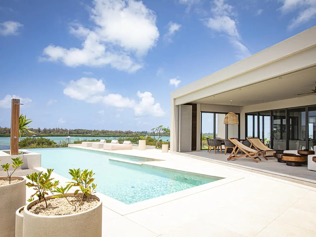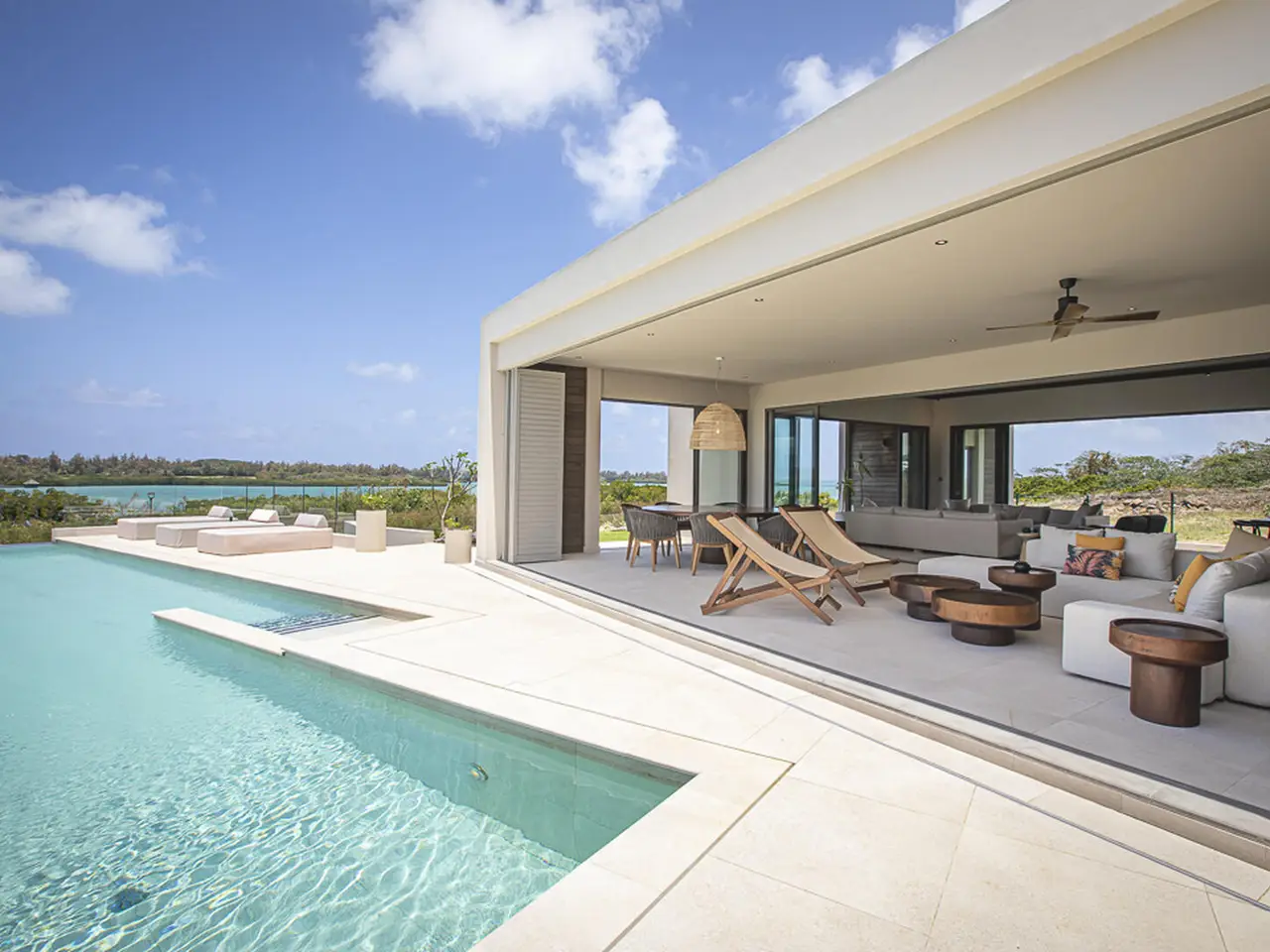 Perched gracefully on a generous 2,079 m² down-slope plot in the coveted Rive Est neighborhood of Anahita, this newly built 445 m² villa is a statement of refined island living. Nestled among the northern parcels and just moments from the lush tropical gardens of Rive Est Park, with its private pontoon offering effortless passage to the turquoise lagoon, the property embodies the very essence of exclusivity and sophistication. Every element of its architecture embraces the land’s natural contours, allowing each space to frame mesmerising vistas of the shimmering lagoon and the legendary Île aux Cerfs. On the upper level, sunlight dances across a bright, open living and dining area, where an elegant kitchen flows onto a wide terrace. Here, an infinity pool appears to melt into the horizon, while a barbecue and bar set the stage for effortless soirées. A stylish TV lounge with integrated office space and a generously proportioned en-suite bedroom complete this refined space. Descending to the garden level, three serene en-suite bedrooms open directly onto manicured tropical grounds, where the scent of frangipani drifts in the air. Discreet storage solutions ensure both practicality and elegance remain in perfect harmony. Infused with the charm of chic tropical décor and finished to the highest standards, this villa is more than a home—it is a gateway to Anahita’s celebrated coastal lifestyle, where each day is bathed in light, framed by sea, and defined by pure tranquility.
