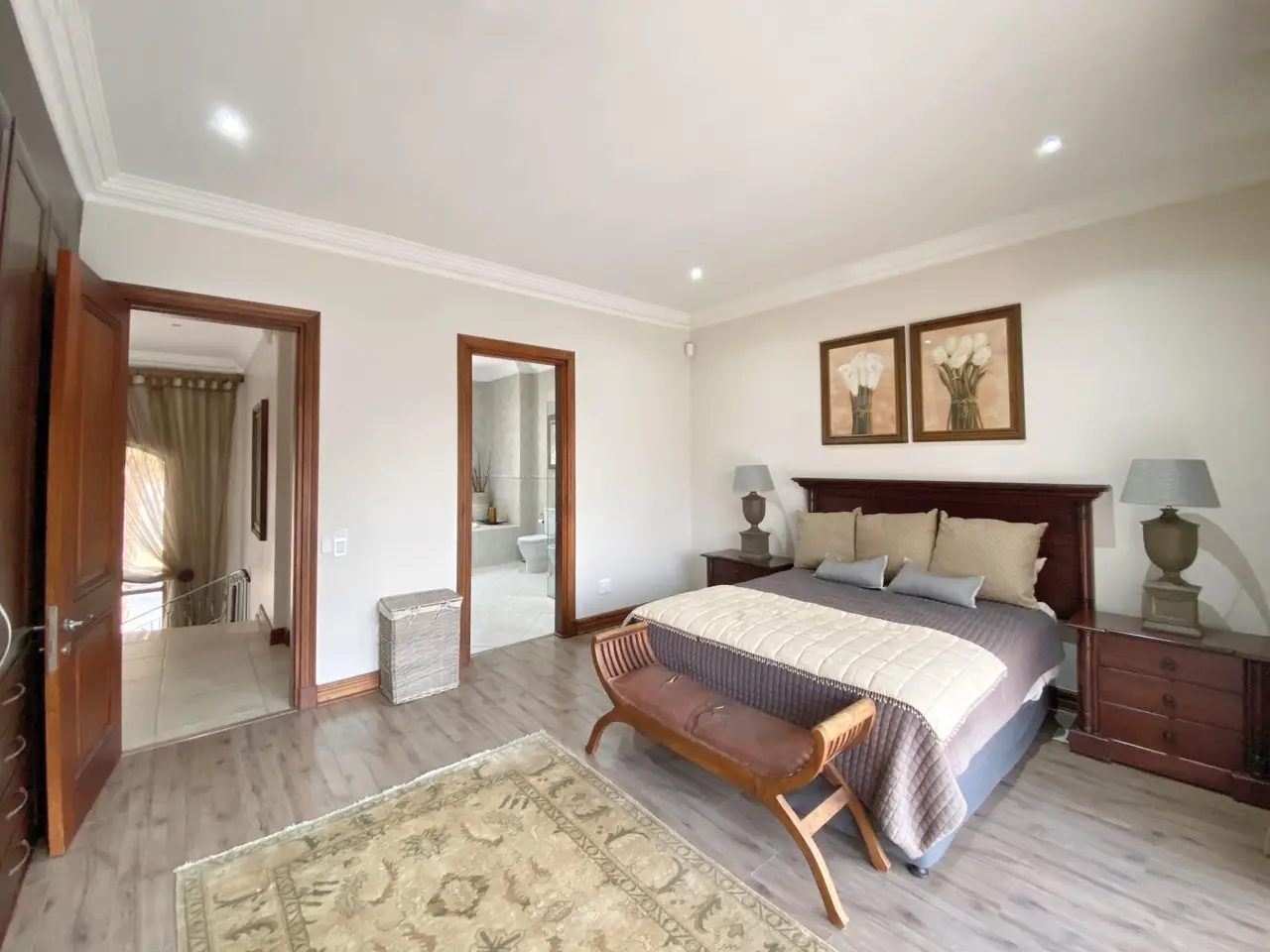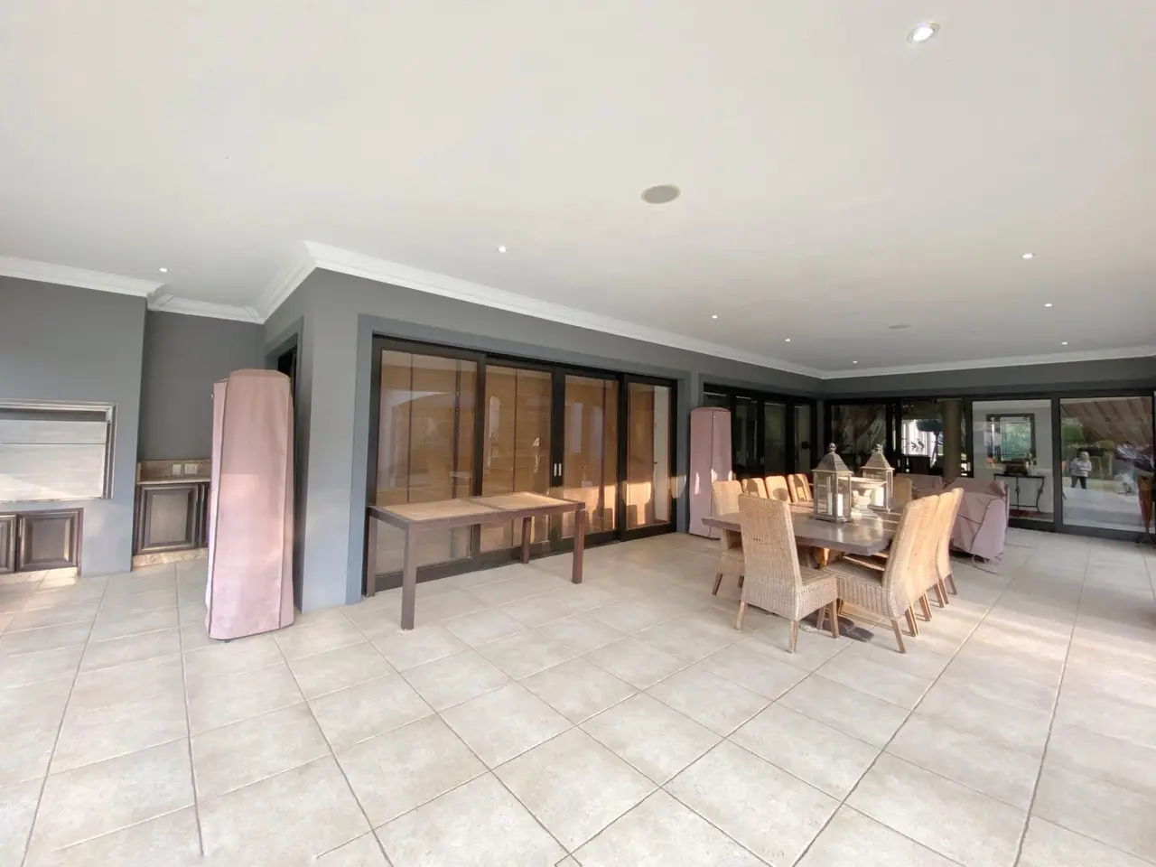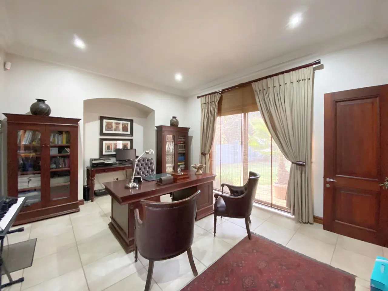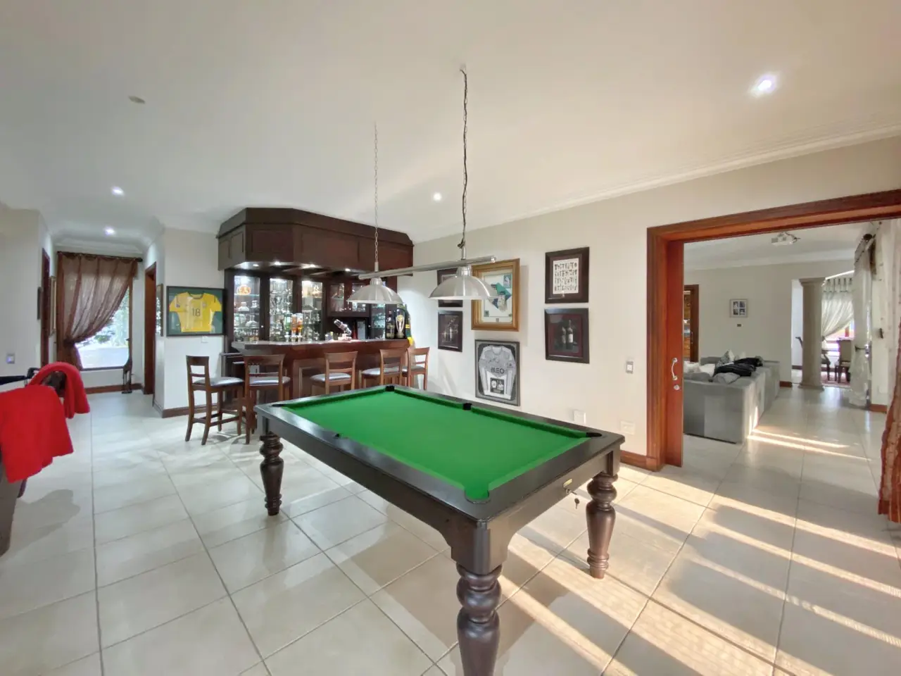 Ideally located in a peaceful location, this generous family residence features an immaculate interior with proportions to delight the growing family who love to entertain! Welcome your family through a brightly-lit entrance hall featuring bridal staircase and windows showcasing the expansive garden views. The entrance leads onto one of 3 lounges complimented with a marble fireplace and leading to a study/5th bedroom with separate bathroom. The second lounge will delight the entertainer as it features a projector and projector screen with doors which open onto the covered patio complete with built-in gas braai. The third lounge forms part of the entertainment wing and also features a fitted gentlemanGÇÖs bar and bathroom.The solid wood kitchen presents warm finishes complimented with Quartz tops, chrome finishes, a separate scullery PLUS laundry room. The kitchen also offers a combination of an electric and gas stove and the peace-of-mind of being connected to the backup generator. The home is solar-powered and also features a backup water tank with pump! With automated garaging for cars, staff accommodation and excellent security, this home will delight the growing family.