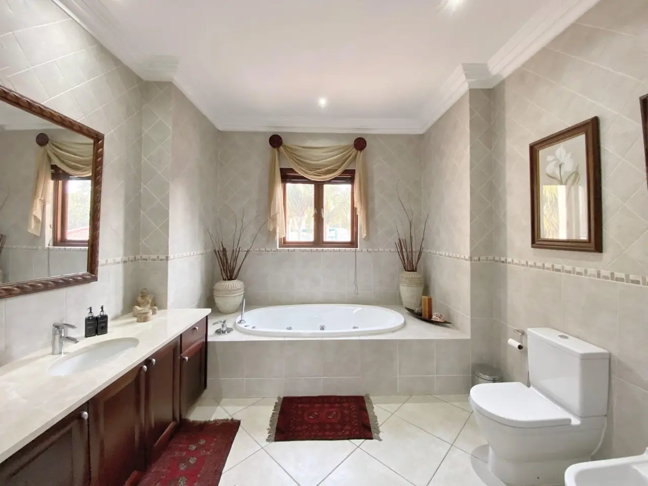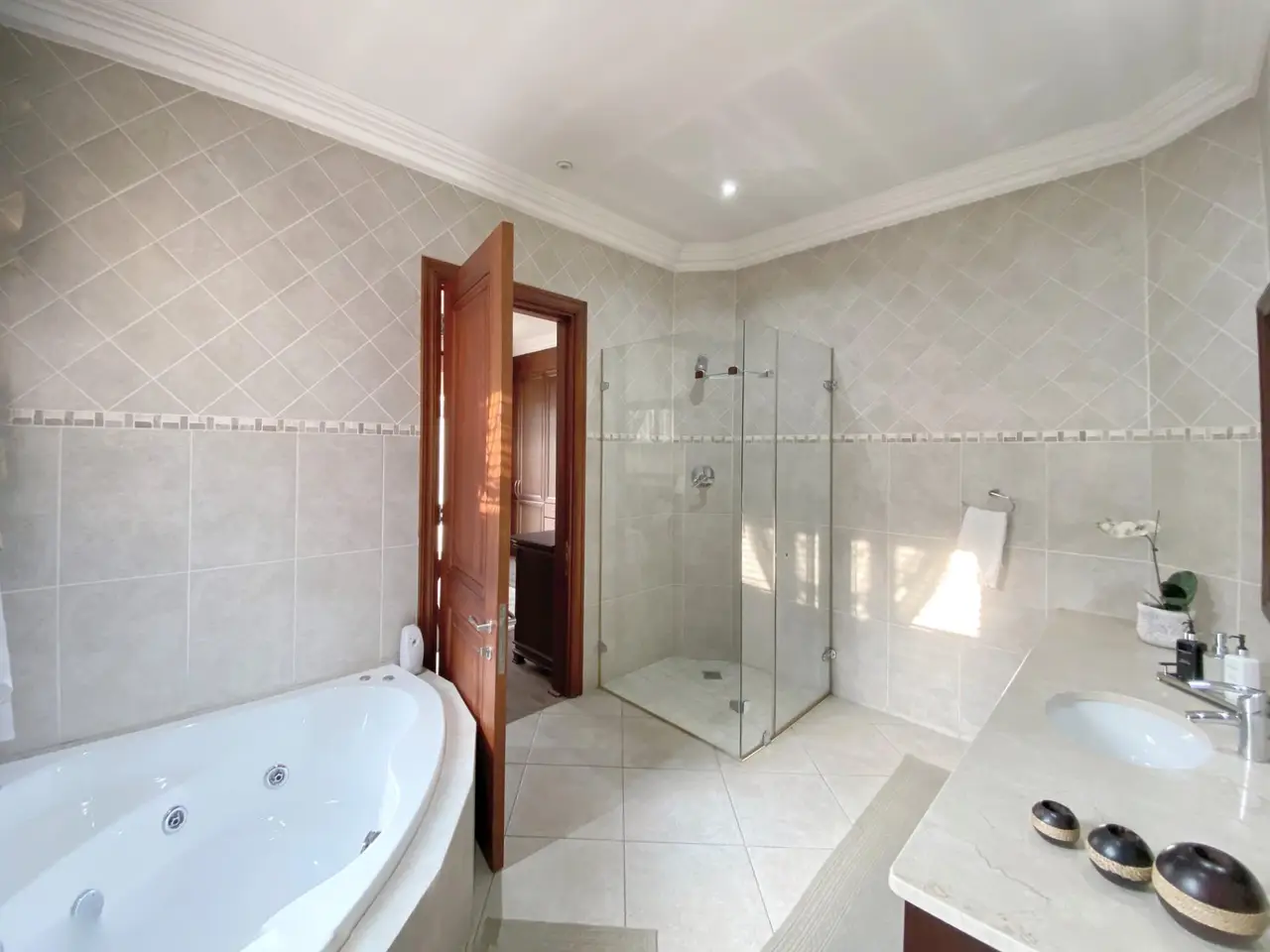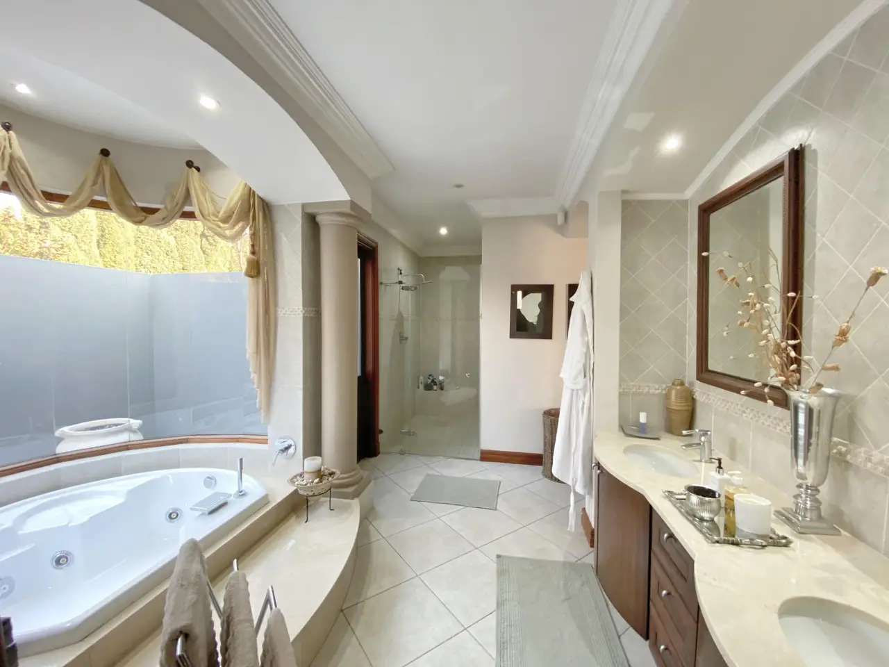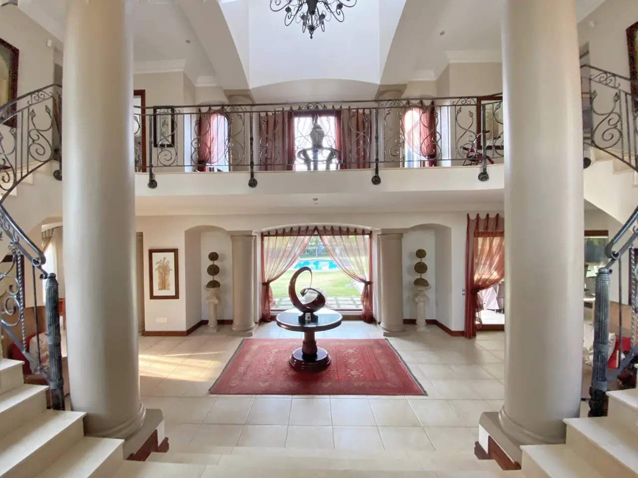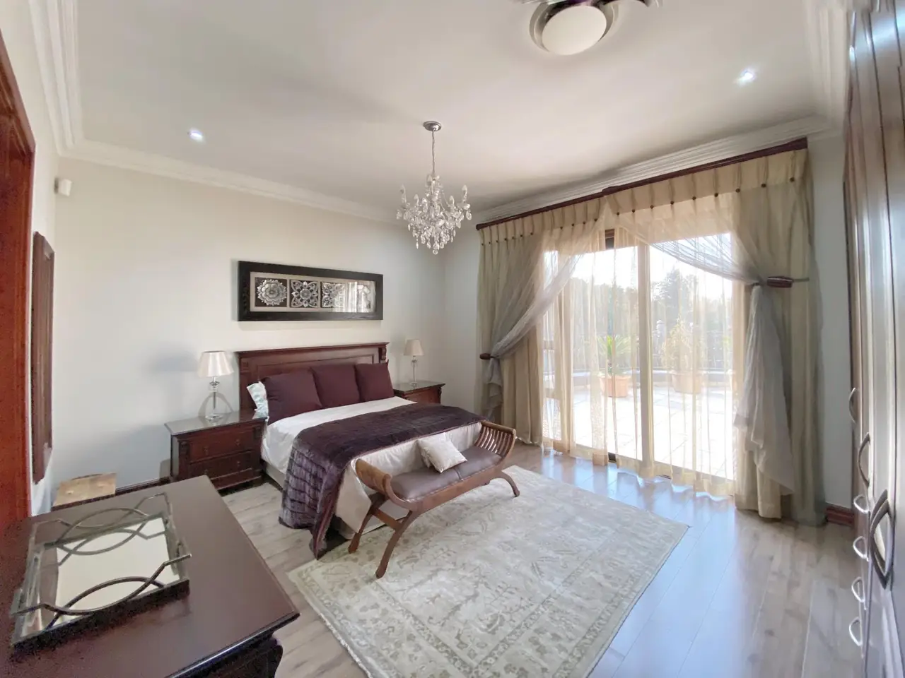 Ideally located in a peaceful location, this generous family residence features an immaculate interior with proportions to delight the growing family who love to entertain! Welcome your family through a brightly-lit entrance hall featuring bridal staircase and windows showcasing the expansive garden views. The entrance leads onto one of 3 lounges complimented with a marble fireplace and leading to a study/5th bedroom with separate bathroom. The second lounge will delight the entertainer as it features a projector and projector screen with doors which open onto the covered patio complete with built-in gas braai. The third lounge forms part of the entertainment wing and also features a fitted gentlemanGÇÖs bar and bathroom.The solid wood kitchen presents warm finishes complimented with Quartz tops, chrome finishes, a separate scullery PLUS laundry room. The kitchen also offers a combination of an electric and gas stove and the peace-of-mind of being connected to the backup generator. The home is solar-powered and also features a backup water tank with pump! With automated garaging for cars, staff accommodation and excellent security, this home will delight the growing family.
