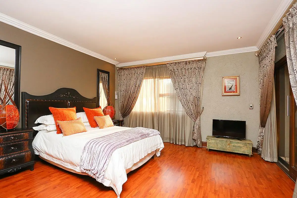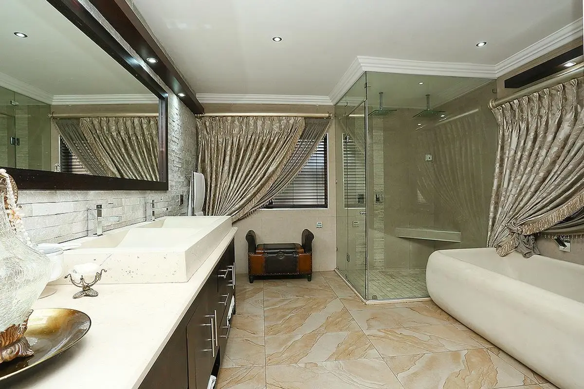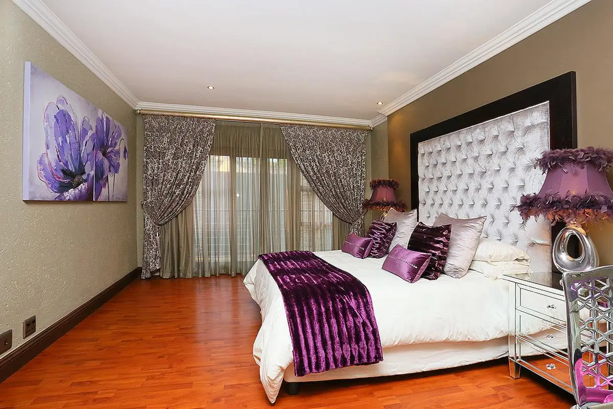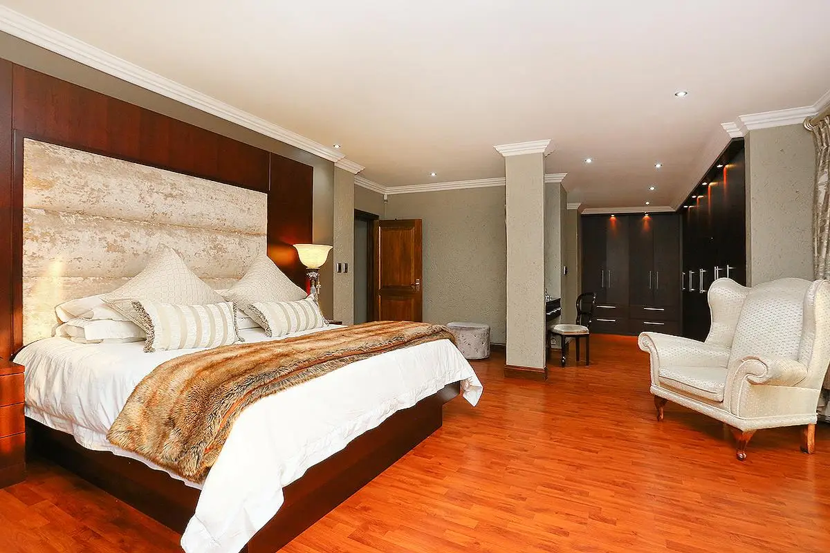 Ardently designed for the luminous flow of light and space, reflecting expertise in every room, this palatial double storey family residence boasts excellent security in Bedfordview's finest position with state-of-the-art finishes and appliances throughout! The spectacular architectural design with contrasting tones further enhance the tranquil and majestic features of this grand delight. Featuring soaring ceilings, expansive finely-honed receptions fit for the elite family, a fitted gentleman's bar, an awe-inspiring kitchen and grand entertainment wing leading onto a warm, Eastern-inspired deck with opulent balconies abound. The entrance hall leads onto a spacious, open-plan living areas which includes 3 living areas, a double volume dining room, enclosed entertainment wing with fitted, upmarket bar with eye-catching lighting, and a warm, welcoming kitchen fit for a gourmet chef. There are 6 spacious bedrooms with 4 en-suite bathrooms each with modern bathrooms and chrome finishes. The separate wine cellar will further delights the growing family with a sparkling pool and private pagola entertainment area to sip sundowners from. There are also newly-installed double inverters with backup batteries for uninterrupted power supply as an optional extra to be negotiated. With automated garaging for 4 cars plus additional open parking set on secure surrounds, this residence is one for the family's luxury portfolio and sophisticated eye!