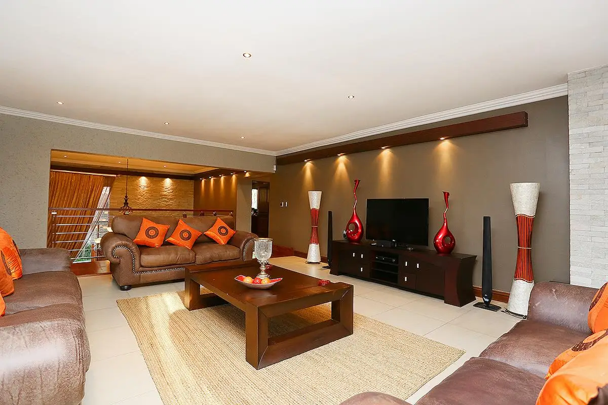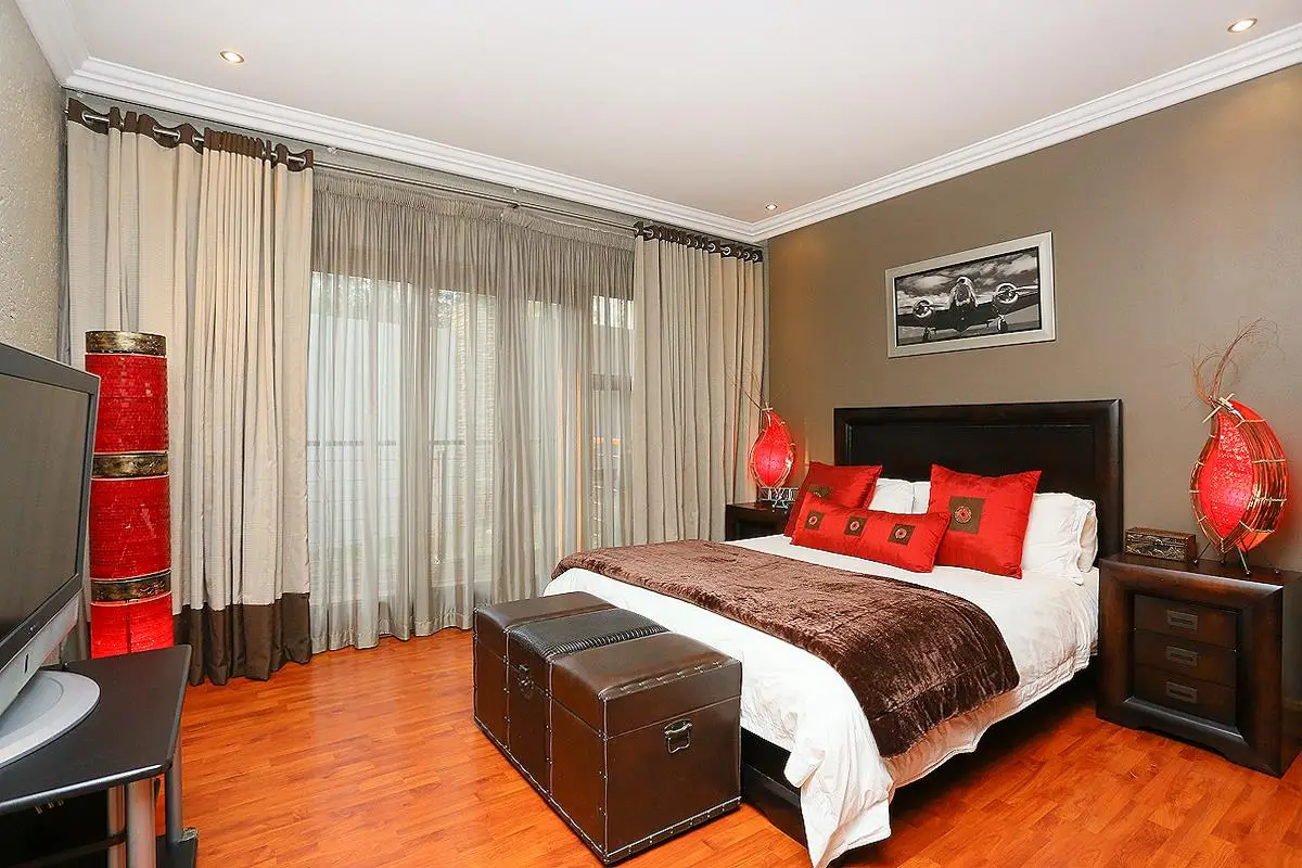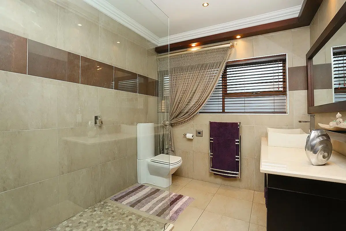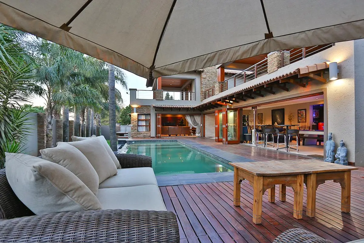 Ardently designed for the luminous flow of light and space, reflecting expertise in every room, this palatial double storey family residence boasts excellent security in Bedfordview's finest position with state-of-the-art finishes and appliances throughout! The spectacular architectural design with contrasting tones further enhance the tranquil and majestic features of this grand delight. Featuring soaring ceilings, expansive finely-honed receptions fit for the elite family, a fitted gentleman's bar, an awe-inspiring kitchen and grand entertainment wing leading onto a warm, Eastern-inspired deck with opulent balconies abound. The entrance hall leads onto a spacious, open-plan living areas which includes 3 living areas, a double volume dining room, enclosed entertainment wing with fitted, upmarket bar with eye-catching lighting, and a warm, welcoming kitchen fit for a gourmet chef. There are 6 spacious bedrooms with 4 en-suite bathrooms each with modern bathrooms and chrome finishes. The separate wine cellar will further delights the growing family with a sparkling pool and private pagola entertainment area to sip sundowners from. There are also newly-installed double inverters with backup batteries for uninterrupted power supply as an optional extra to be negotiated. With automated garaging for 4 cars plus additional open parking set on secure surrounds, this residence is one for the family's luxury portfolio and sophisticated eye!