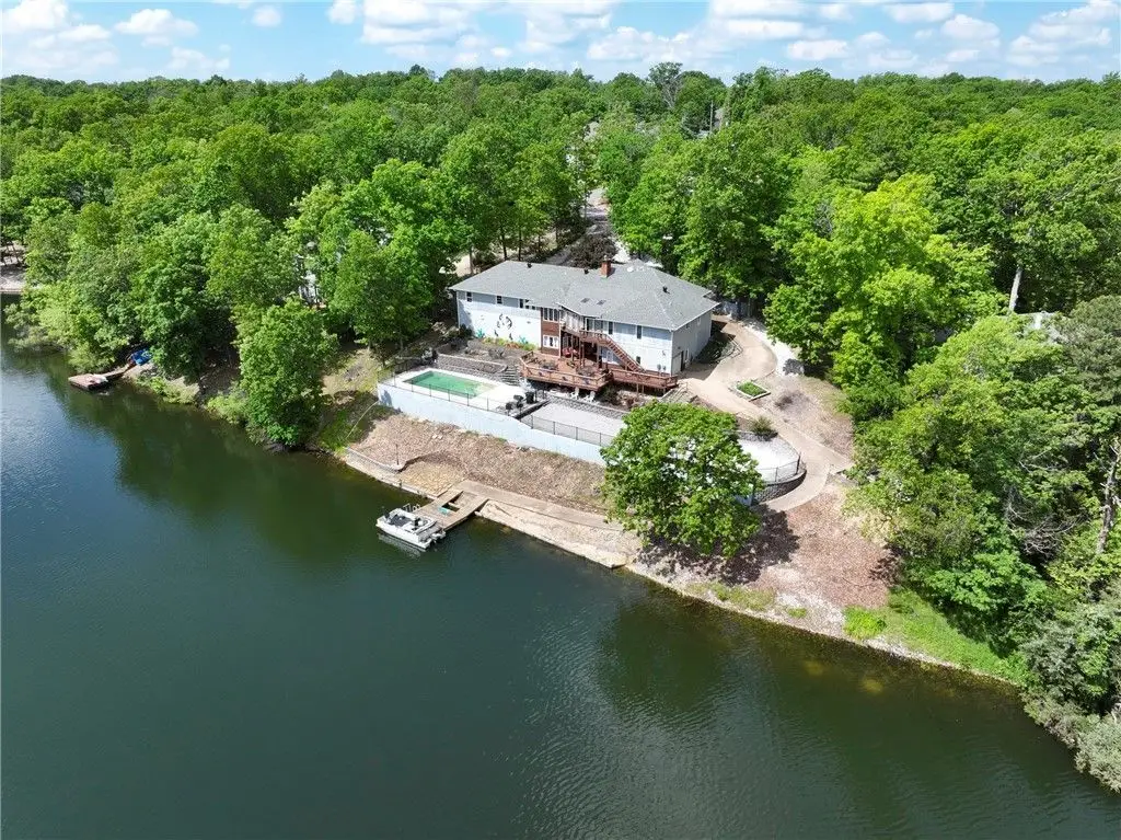 Beautiful lakefront home w/private dock access, fenced in-ground pool & approx 3,866 SF of living space! Located on a cul-de-sac in Bella Vista, this 4BD/3.5BA home offers a full kitchen & living area on both levels, ideal for multi-gen living or entertaining. Master suite features jetted tub & walk-in shower. All upstairs BRs have walk-in closets. Main floor is handicap accessible. Includes wet bar, sunroom w/ skylights, hardwood/tile/carpet flooring, gas & pellet fireplaces, attic storage, built-ins, & washer/dryer hookups up & down. Convection gas range upstairs, electric range downstairs. 2-car attached garage + golf cart garage. Beautiful landscaping, 2 rear decks (wood & flagstone) overlooking Lake Brittany.