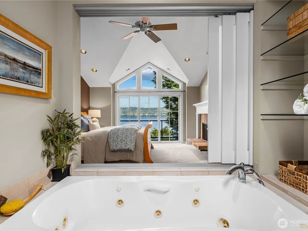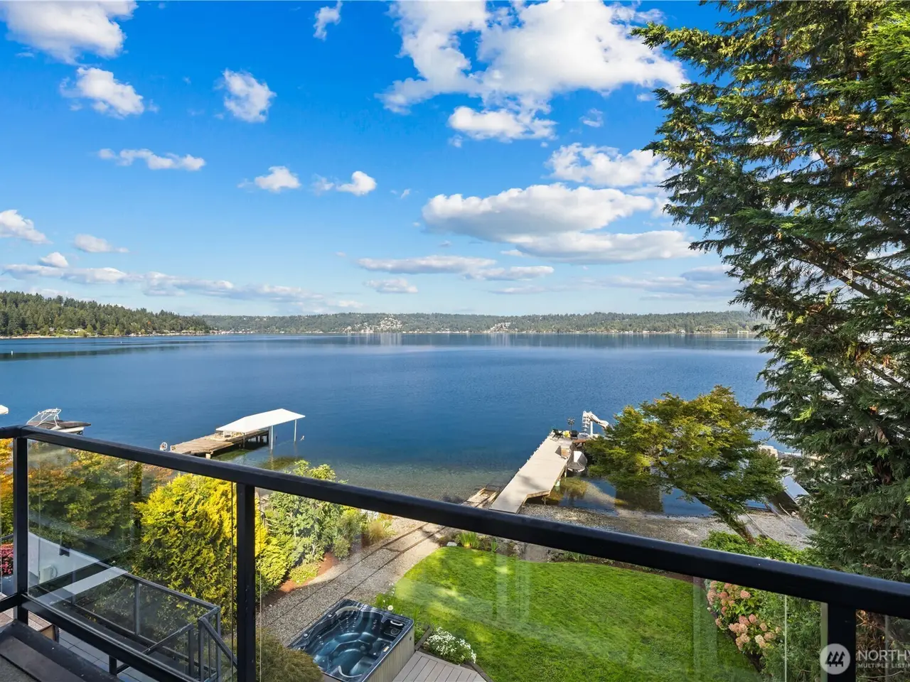 Nestled on 50 feet of lakefront, this Baylis Architects home, remodeled in 2004, turns everyday living into lakeside adventure. Launch from the dock or soak in the hot tub as golden sunlight dances across the water. Blooming hydrangeas and fruit trees frame a vibrant lawn alive with natural beauty. With granite counters and a farmhouse sink, the open kitchen flows toward the deck for sunset cocktails overlooking shimmering water. Upstairs, the primary suite with fireplace and jetted tub offers serene retreat. A bonus room with wet bar and wine cellar invites entertaining. Steps away, a 3-car garage hosts a charming ADU with loft, while a rare boathouse with functional tram houses your boat, completing this extraordinary waterfront lifestyle.